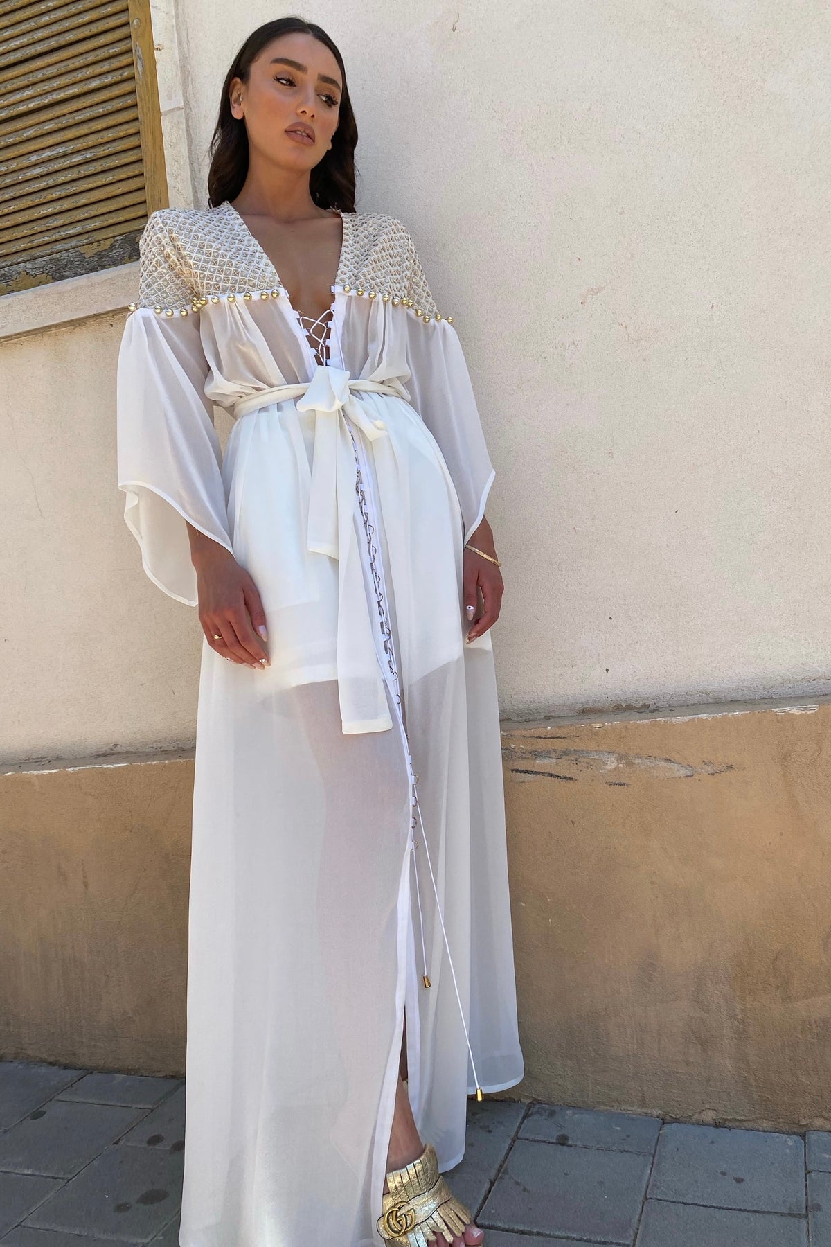 שמלת מקסי מבד רך עם עיטורים בחלקה העליון בעבודת יד