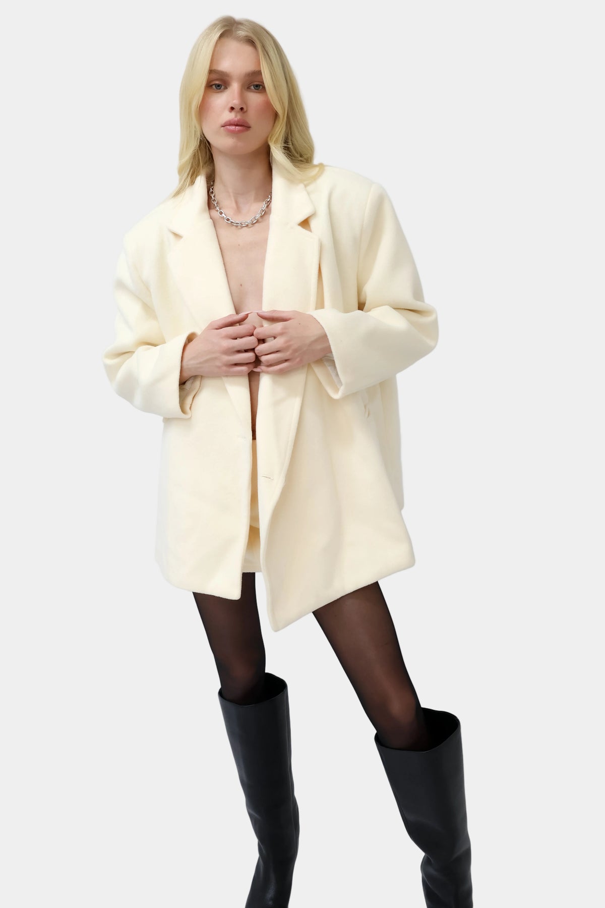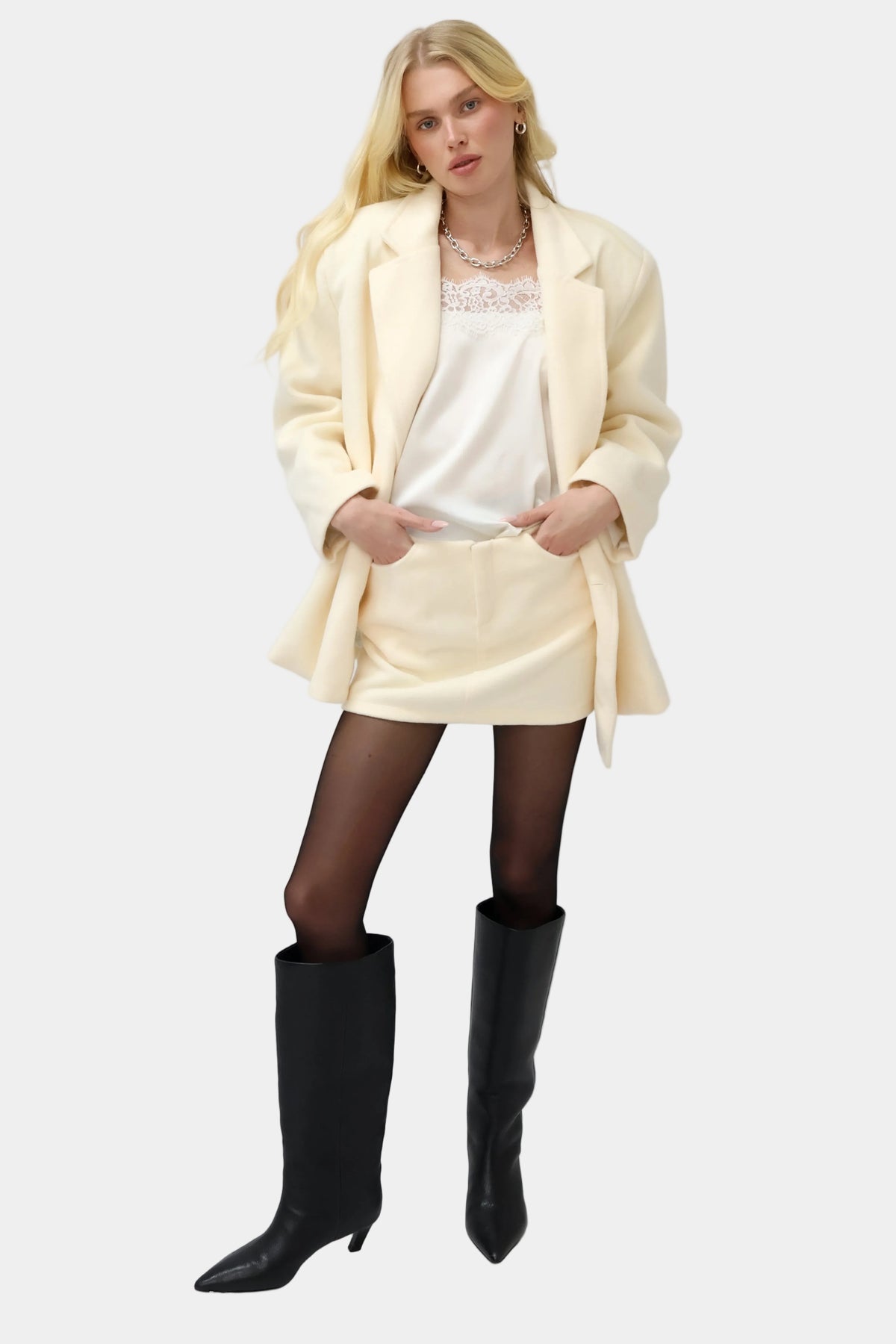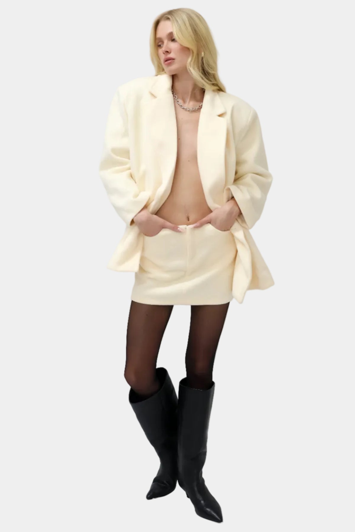 חליפה מחויטת עם ז’קט קלאסי וחצאית מיני תואמת למראה אלגנטי ונקי.