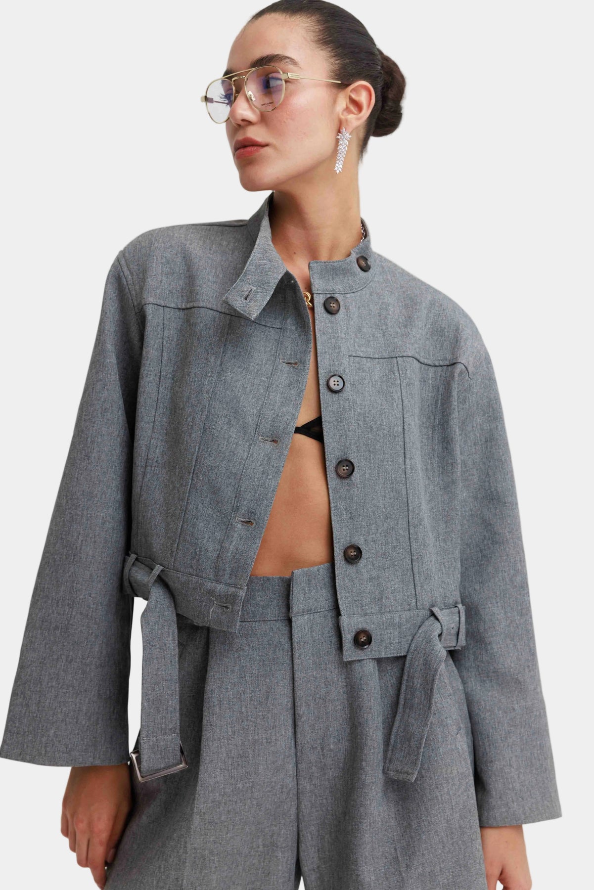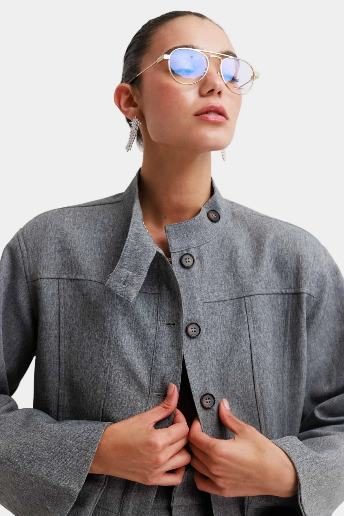 חליפה בגזרה משוחררת עם ז’קט קצר ומכנסי ברמודה רחבים למראה מודרני ונקי.