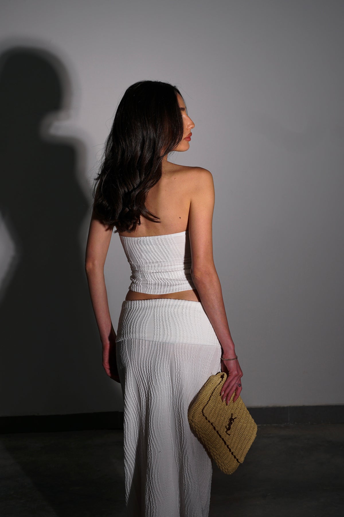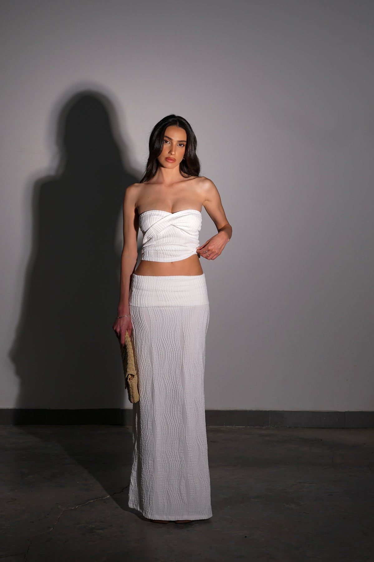 חליפת שני חלקים עם קטסטורה מחורצת עשוייה מבד קליל לייקרה סריג עם קווים גאומטריים עדינים חלק עליון טופ סטרפלס עם טוויסט מקדימה בחזה | חלק תחתון חצאית מקסים נמוכה במראה קליל ומדוייקת קיימת בצבעים: לבן-שחורמידות: S 34-36 M 36-38