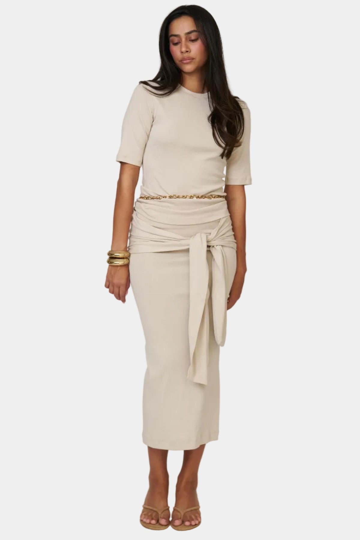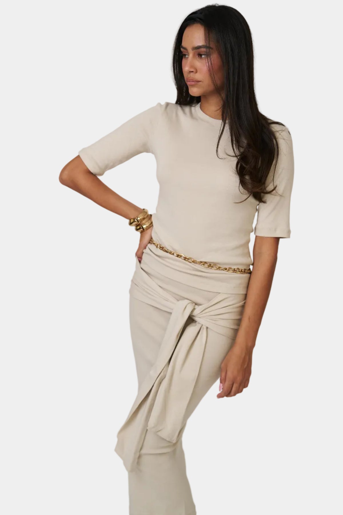 חליפת חצאית בגזרה נקייה עם טופ תואם, קשירה בצד ומראה אלגנטי ומדויק.