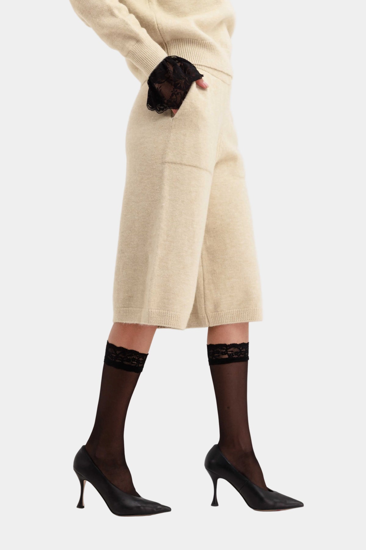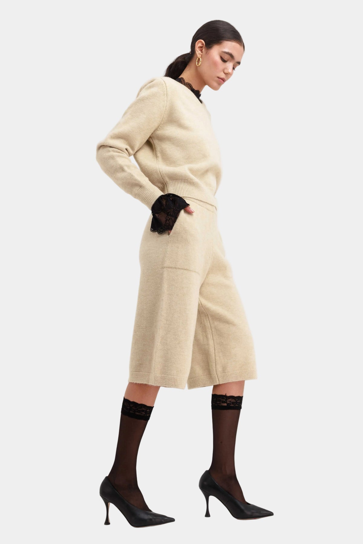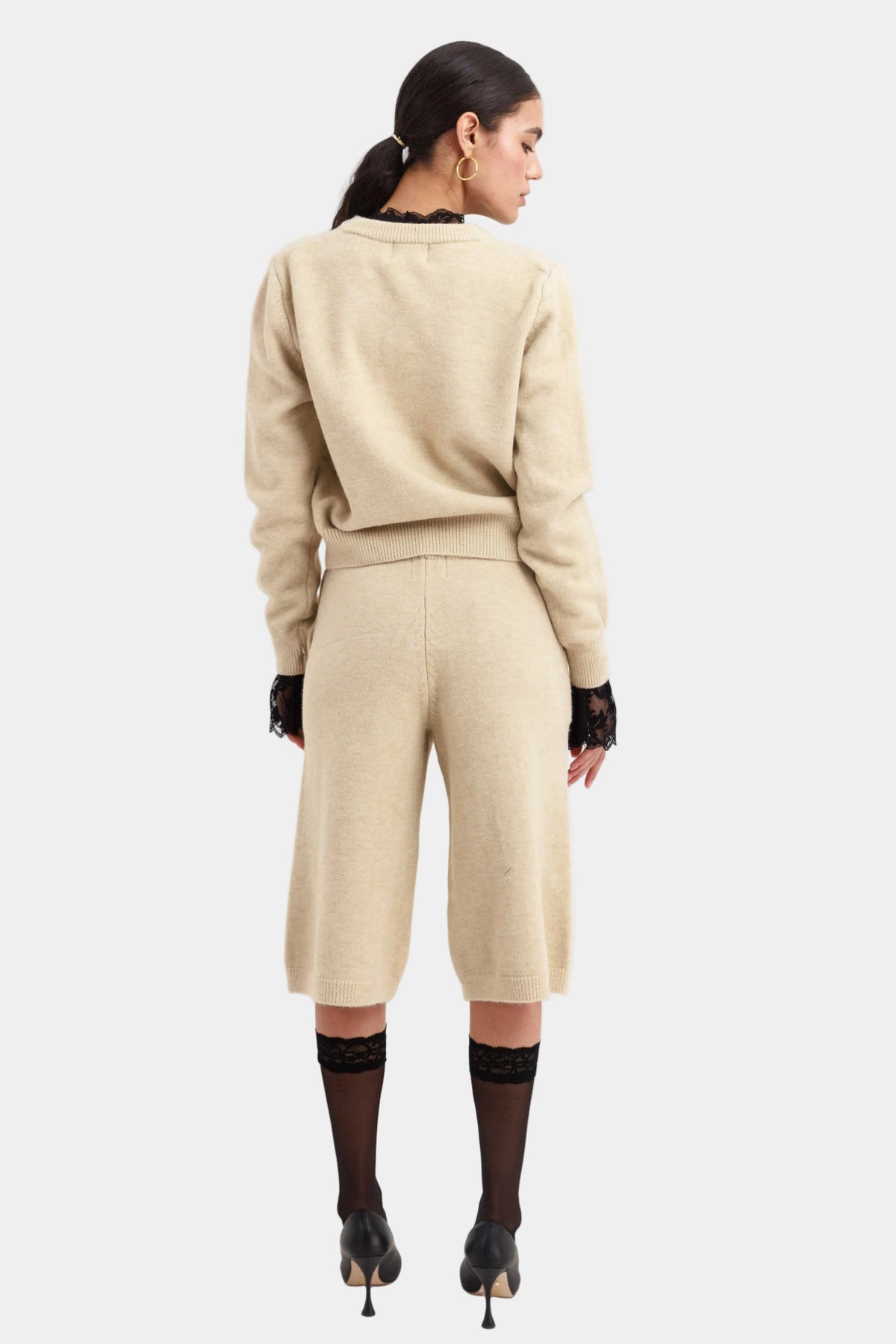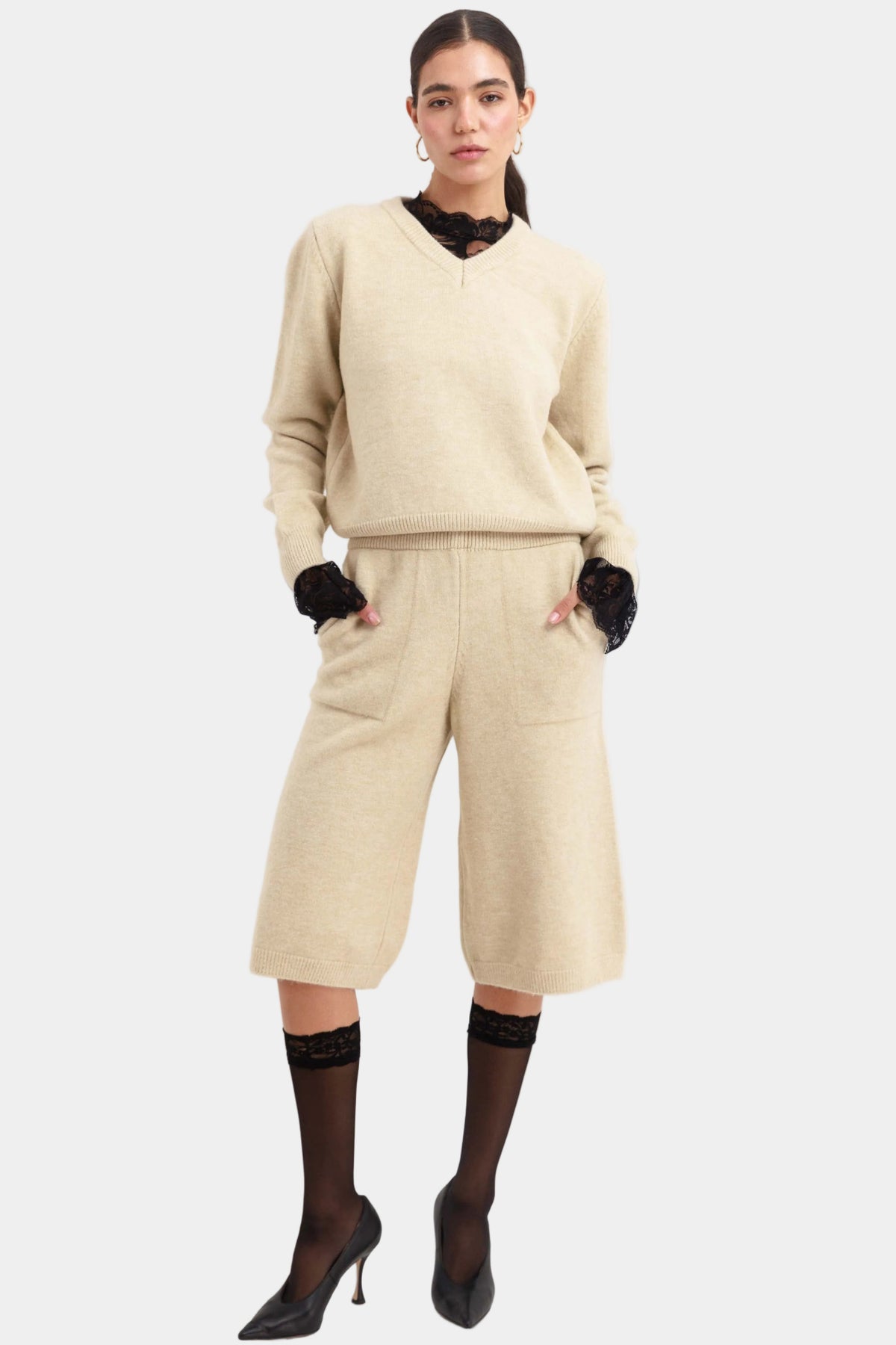 חליפת סריג רכה בגזרה משוחררת עם סוודר צווארון וי ומכנסי ברמודה תואמים למראה נקי ואלגנטי.