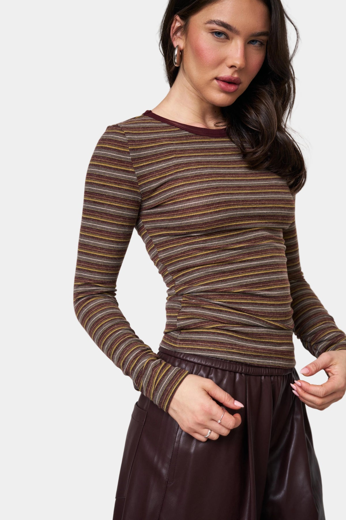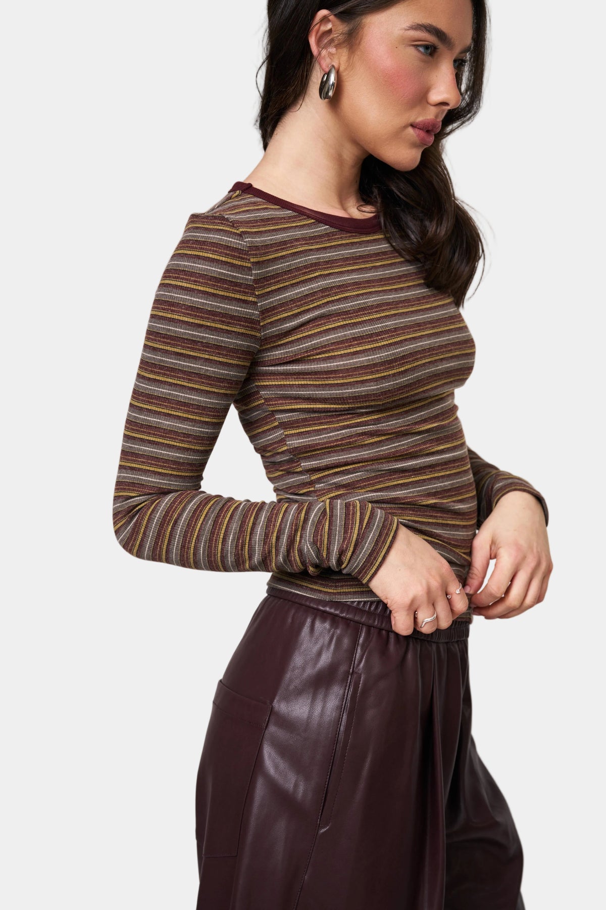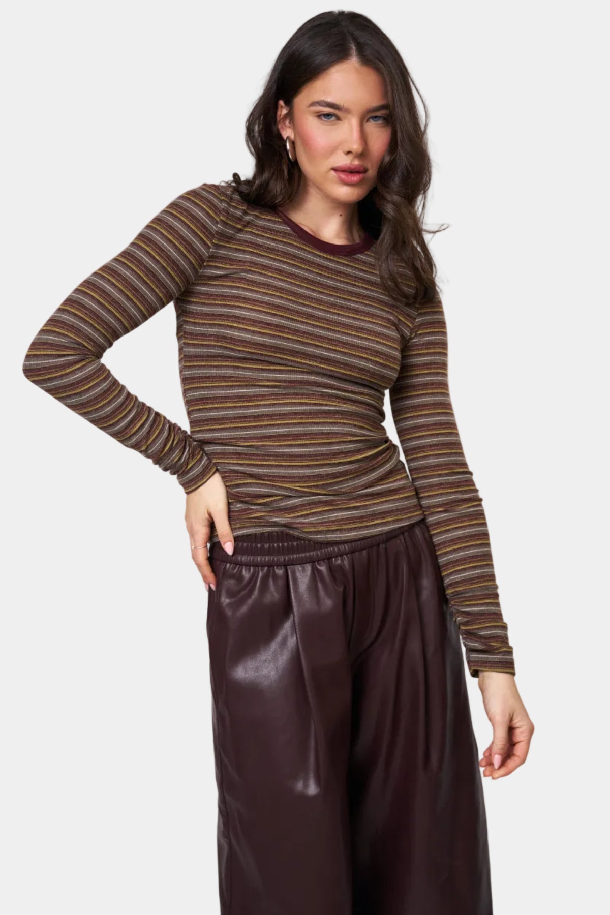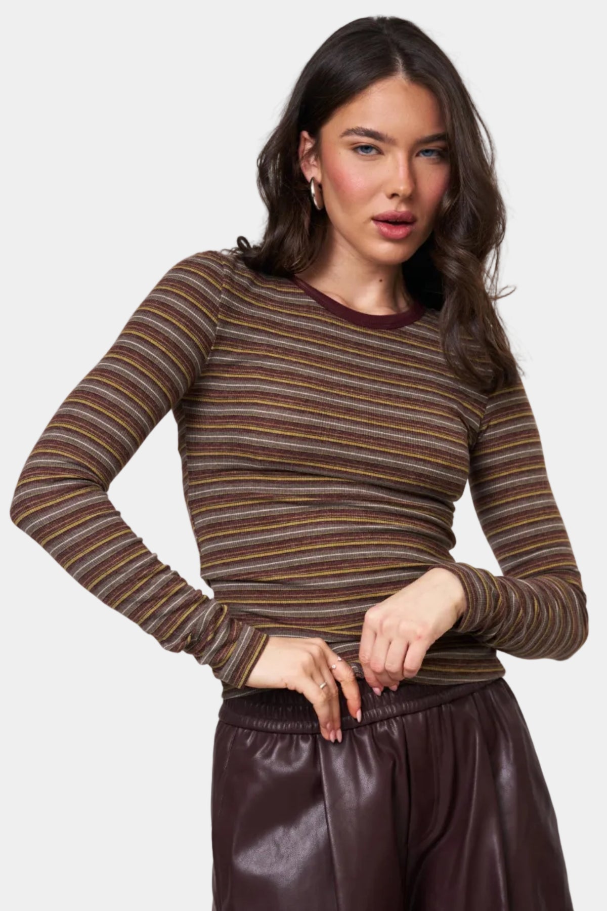 חולצה דקה עם שרוולים ארוכים והדפס פסים עדין, בד נעים וגמיש שיושב צמוד ומחמיא לגוף – מושלמת ללוק יומיומי עם טוויסט.