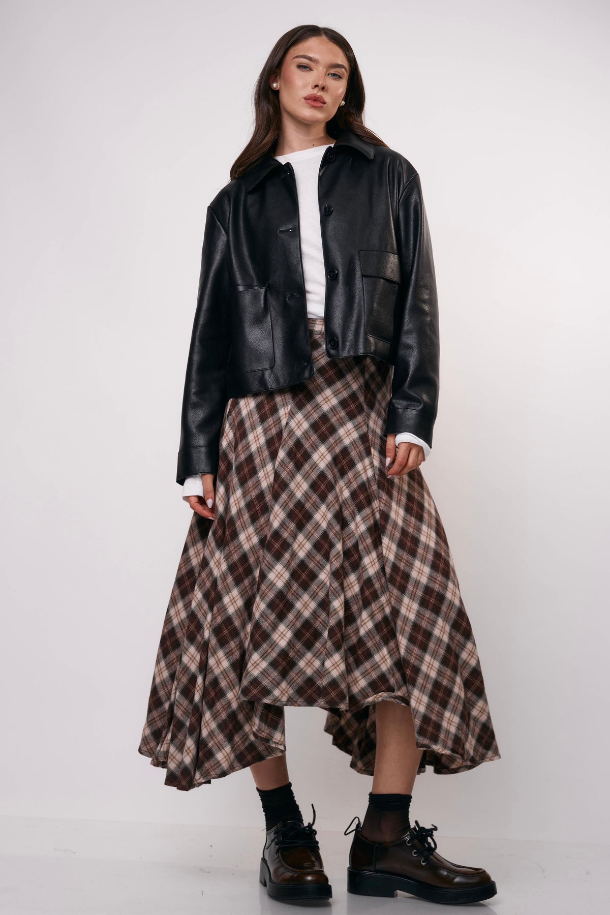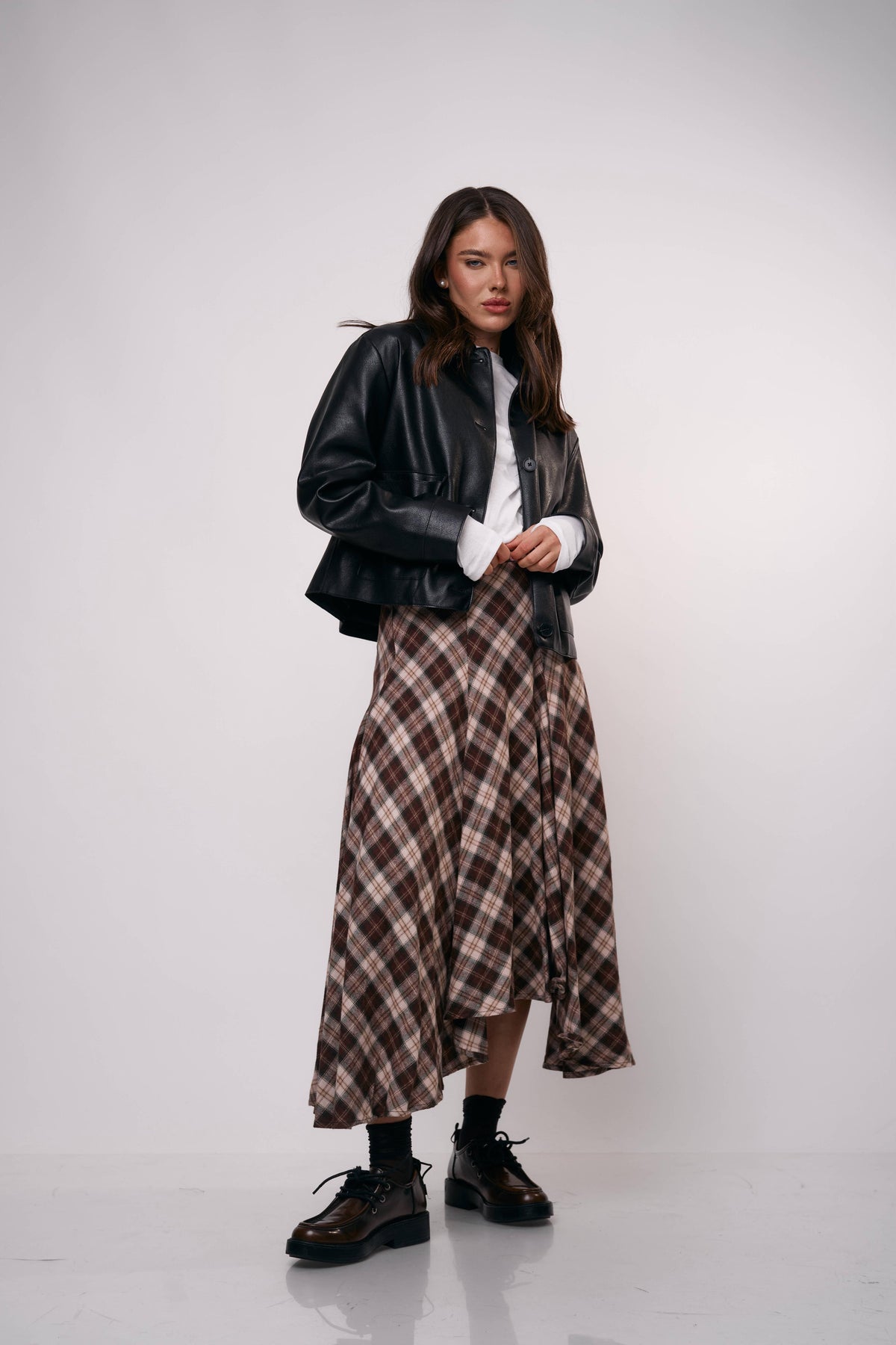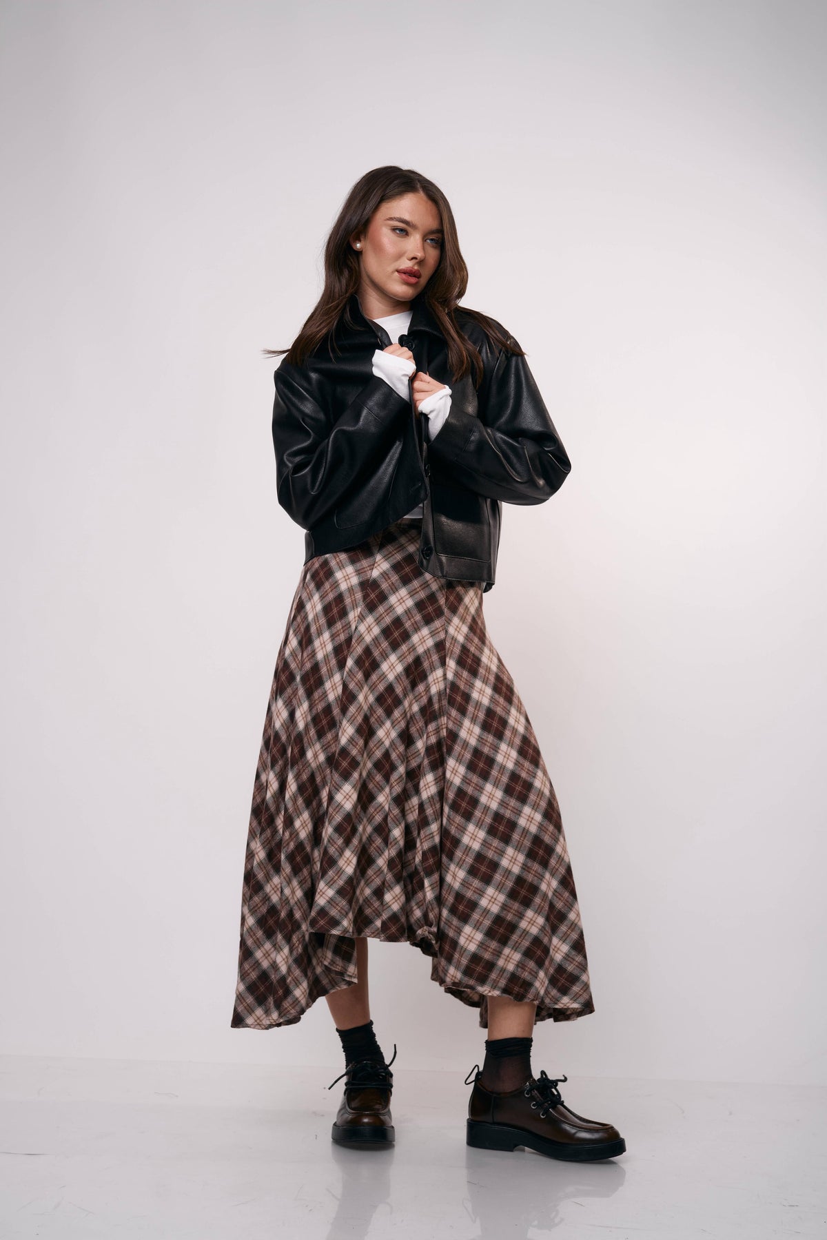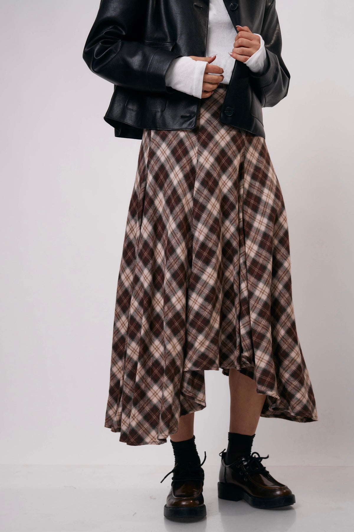 חצאית מידי בגזרה מתרחבת עם הדפס משבצות קלאסי, מושלמת ללוק יומיומי עם טוויסט או לשילוב ערב מדויק