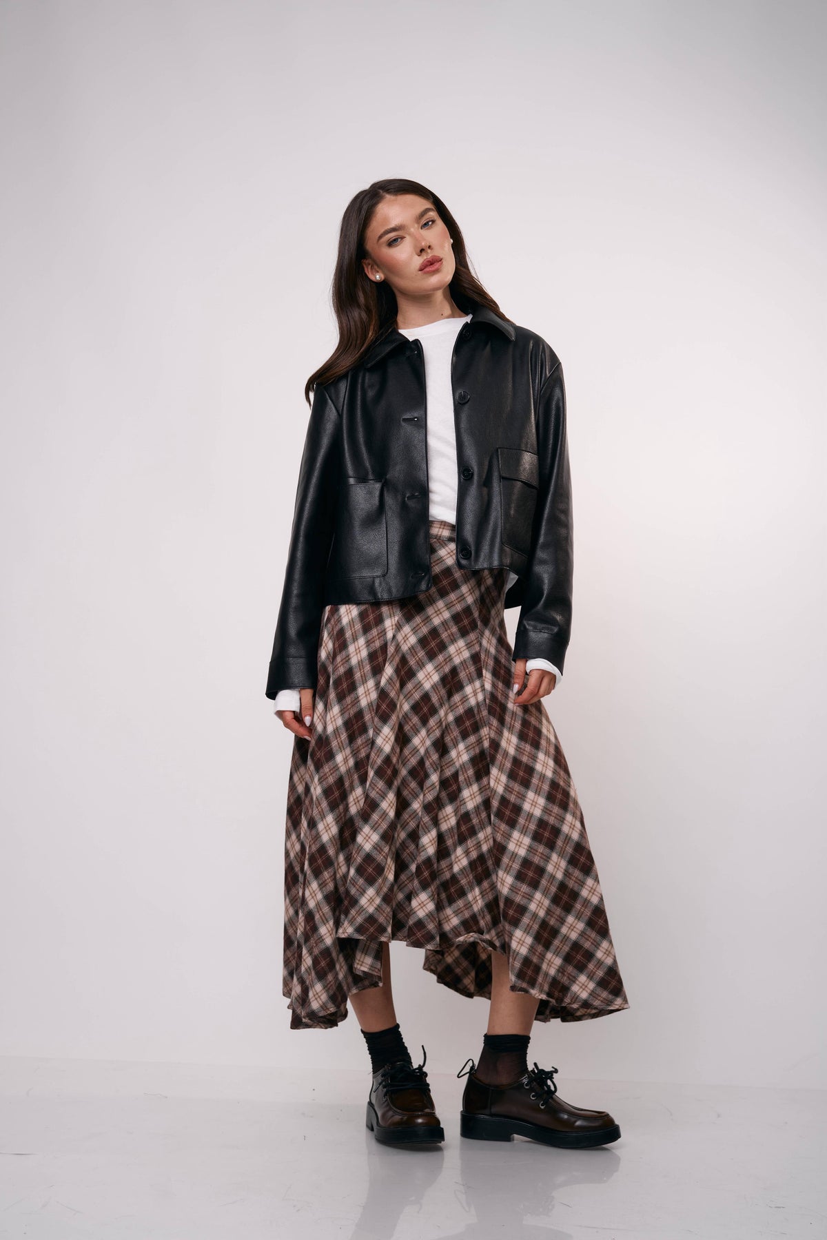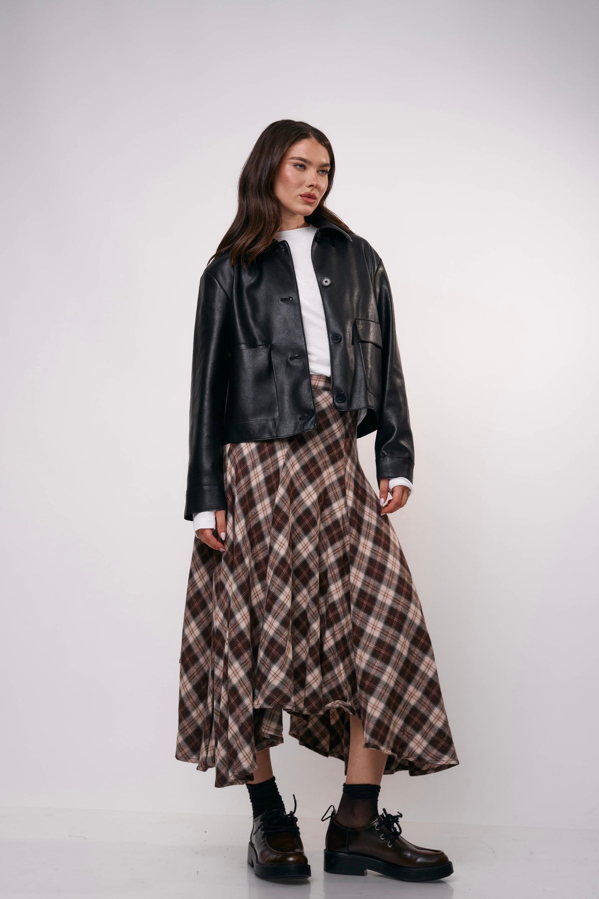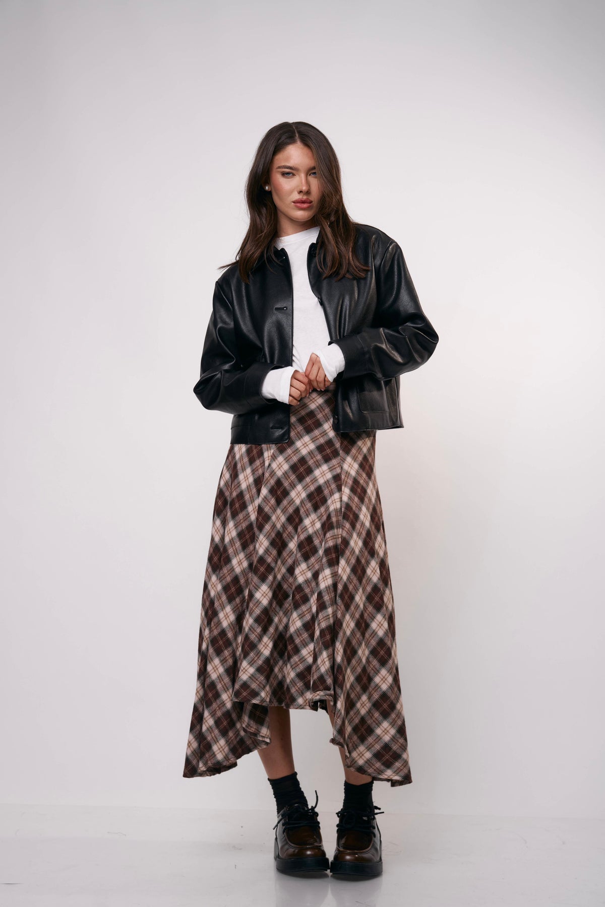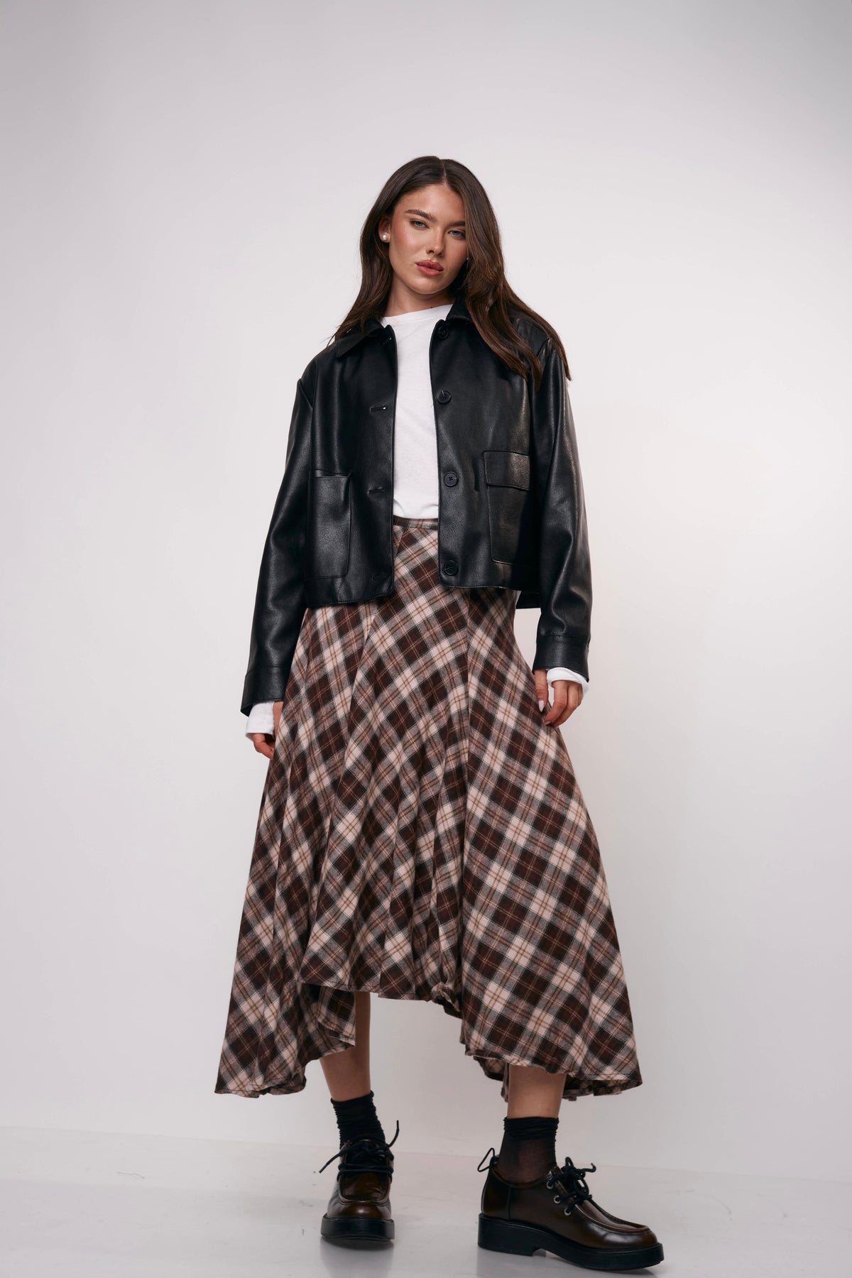 חצאית מידי בגזרה מתרחבת עם הדפס משבצות קלאסי, מושלמת ללוק יומיומי עם טוויסט או לשילוב ערב מדויק