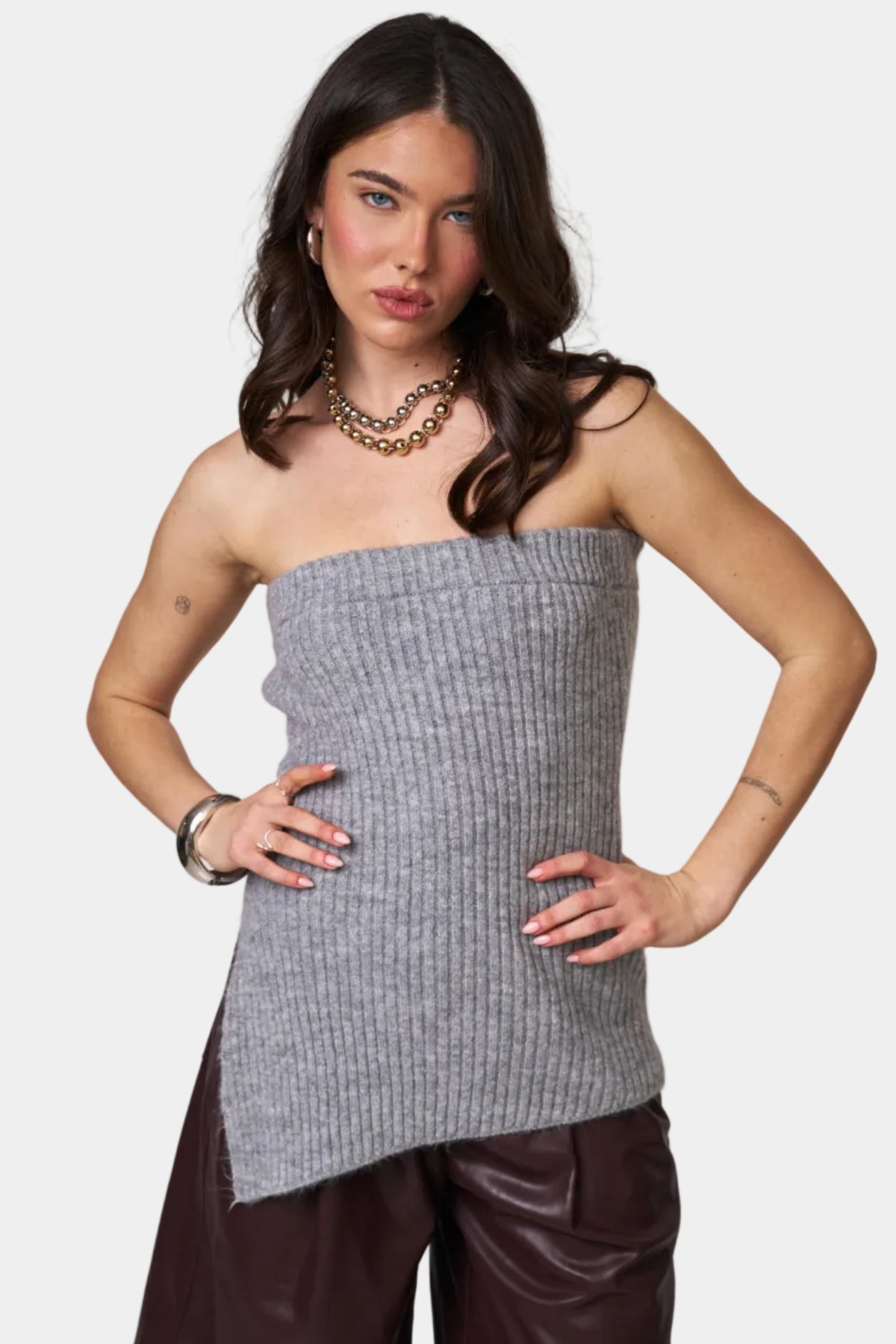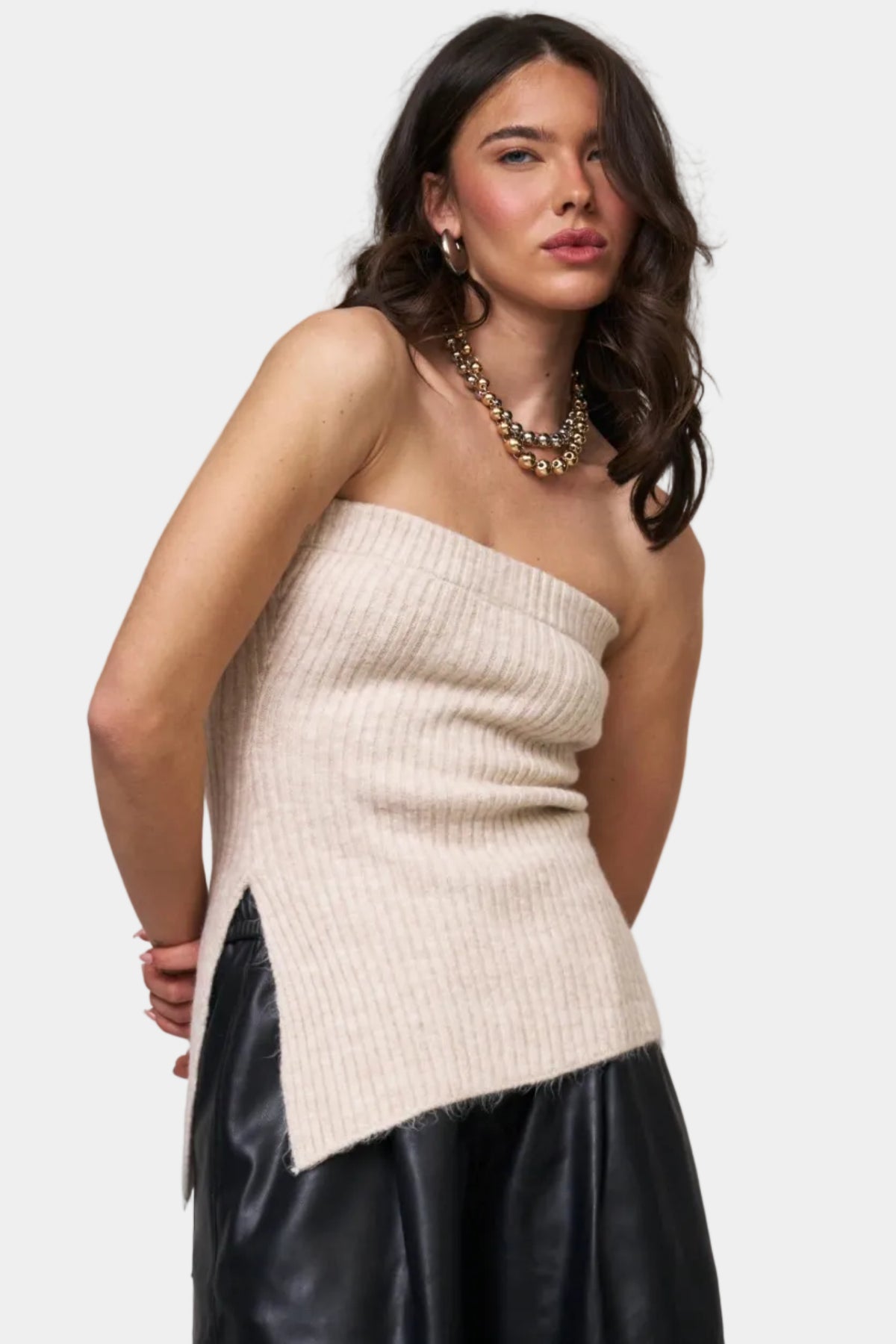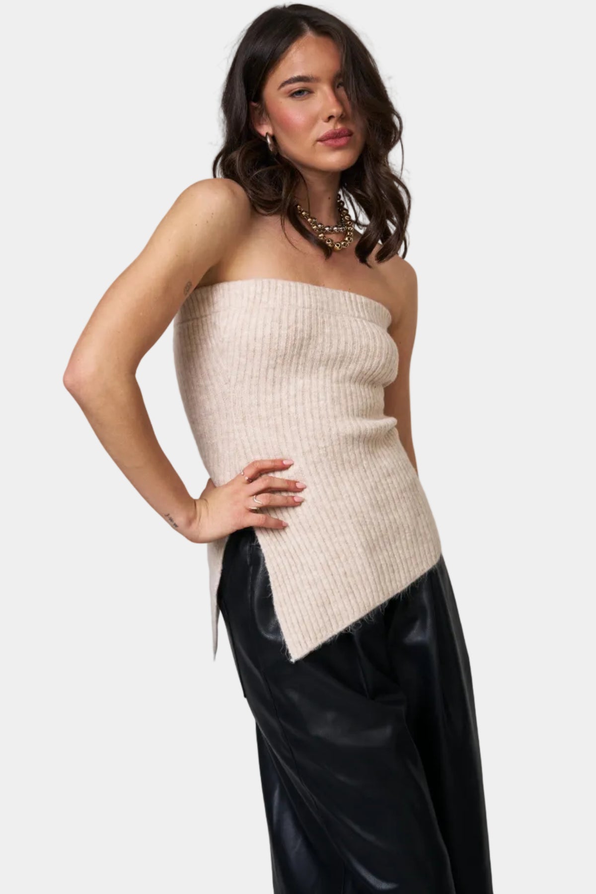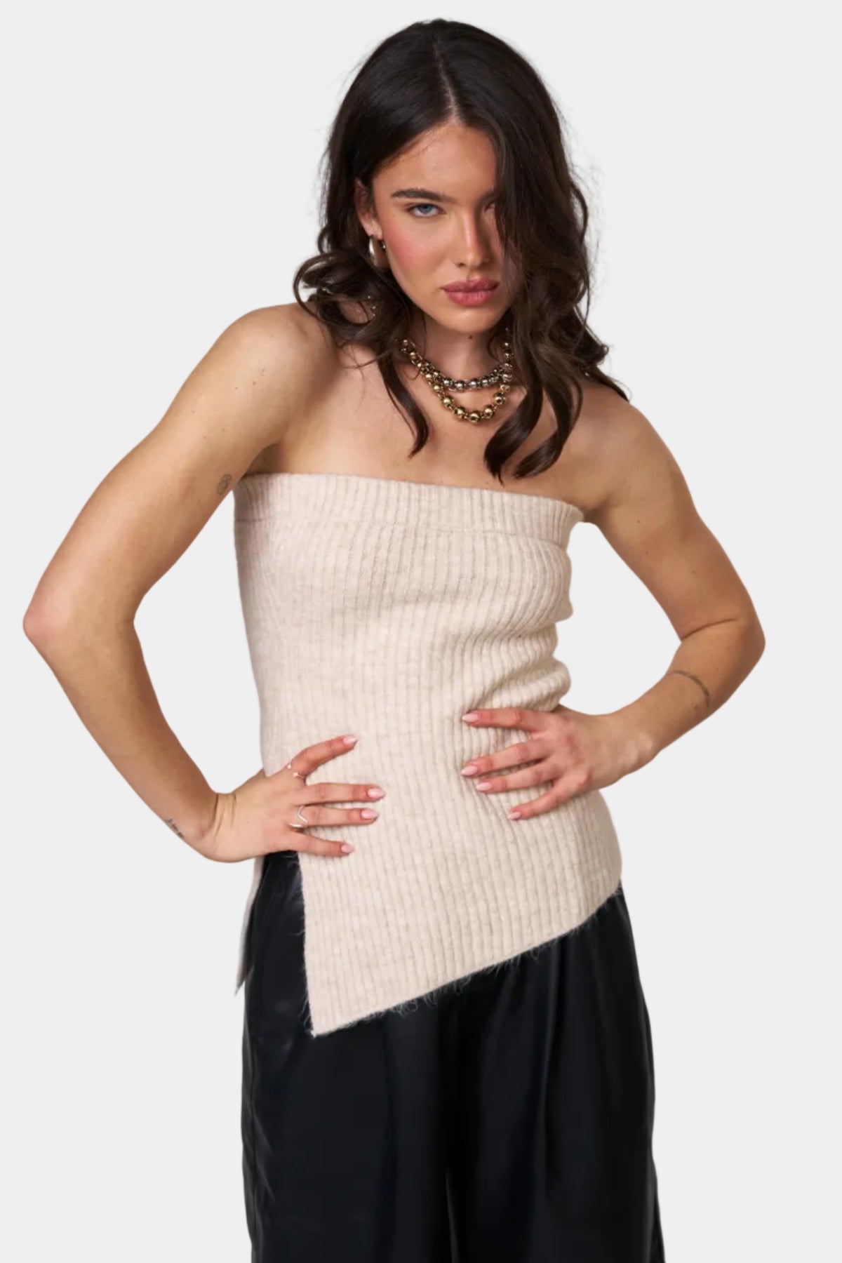 טופ סטרפלס סרוג בגזרה צמודה עם טקסטורת ריב ואורך אסימטרי, פריט מינימליסטי עם טוויסט מדויק.