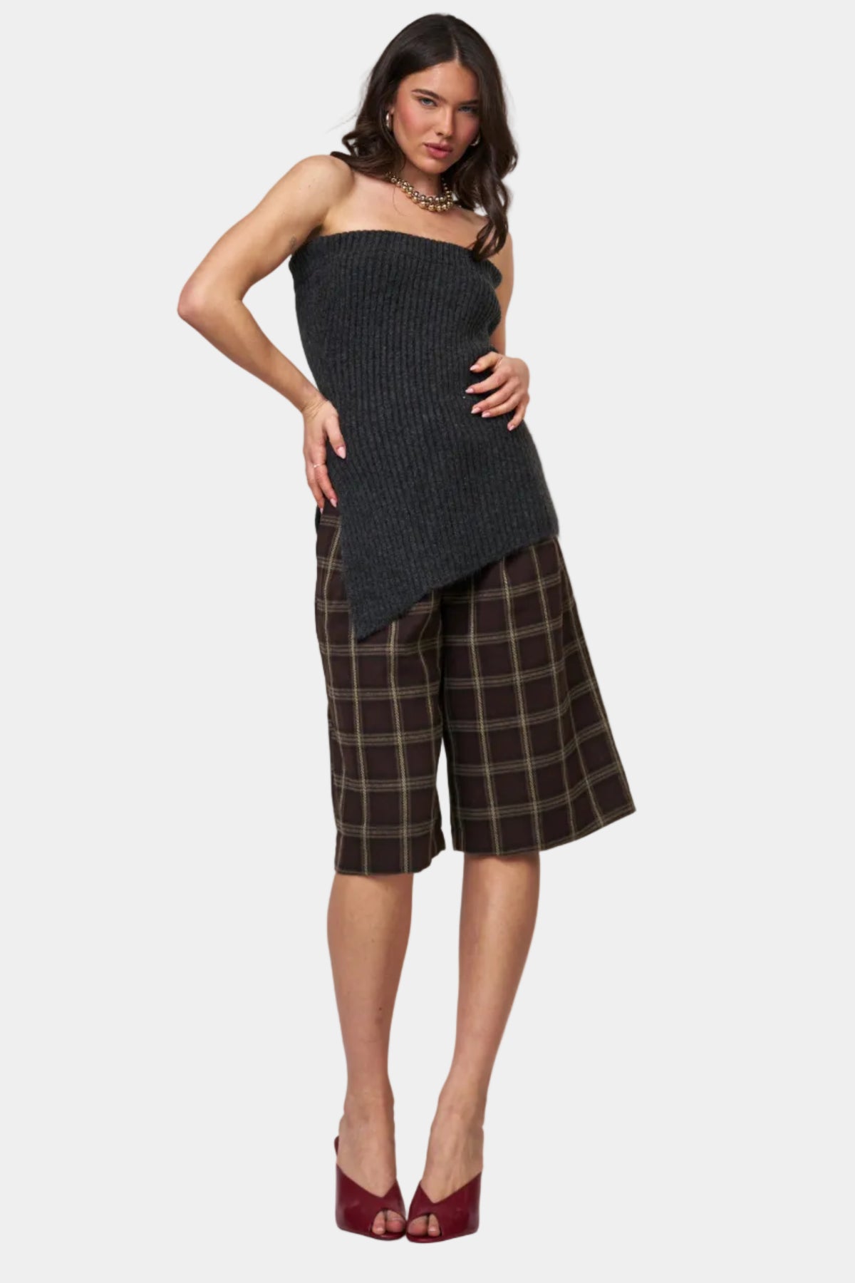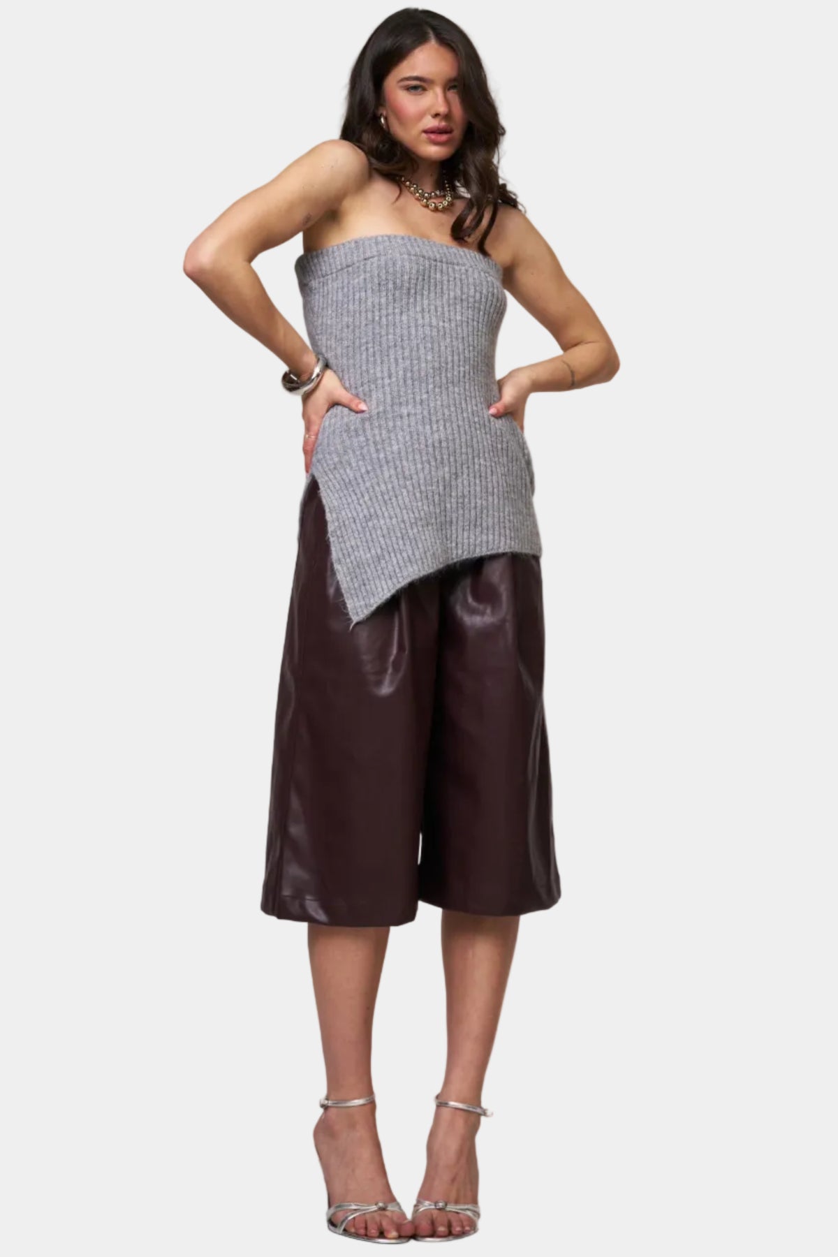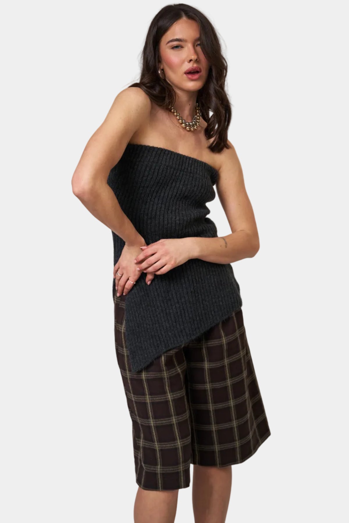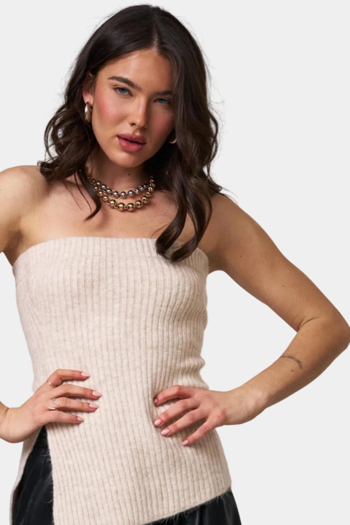 טופ סטרפלס סרוג בגזרה צמודה עם טקסטורת ריב ואורך אסימטרי, פריט מינימליסטי עם טוויסט מדויק.