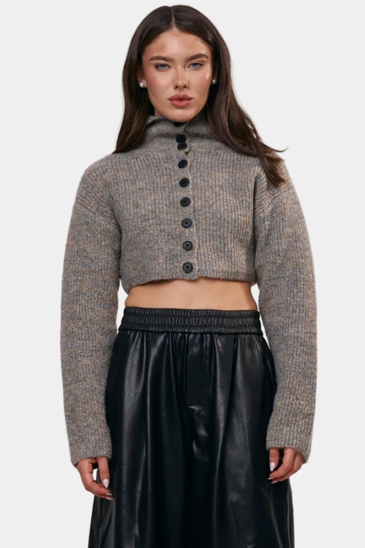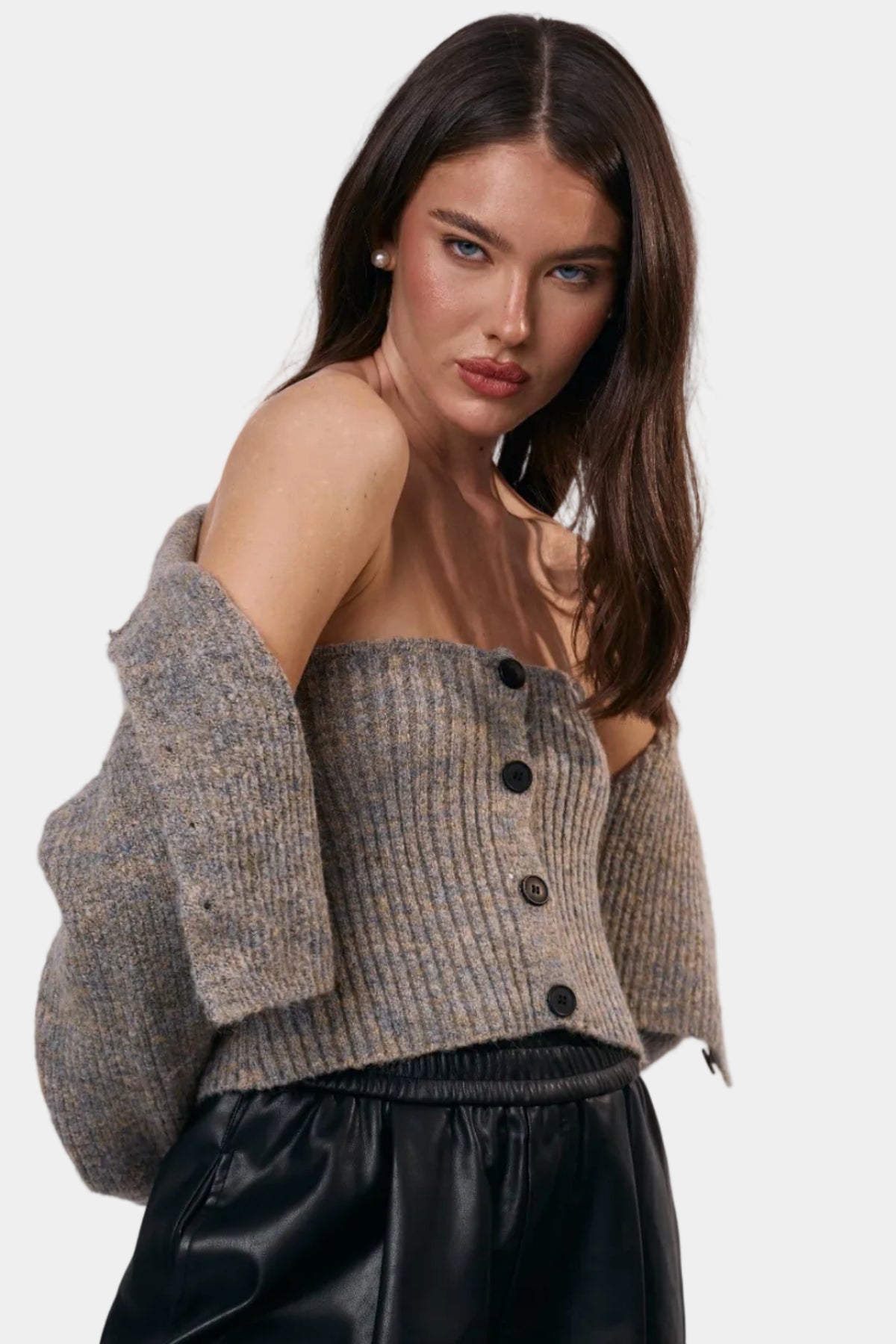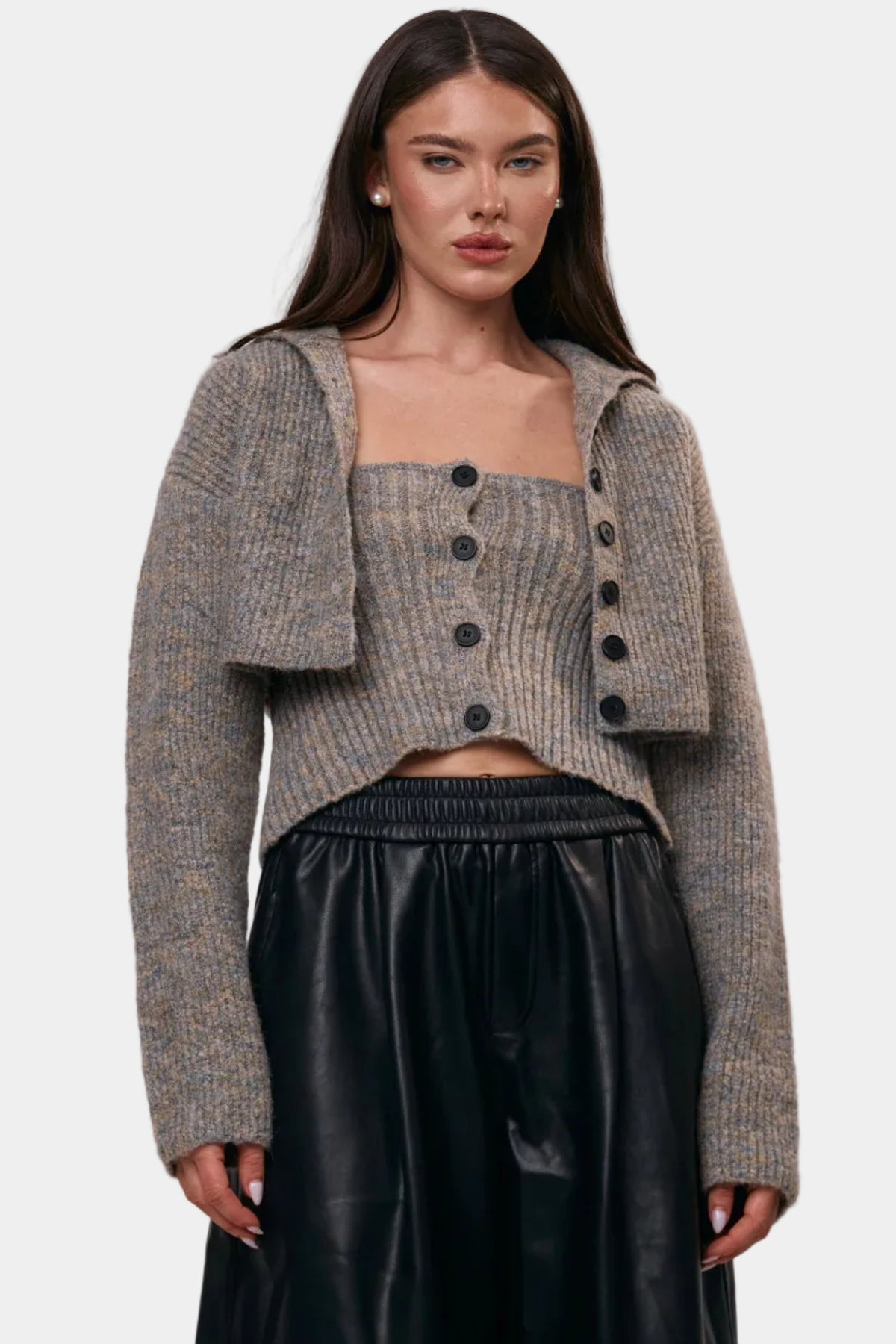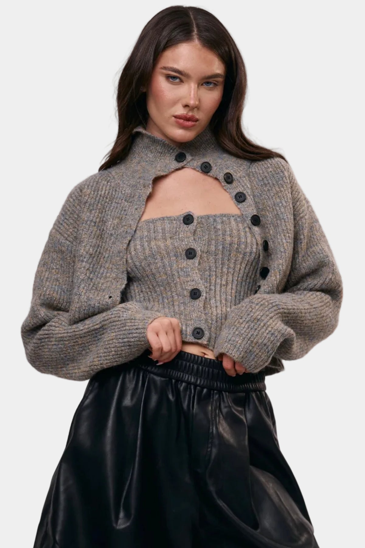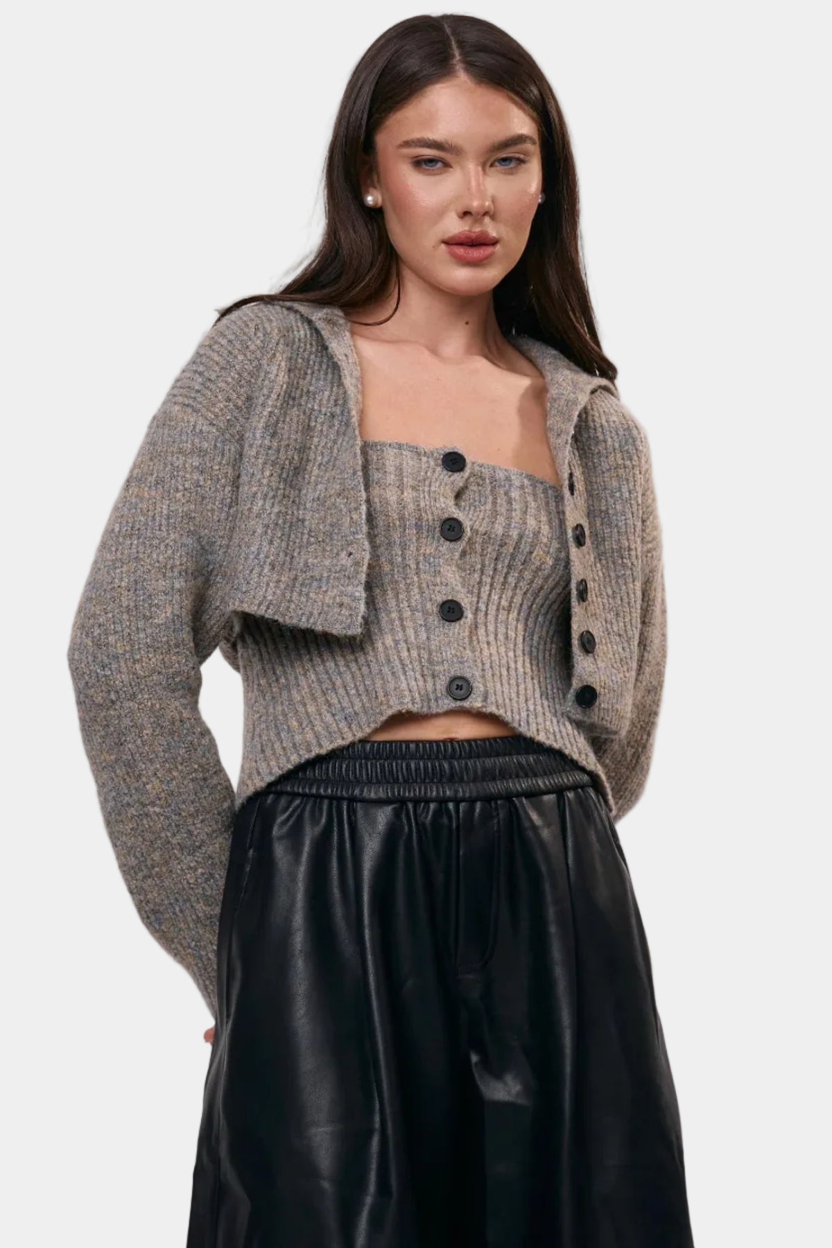 סט סריג בגזרה מחמיאה, כולל קרדיגן קצר וטופ תואם למראה רך ומדויק.