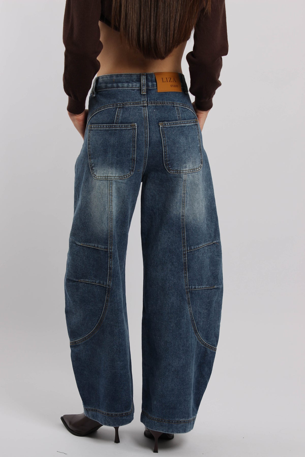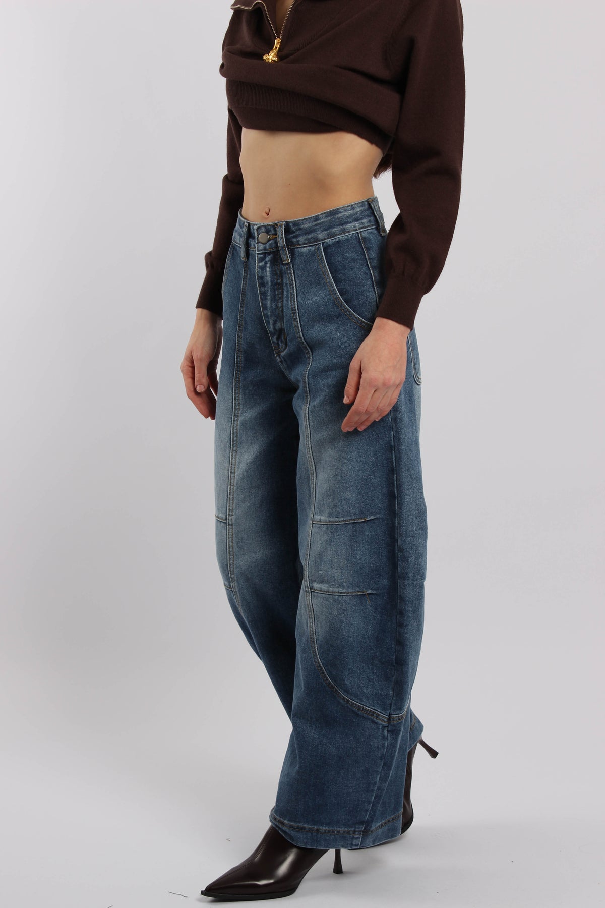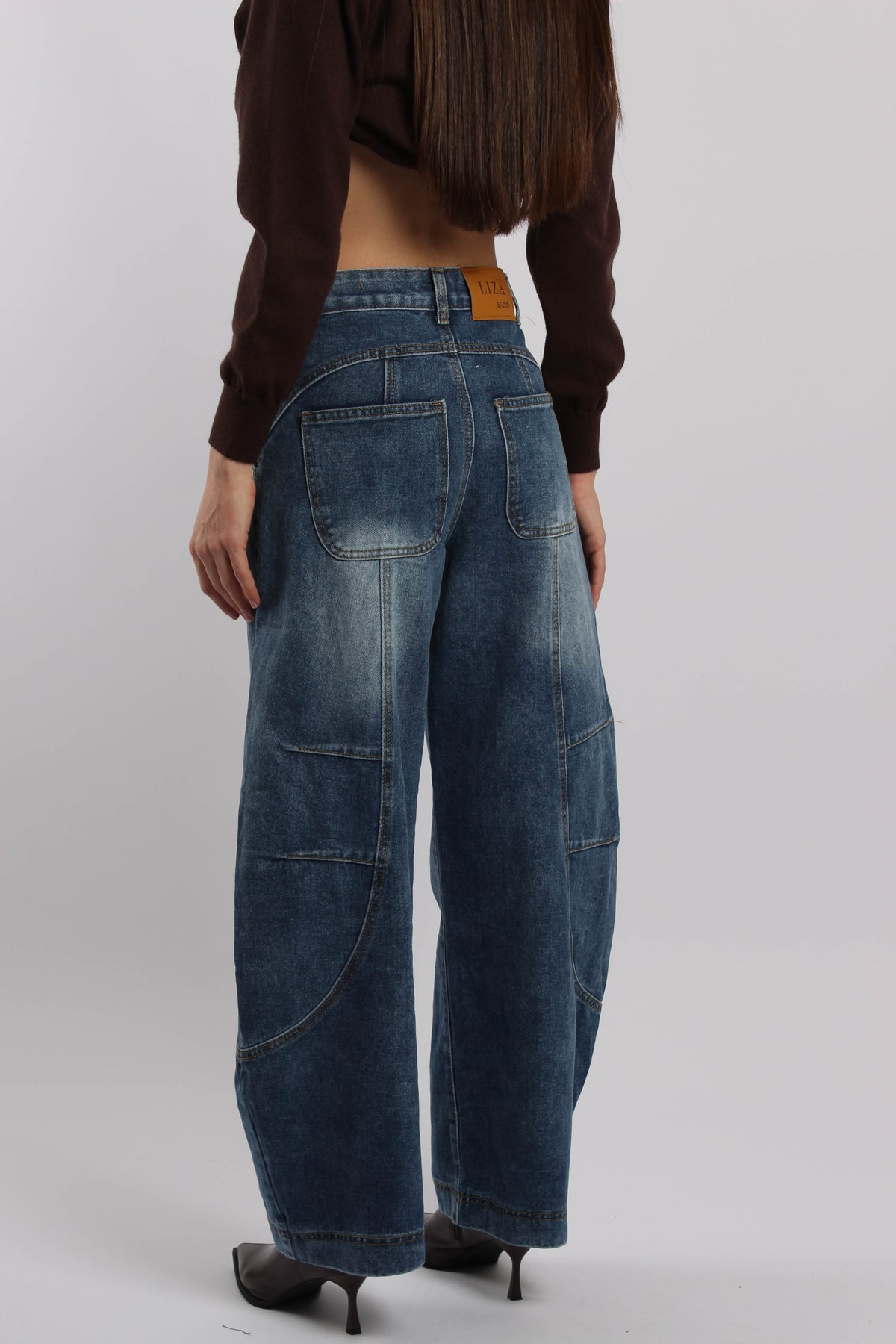 ג׳ינס בגזרה רחבה עם תפרים מודגשים, לוק יומיומי מחוספס ונוח.