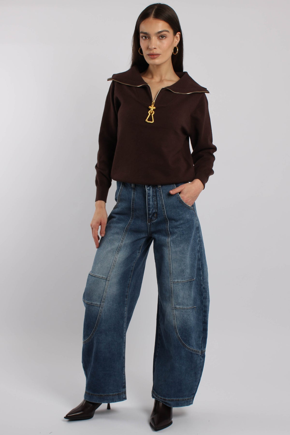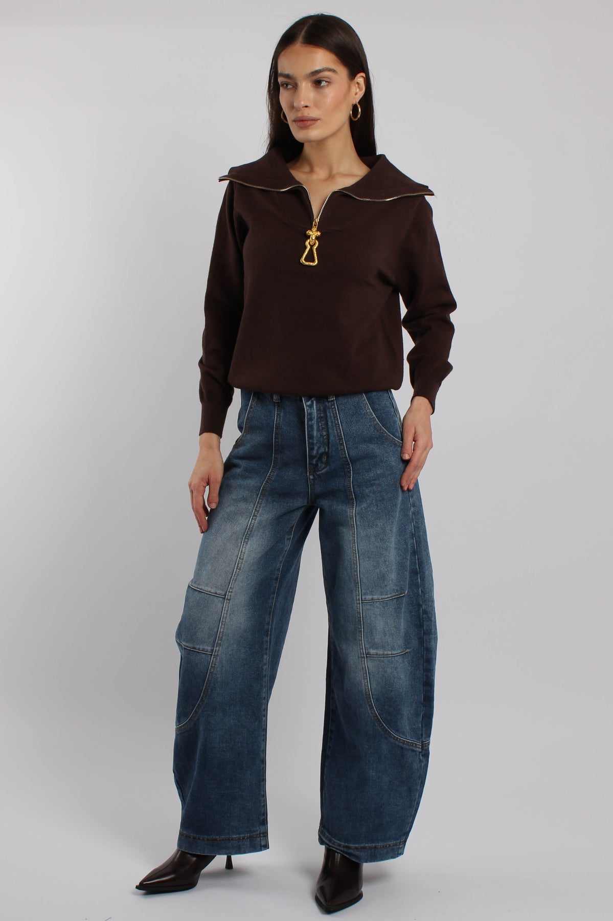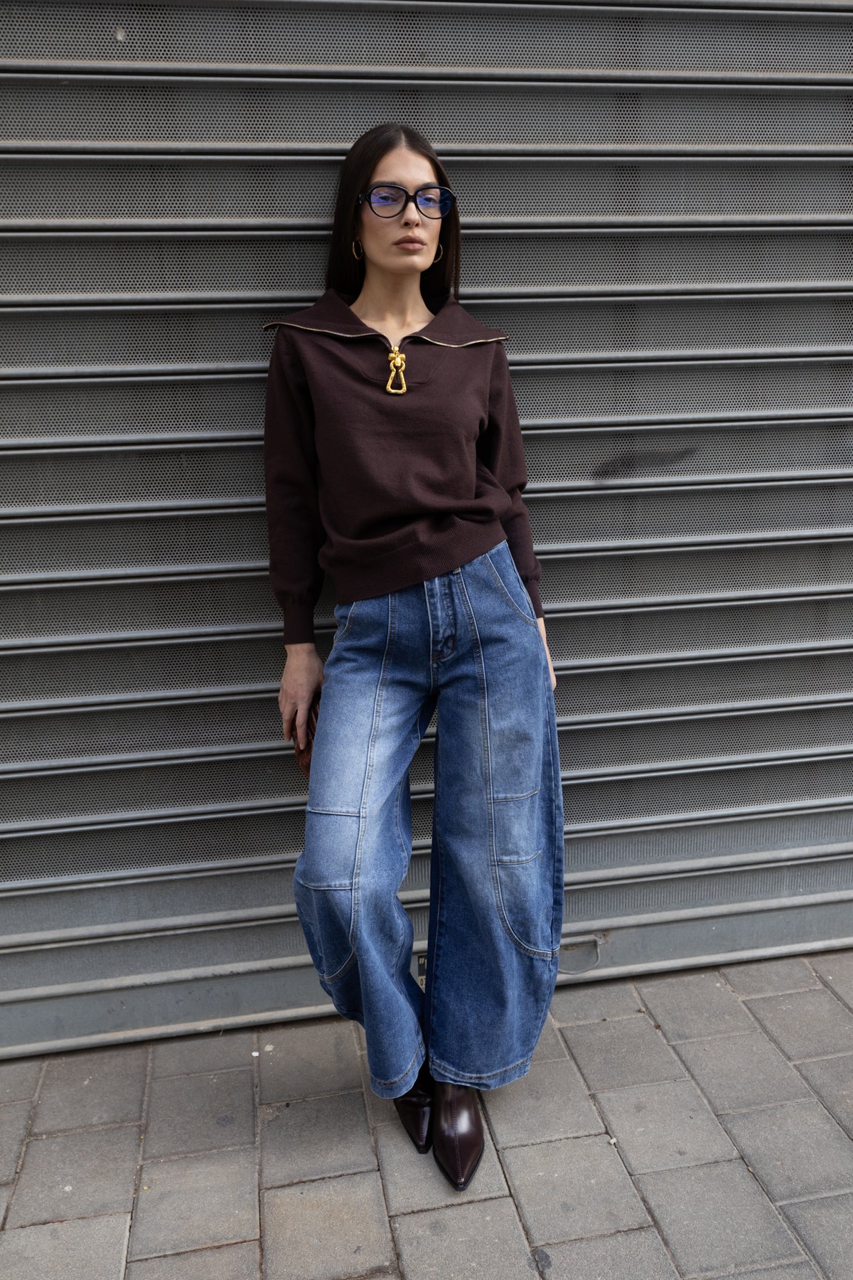 ג׳ינס בגזרה רחבה עם תפרים מודגשים, לוק יומיומי מחוספס ונוח.