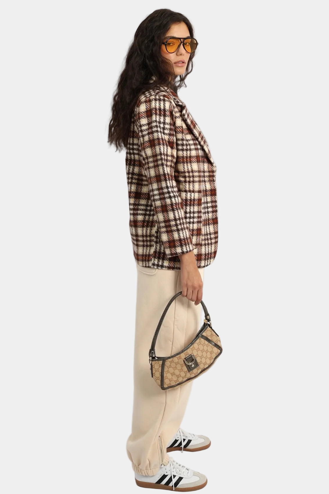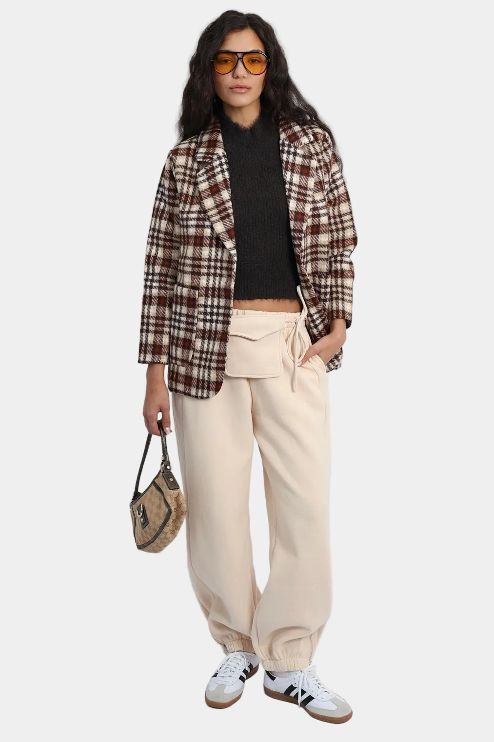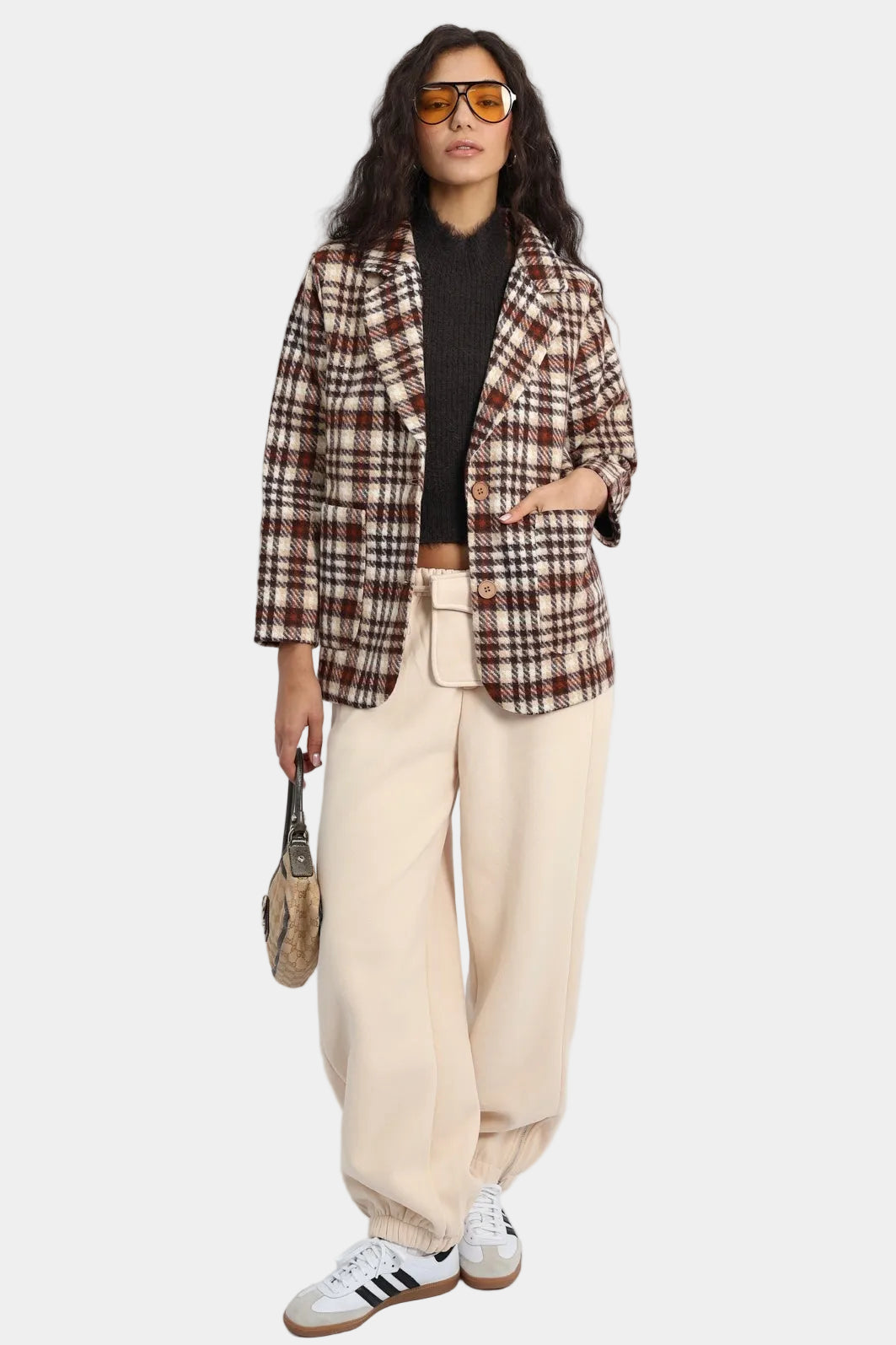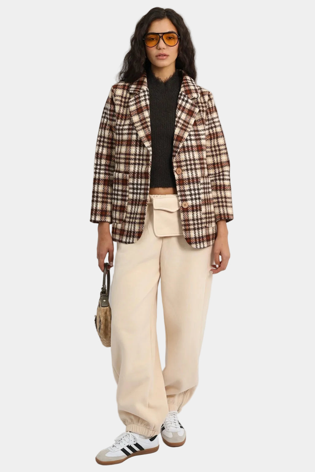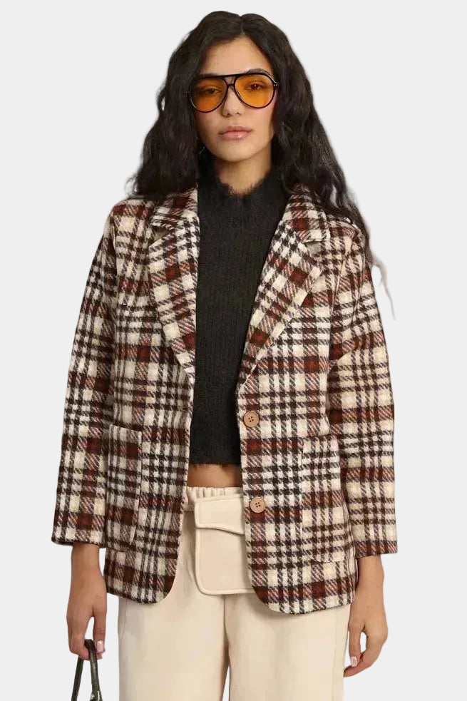 ז’קט משובץ בגזרה מחויטת־משוחררת עם כיסים קדמיים וסגירת כפתורים.