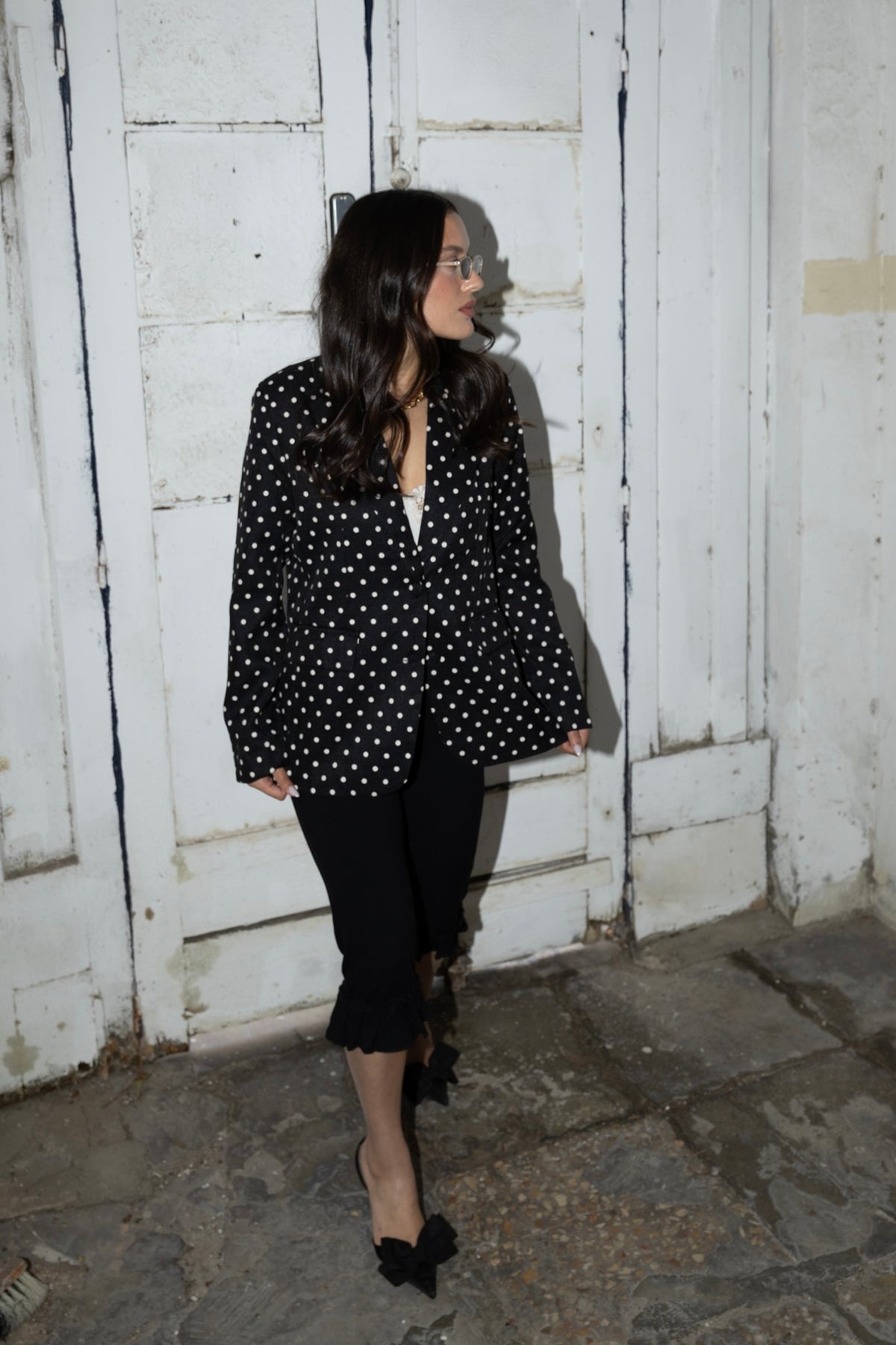ג׳קט מחויט בהדפס נקודות, בגזרה רפויה עם סגירת כפתורים קדמית ולוק אלגנטי עם טוויסט יומיומי.