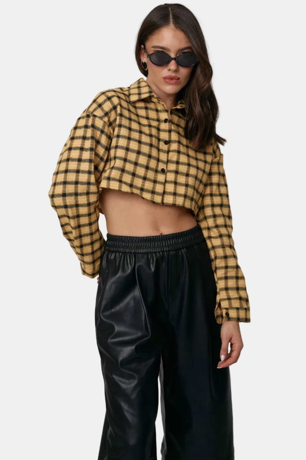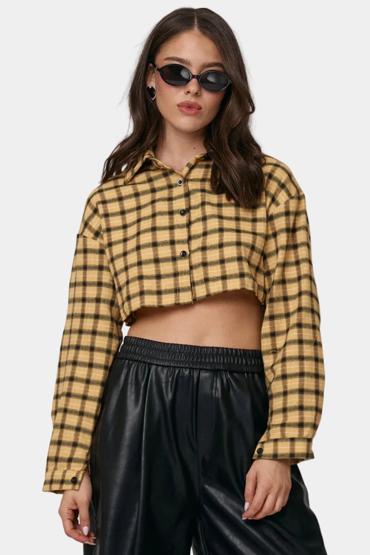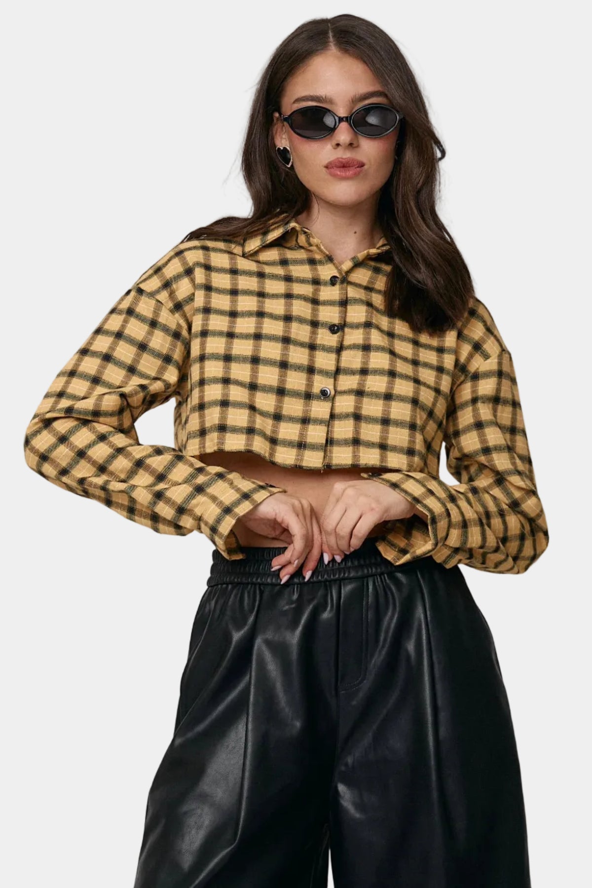 חולצת קרופ מכופתרת מבד פלנל בהדפס משבצות, בגזרה מחמיאה עם שרוולים ארוכים ולוק יומיומי־אופנתי.
