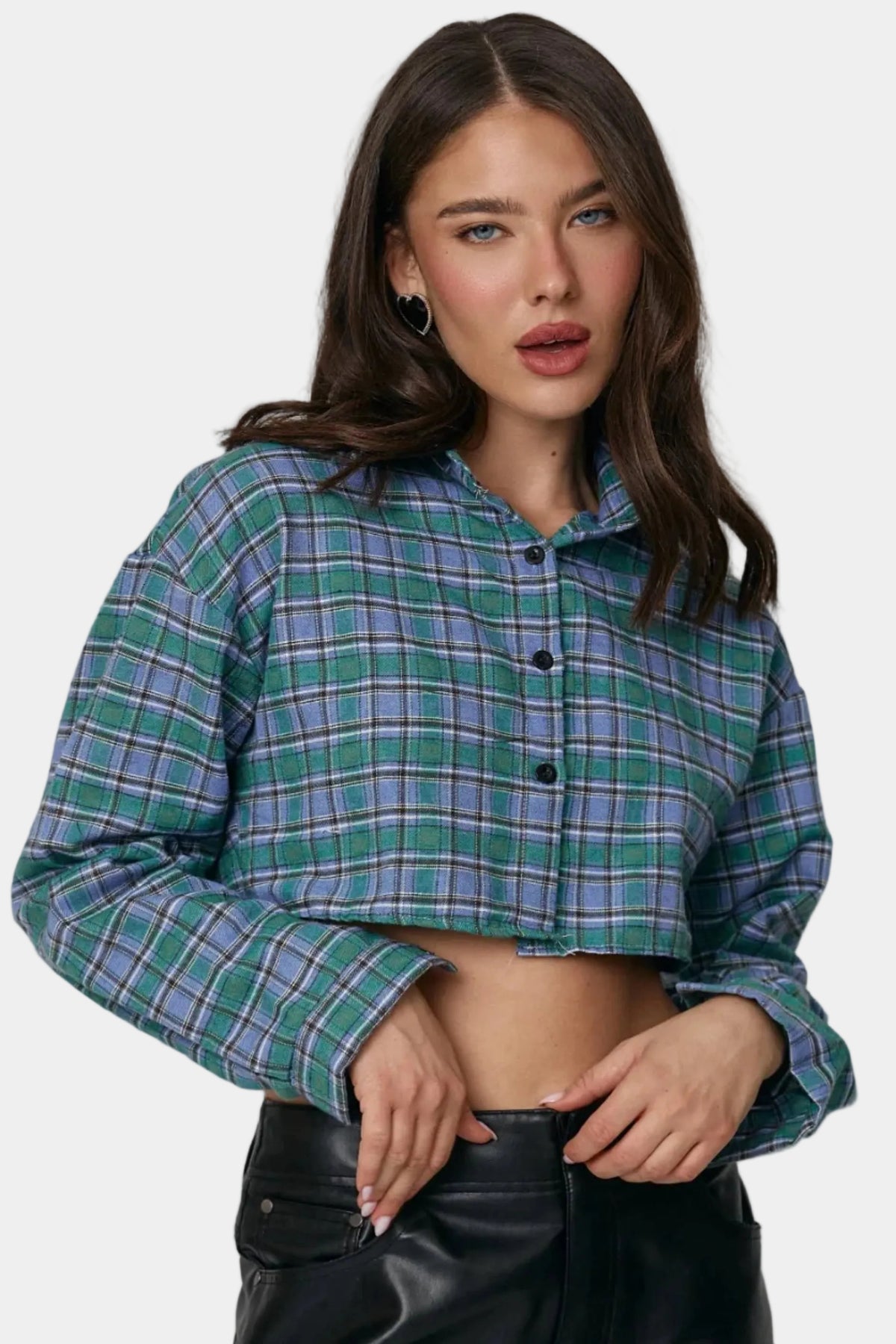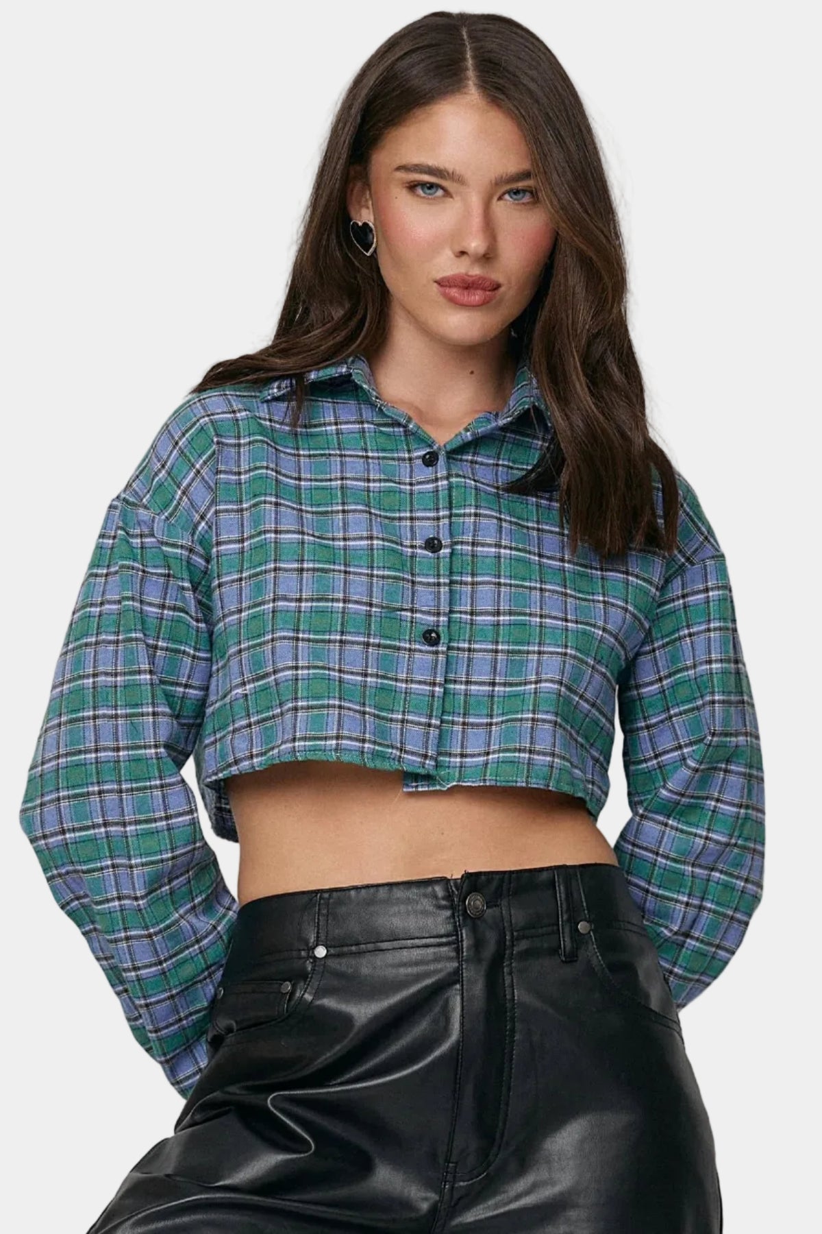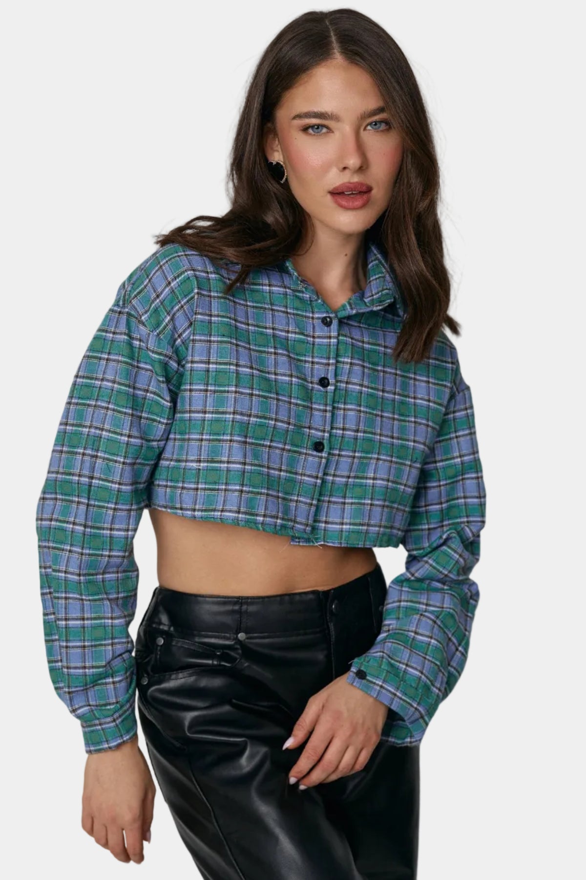 חולצת קרופ מכופתרת מבד פלנל בהדפס משבצות, בגזרה מחמיאה עם שרוולים ארוכים ולוק יומיומי־אופנתי.