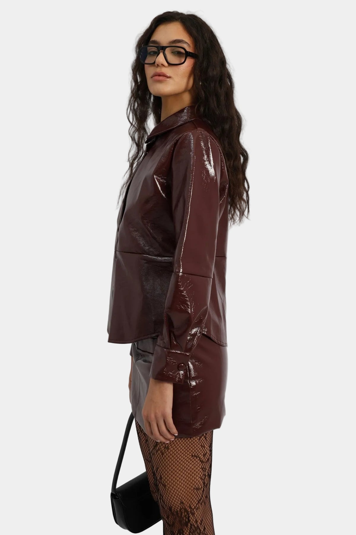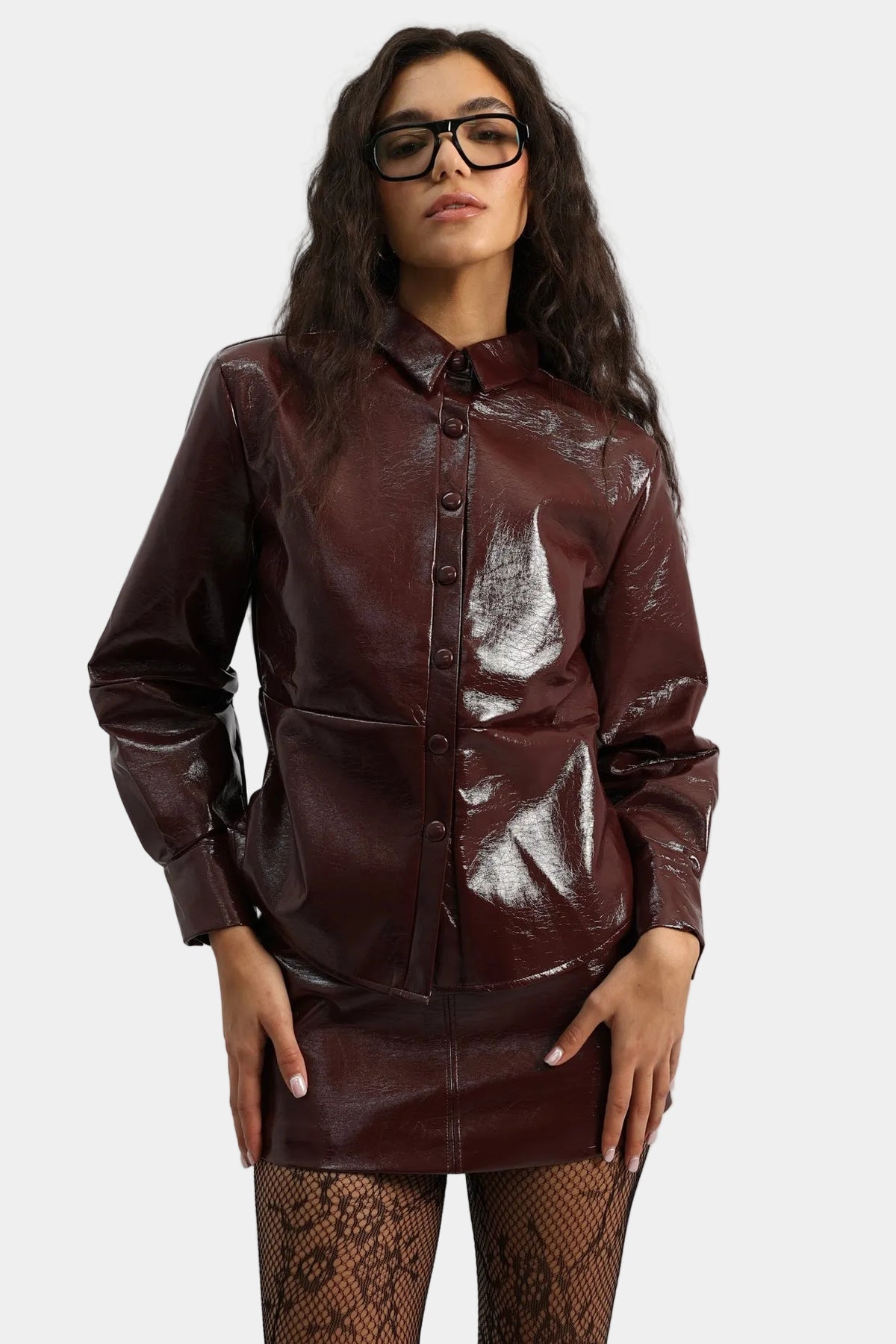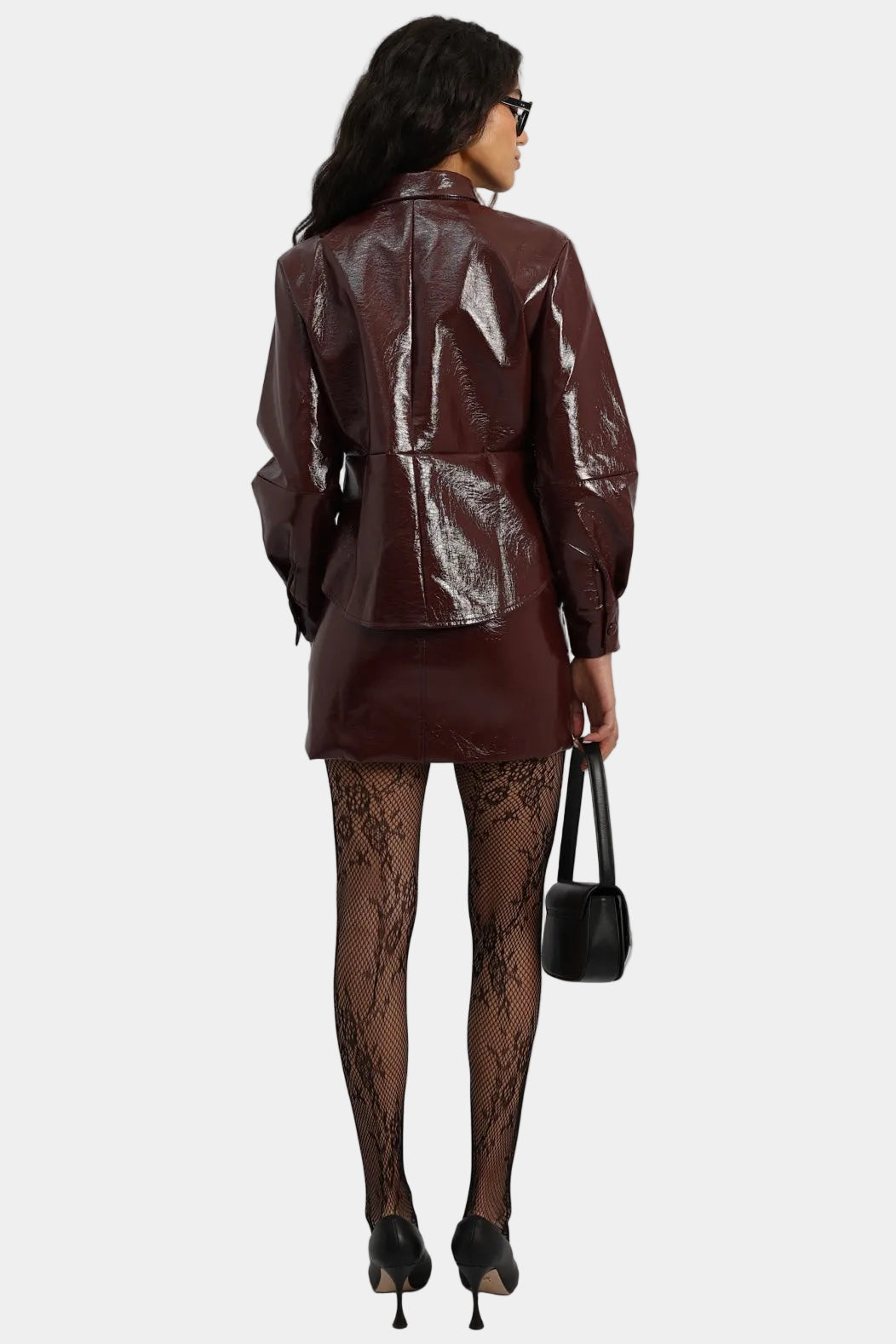 חליפת חצאית דמוי עור בגזרה משוחררת עם ז’קט תואם וסגירת כפתורים.