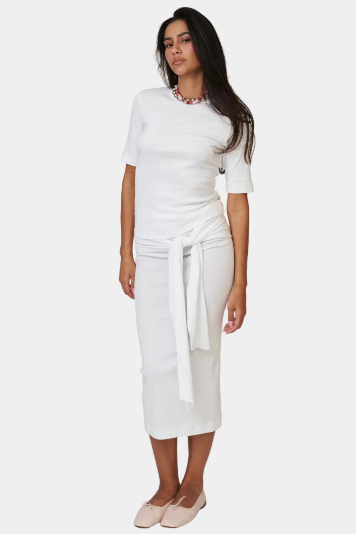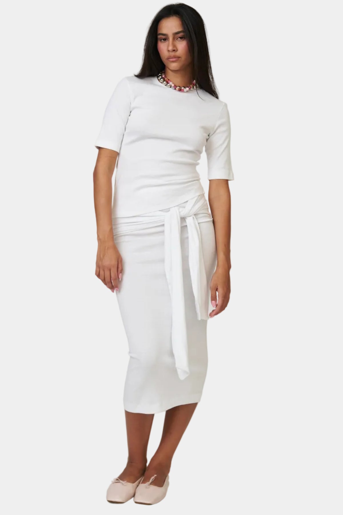 חליפת חצאית בגזרה נקייה עם טופ תואם, קשירה בצד ומראה אלגנטי ומדויק.