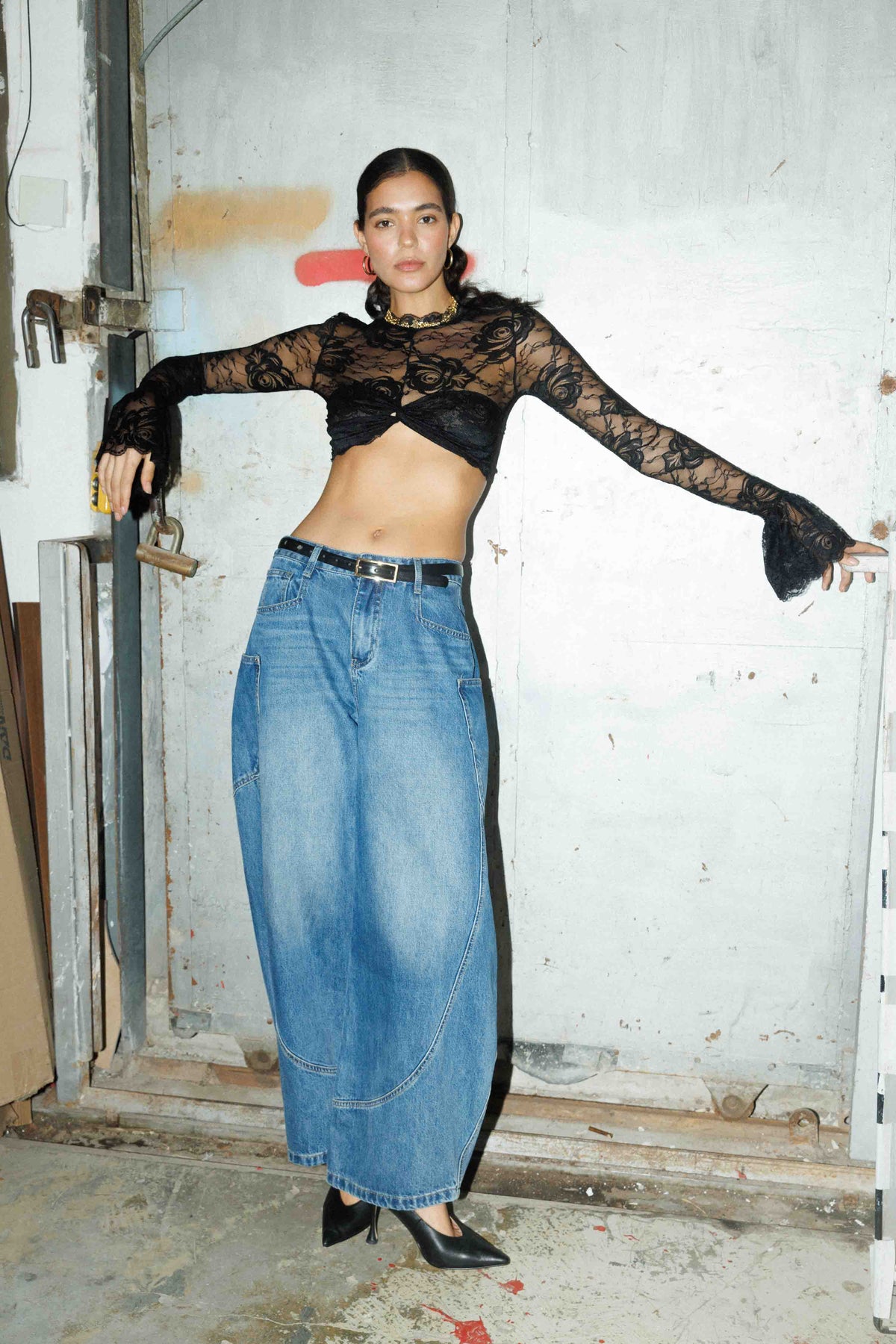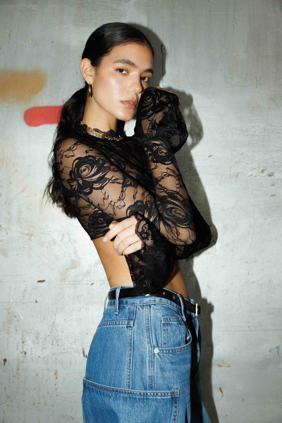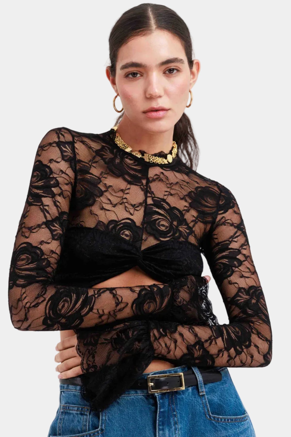 טופ תחרה בגזרה נשית עם עיטורי פרחים עדינים, כיווצים באזור החזה וסיומת מלמלה רחבה.