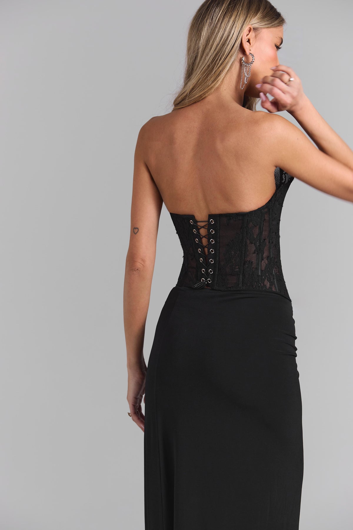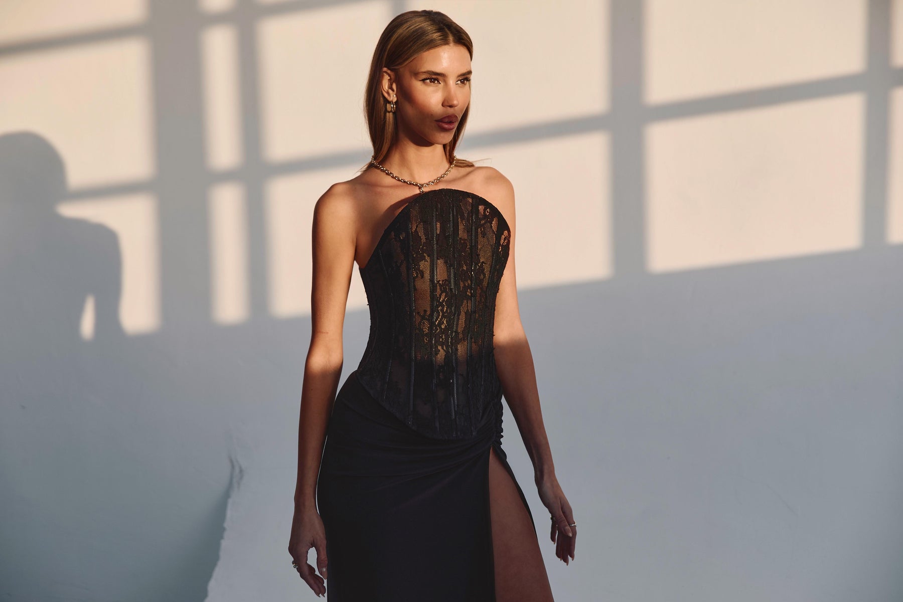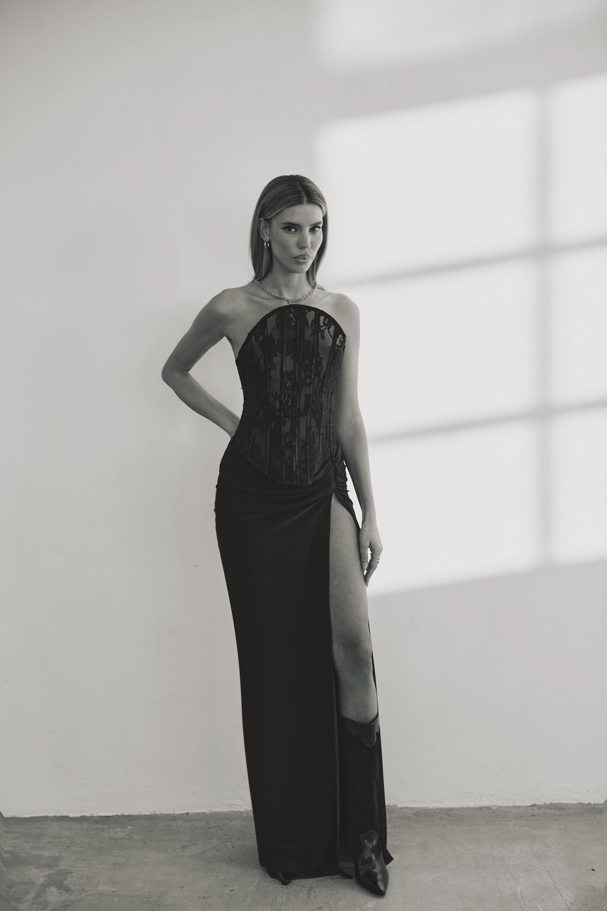 שמלת מקסי שחורה מחוך תחרה עם עצמות חצאית עם שסע עמוק מגיעה במידות s/mהשמלה מגיעה עם כאפים נדבקים לחזה