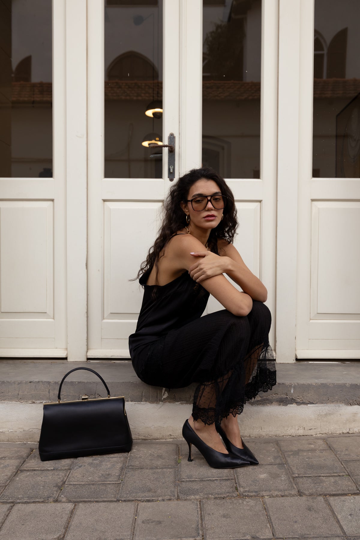 . גופיית שמלה בסגנון לנז׳רי שחורה בעיטור תחרה בחזה וכתפיות מתכווננות עם מפתח עמוק