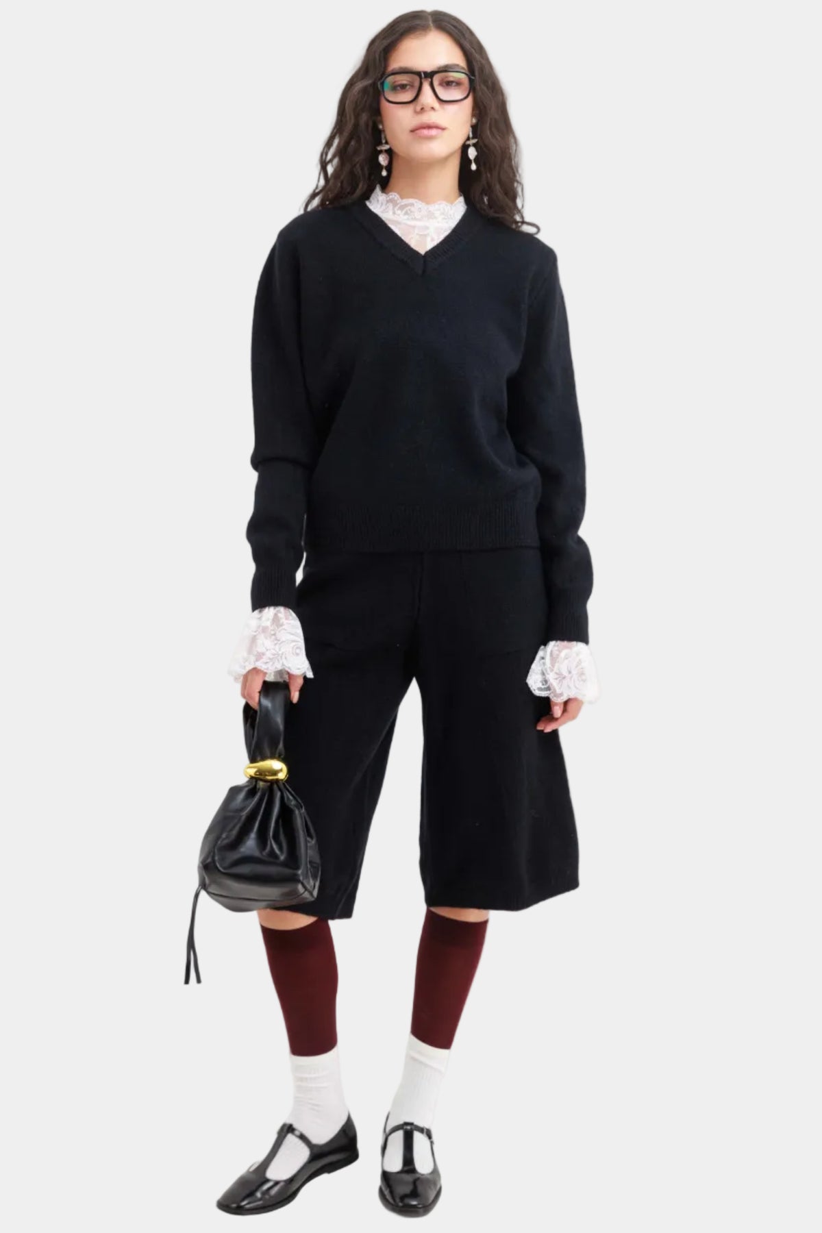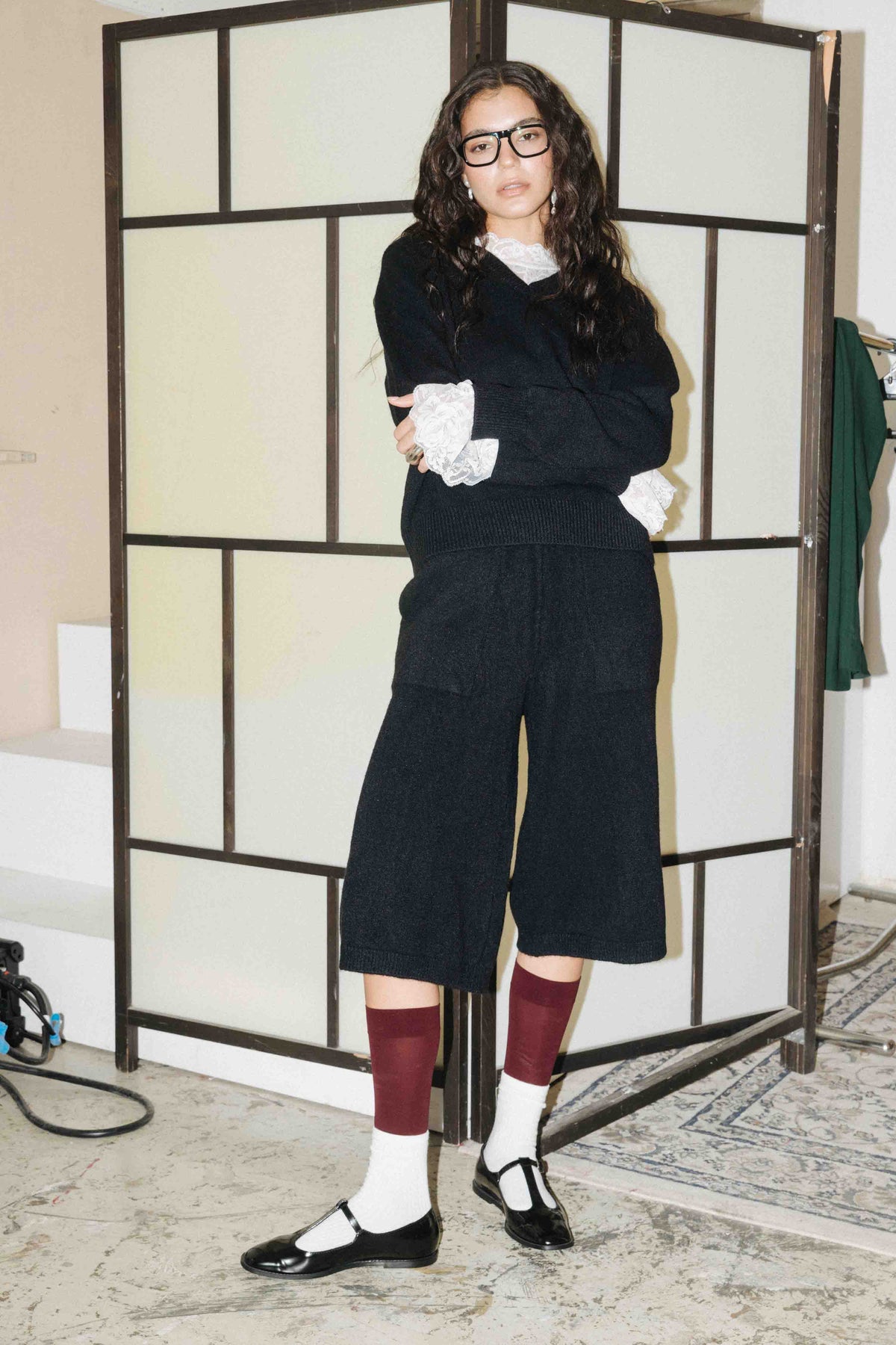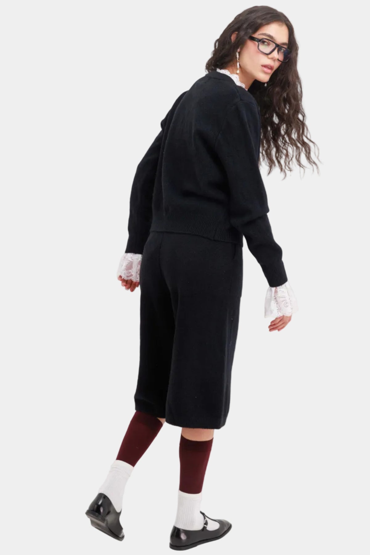 חליפת סריג רכה בגזרה משוחררת עם סוודר צווארון וי ומכנסי ברמודה תואמים למראה נקי ואלגנטי.