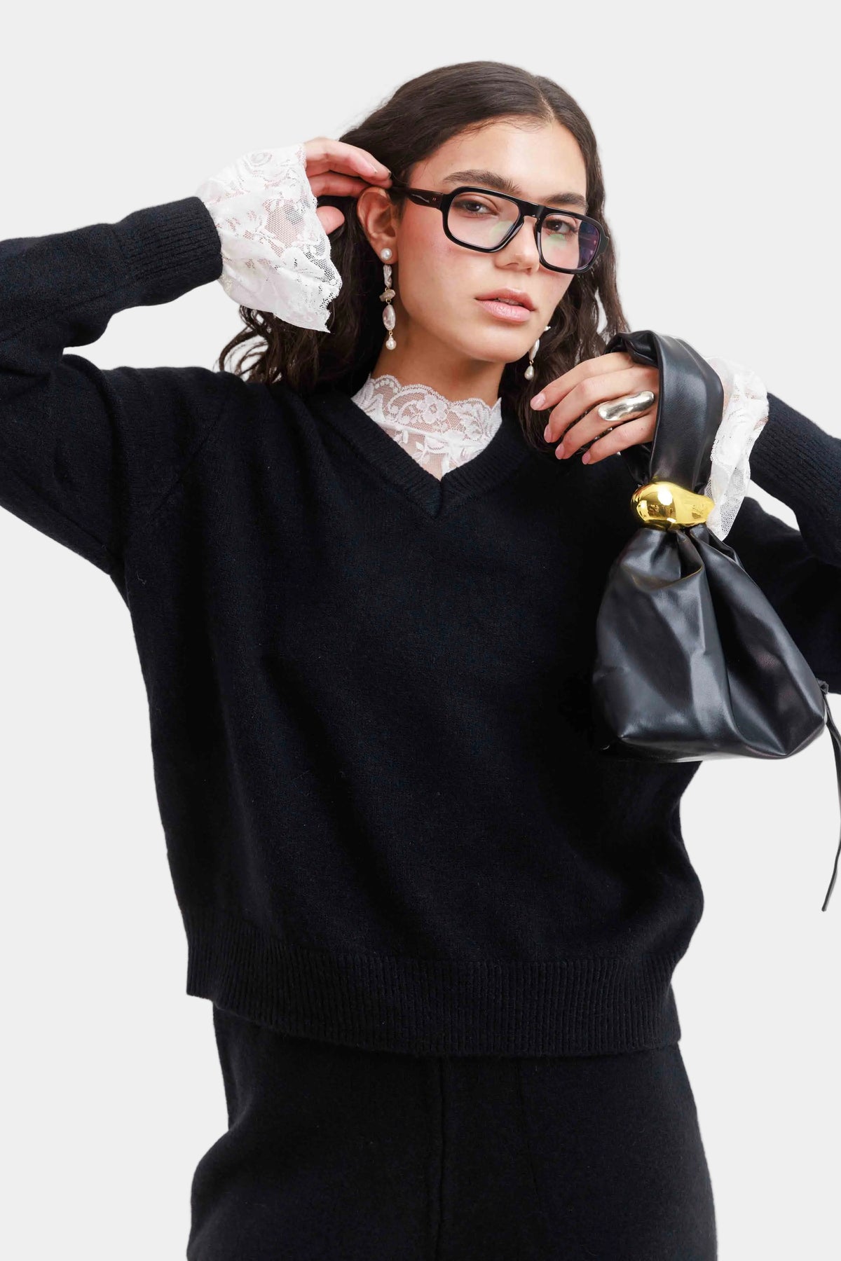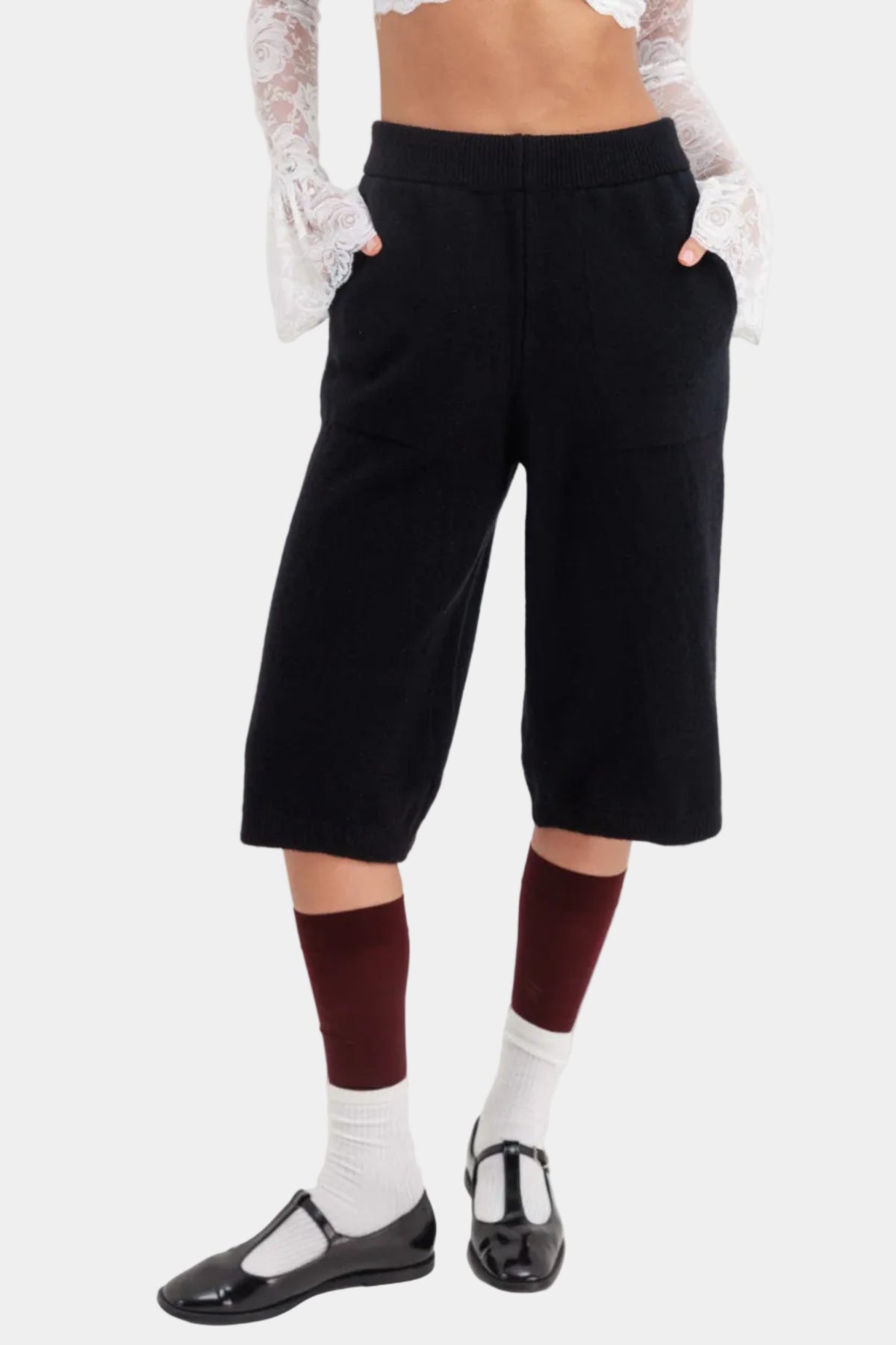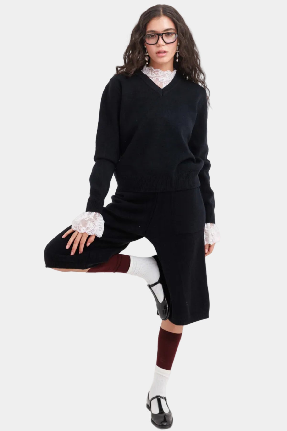 חליפת סריג רכה בגזרה משוחררת עם סוודר צווארון וי ומכנסי ברמודה תואמים למראה נקי ואלגנטי.