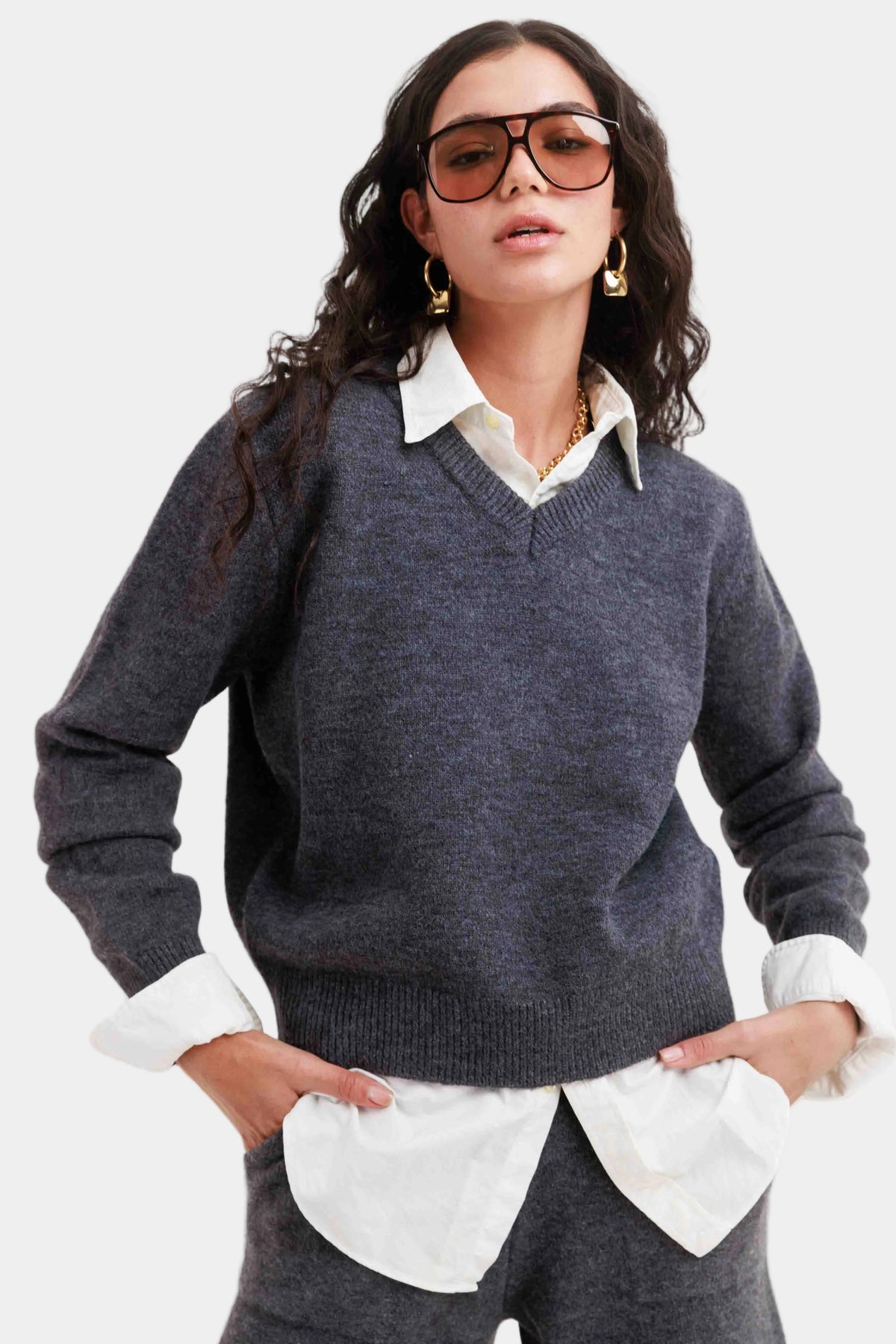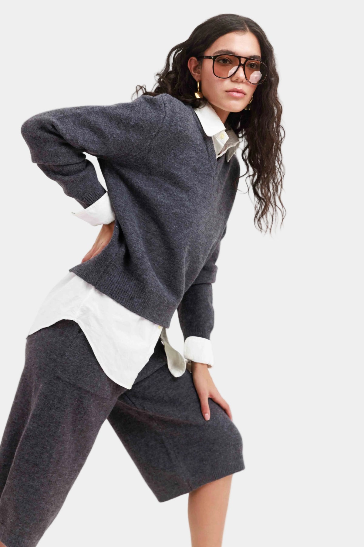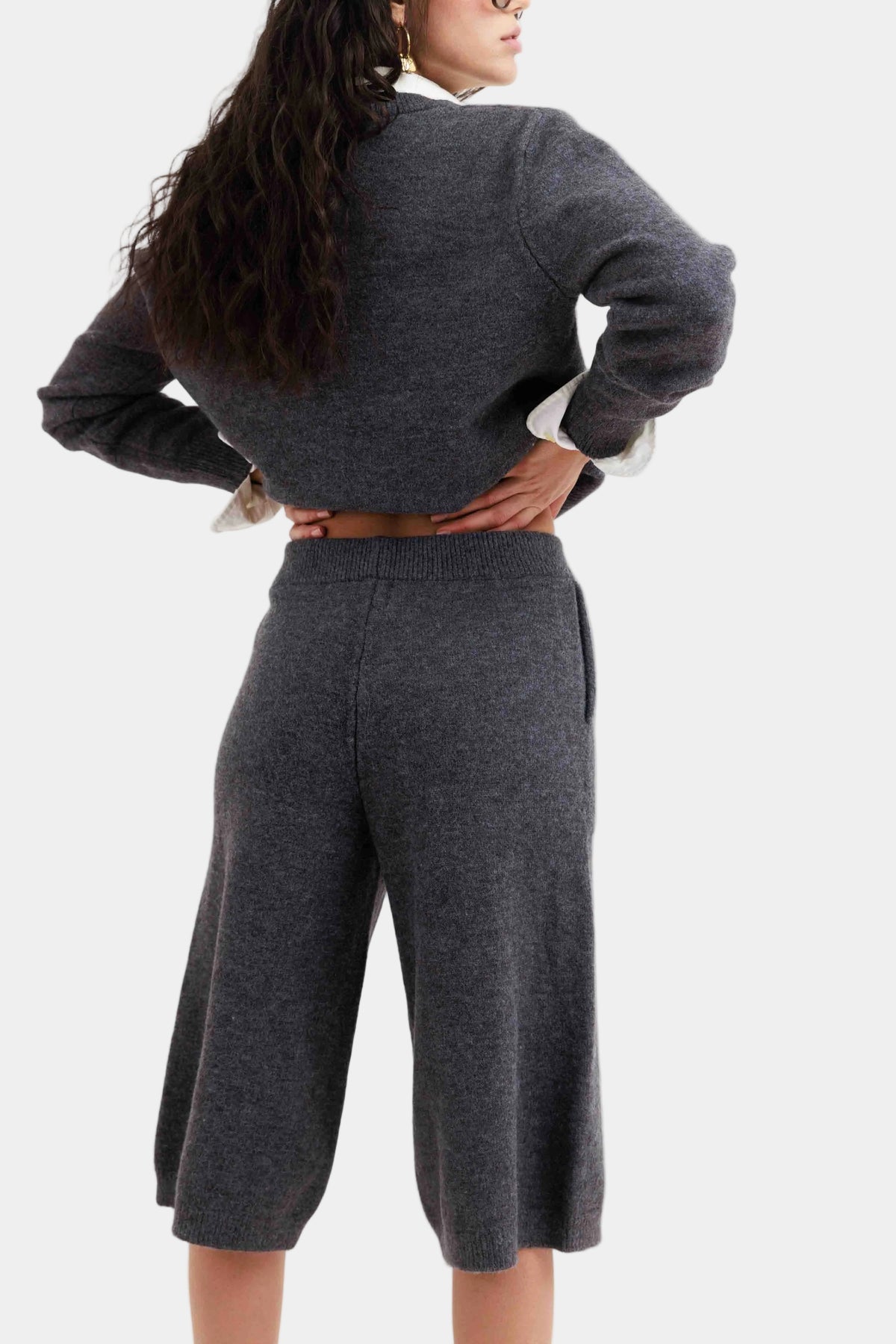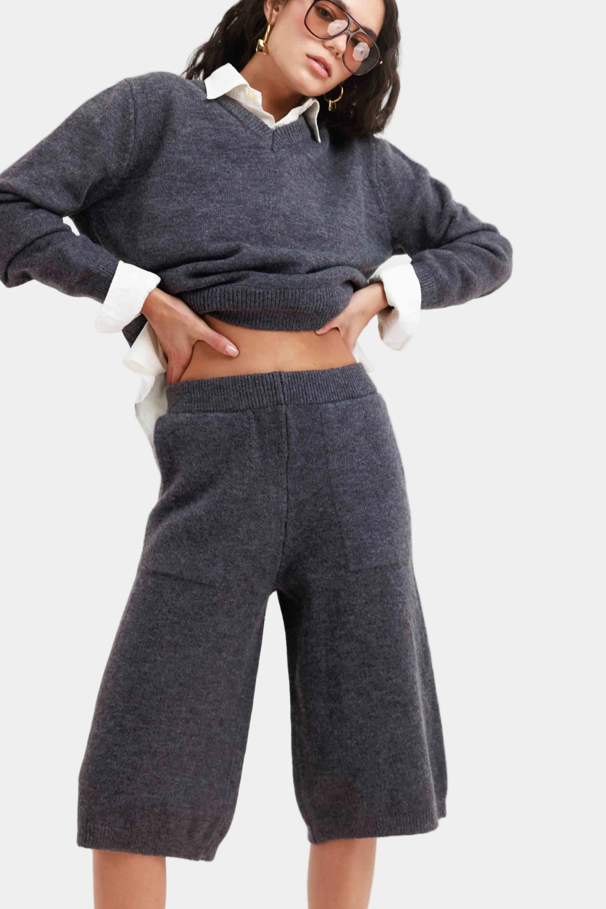 חליפת סריג רכה בגזרה משוחררת עם סוודר צווארון וי ומכנסי ברמודה תואמים למראה נקי ואלגנטי.
