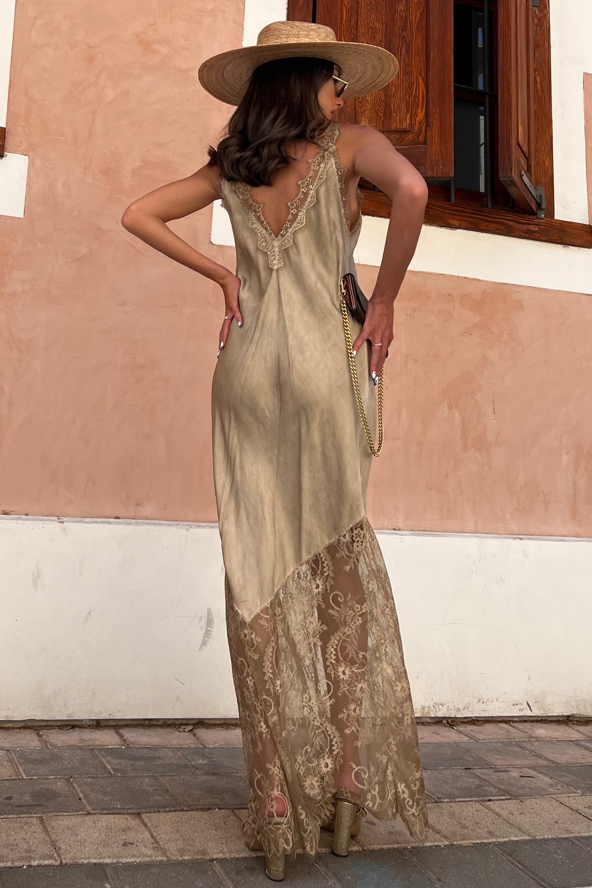 עם כתפיות דקות ומתכווננות, קו מחשוף וי ובד תחרה למטה