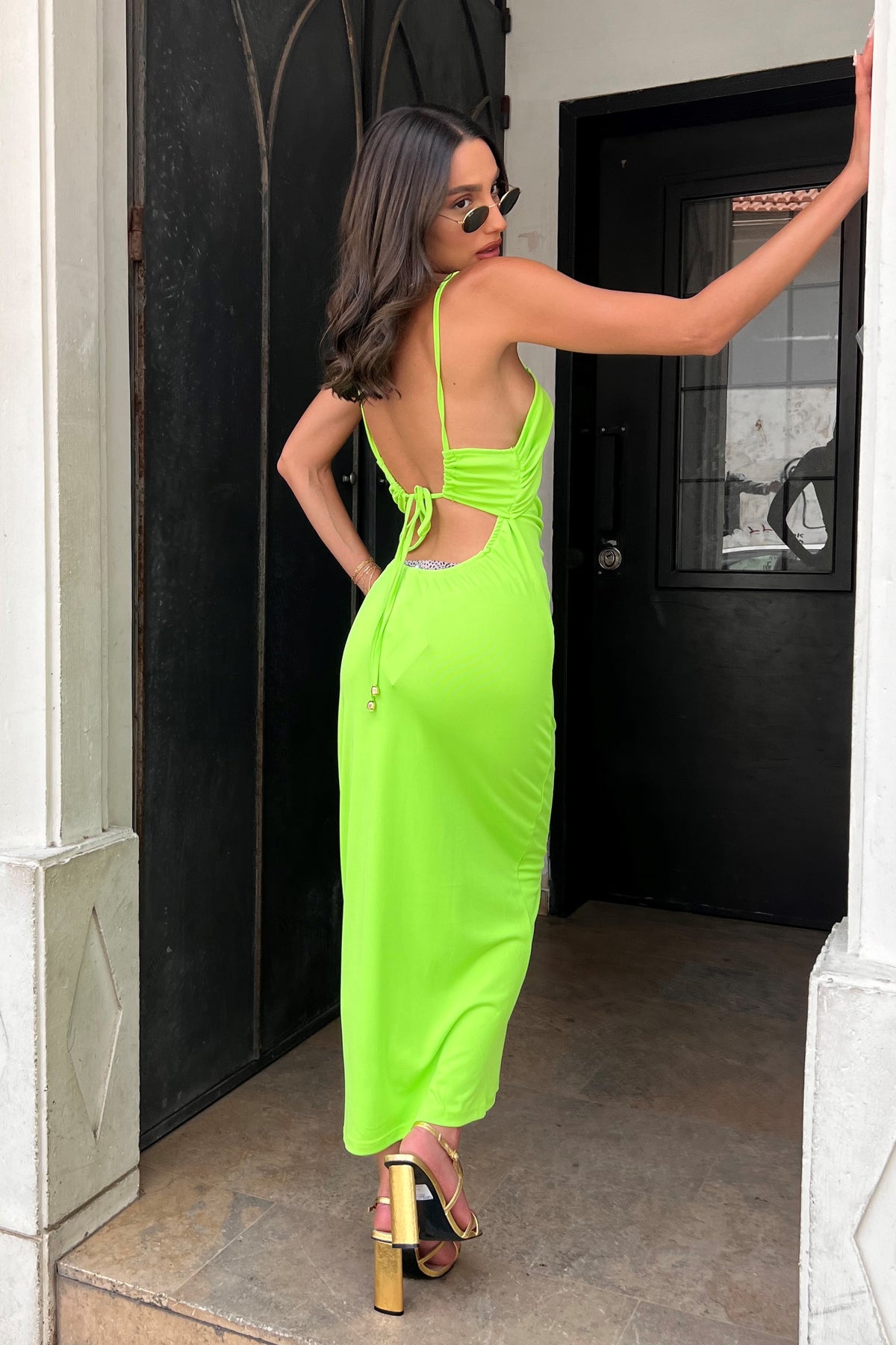 שמלה באורך מקסי עם פתחי קאט אאוט היסטריים, מחשוף עמוק וכתפיות דקות