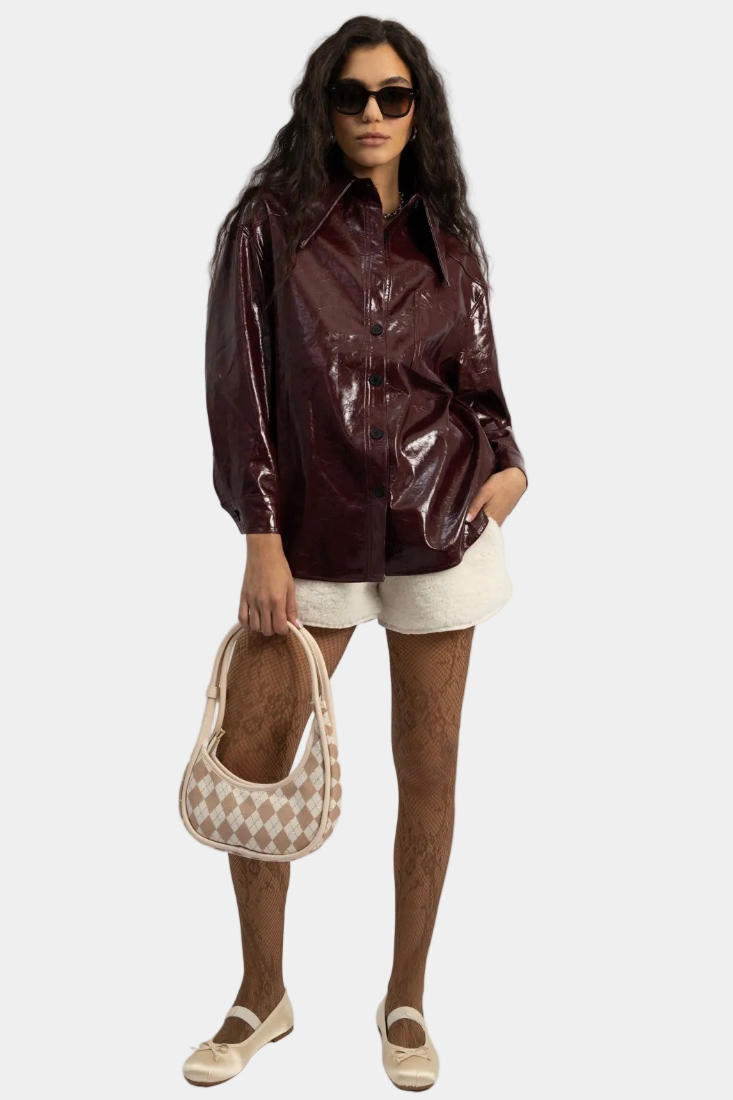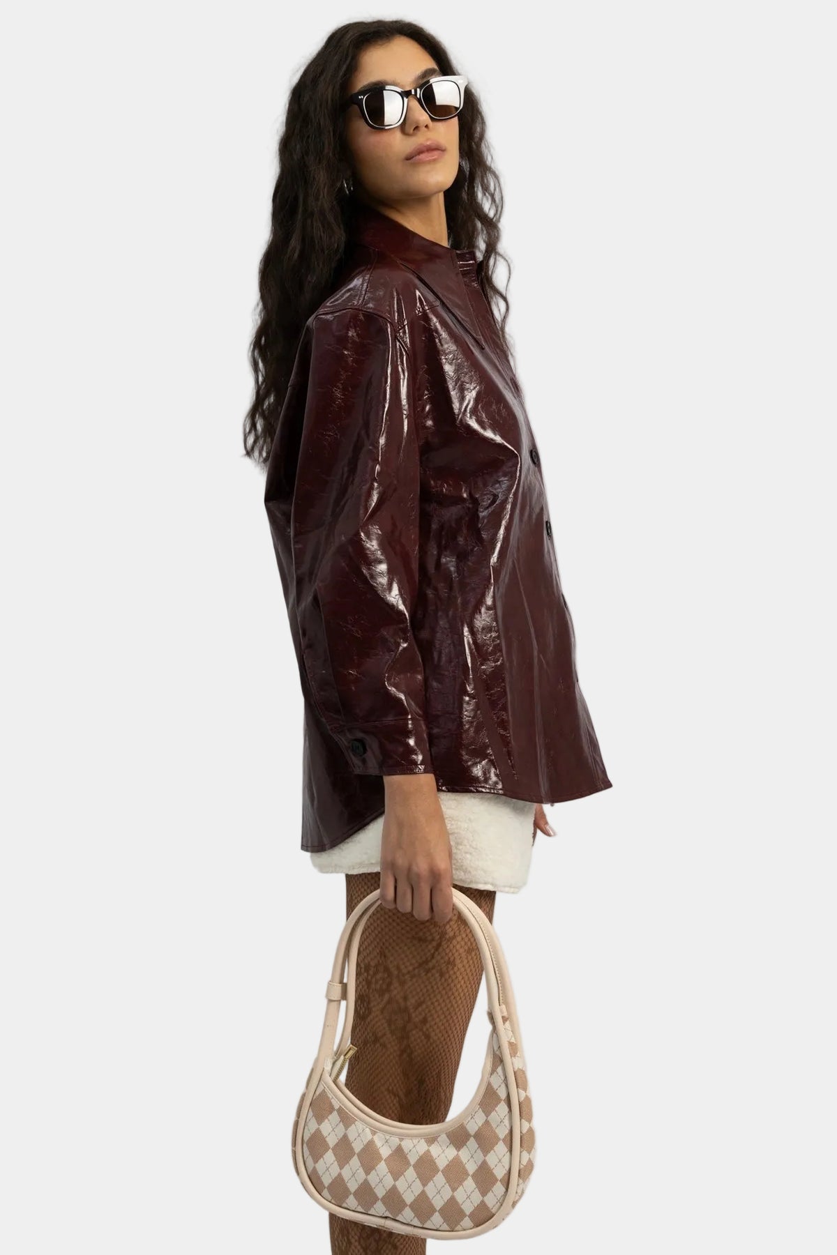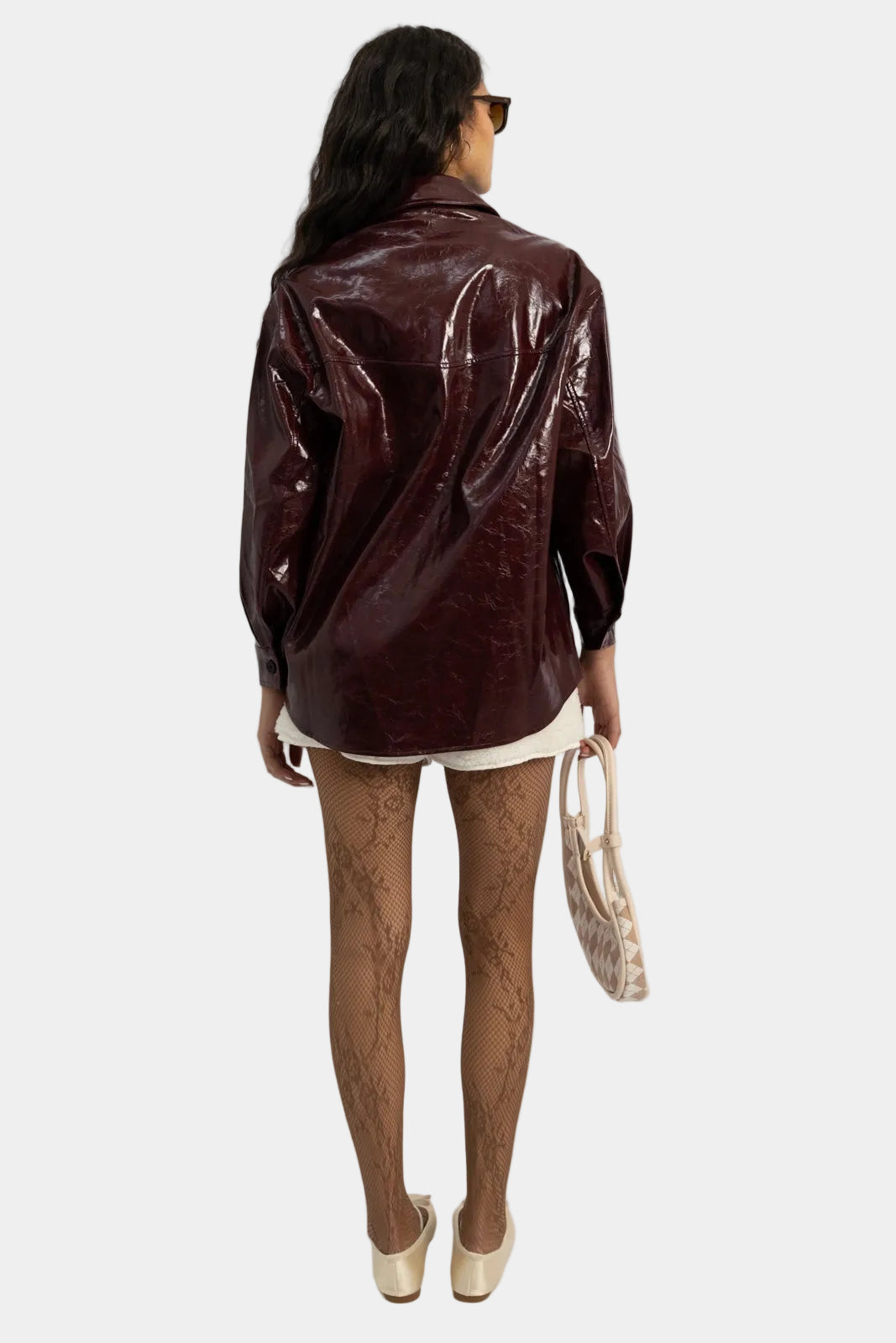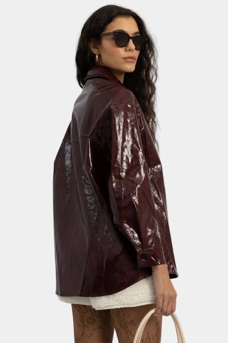 ז’קט דמוי עור בגימור מבריק עם סגירת כפתורים וגזרה משוחררת.