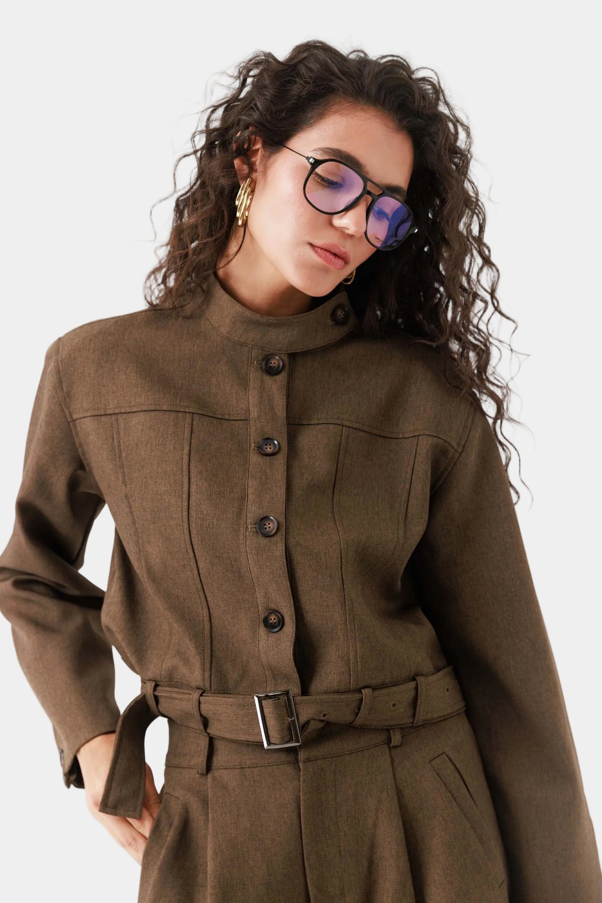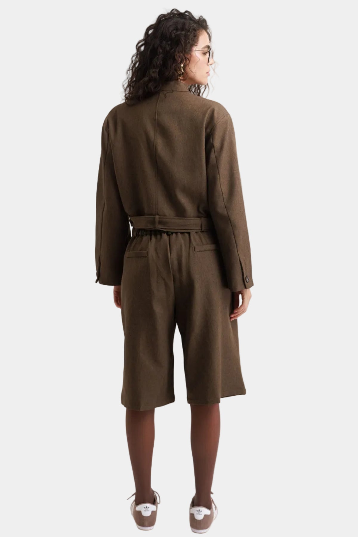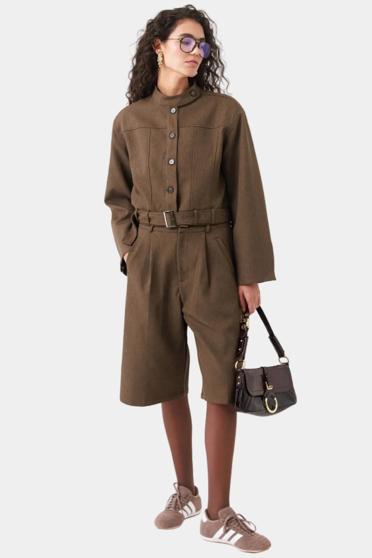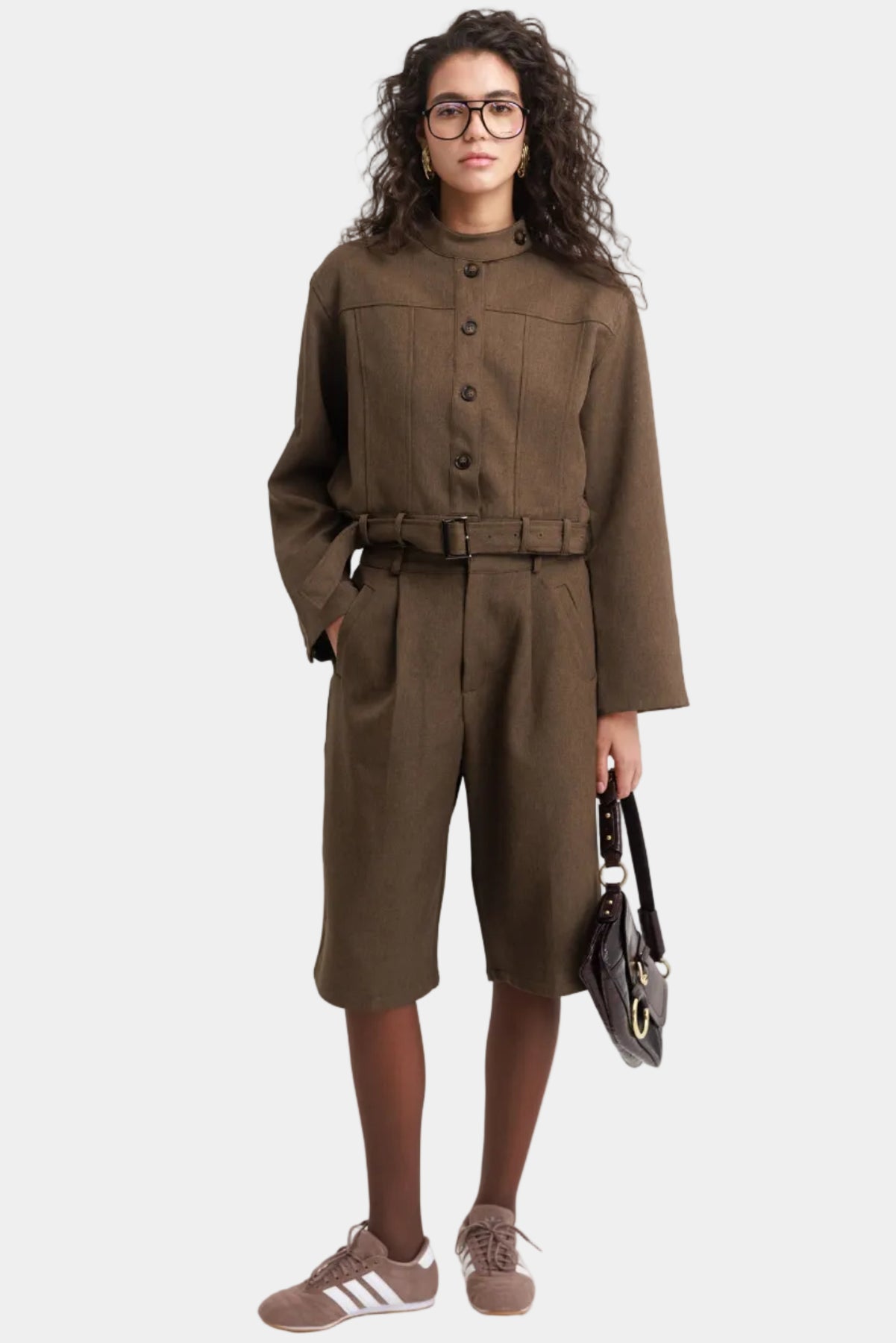 חליפה בגזרה משוחררת עם ז’קט קצר ומכנסי ברמודה רחבים למראה מודרני ונקי.