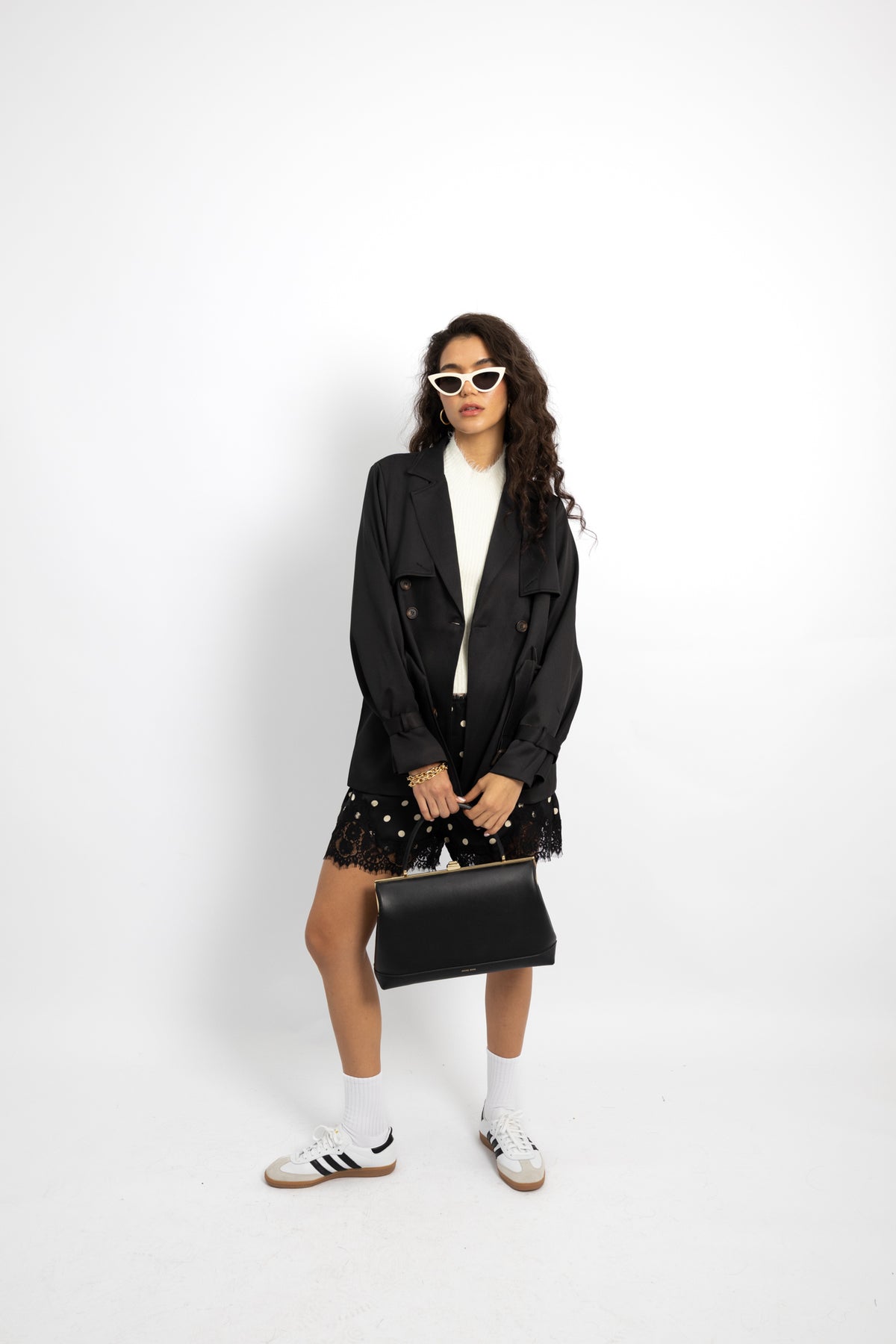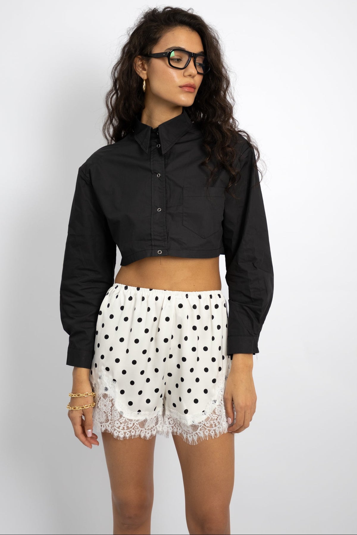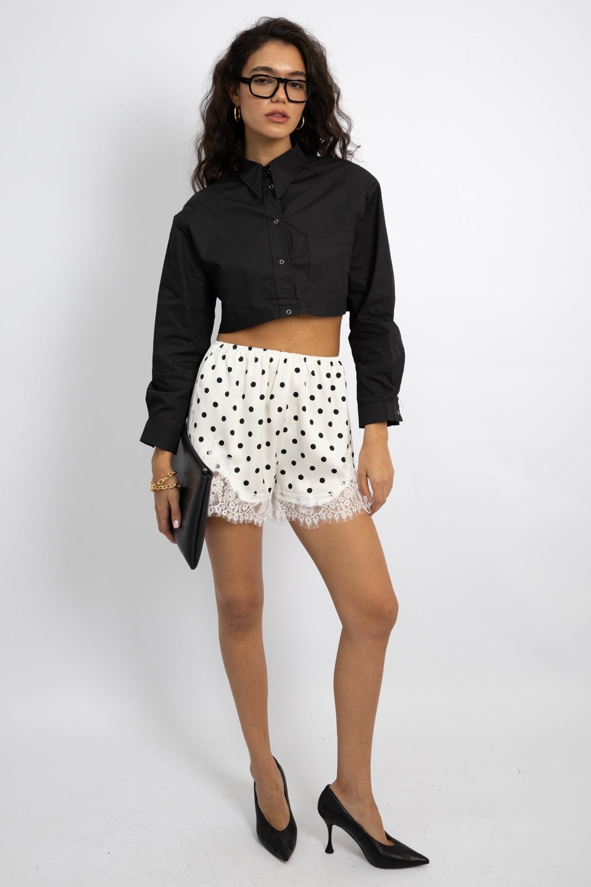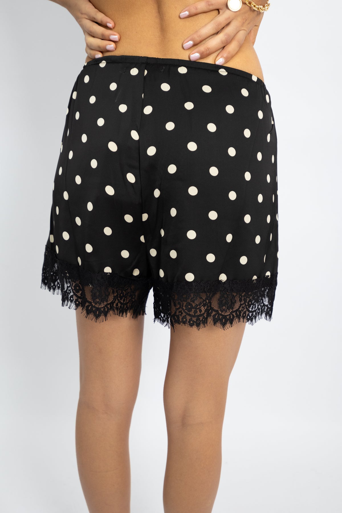 מכנס שורט קליל עם גומי במותן, בד נשפך ותחרה עדינה למראה אלגנטי ונוח ליום ולערב. OS מתאים ל־34–40 | צבעים: שחור עם נקודות לבן, לבן עם נקודות שחור