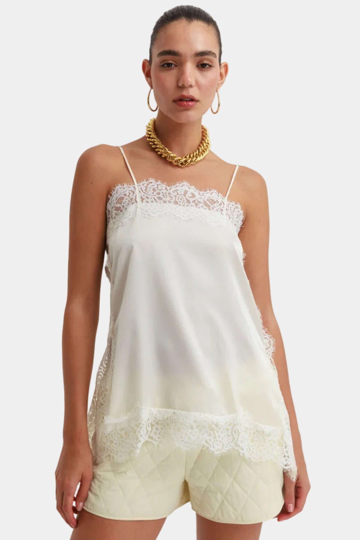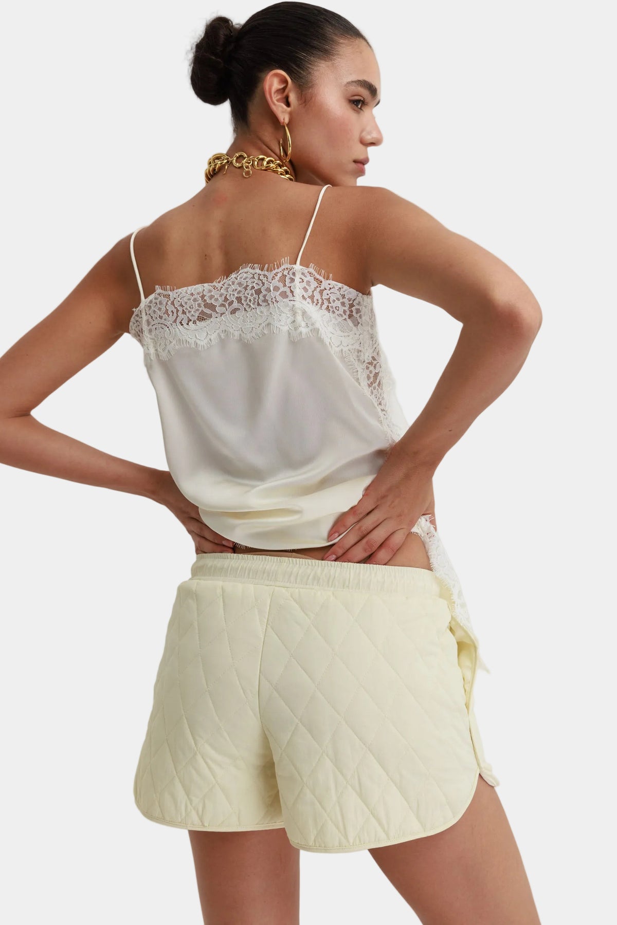 שורט קצר מבד קווילט רך ומרופד, עם תפרי מעוינים לכל אורכוהבד קליל ונעים, עם גומי נוח במותן ושרוך לקשירה להתאמה מושלמתהגזרה משוחררת ויומיומית, עם שסעים מעוגלים בצדדים וכיסים נוחים