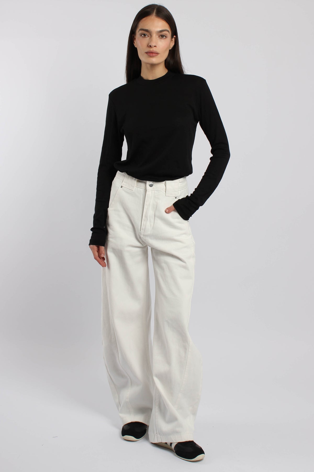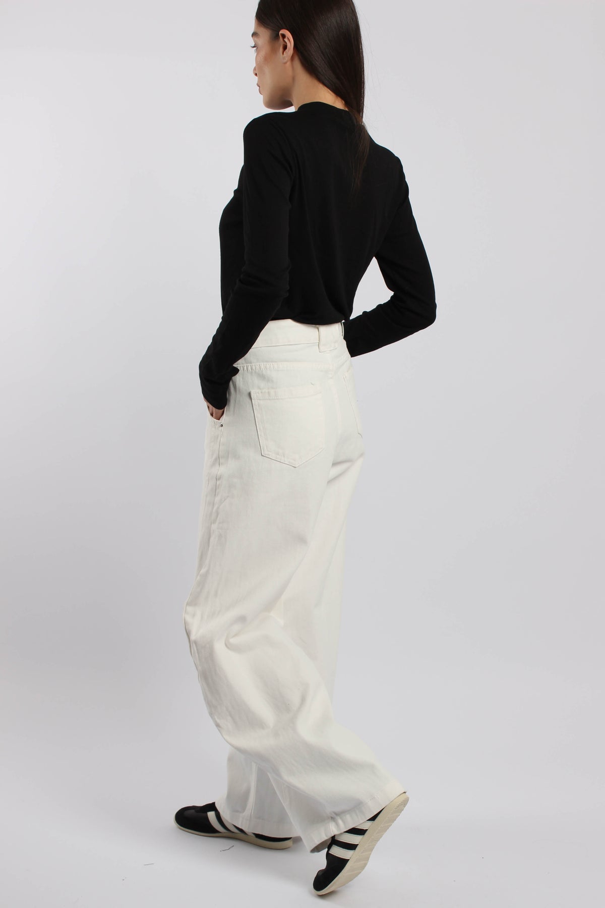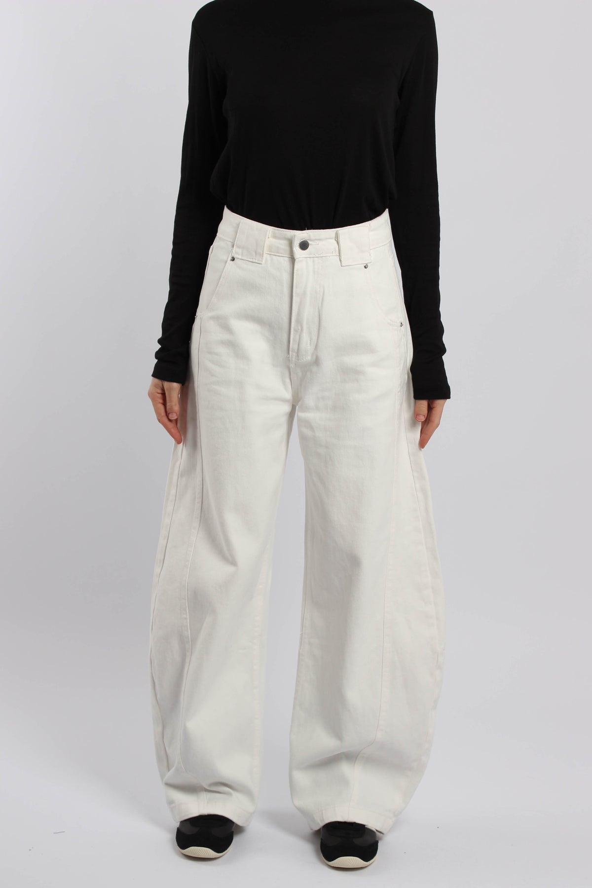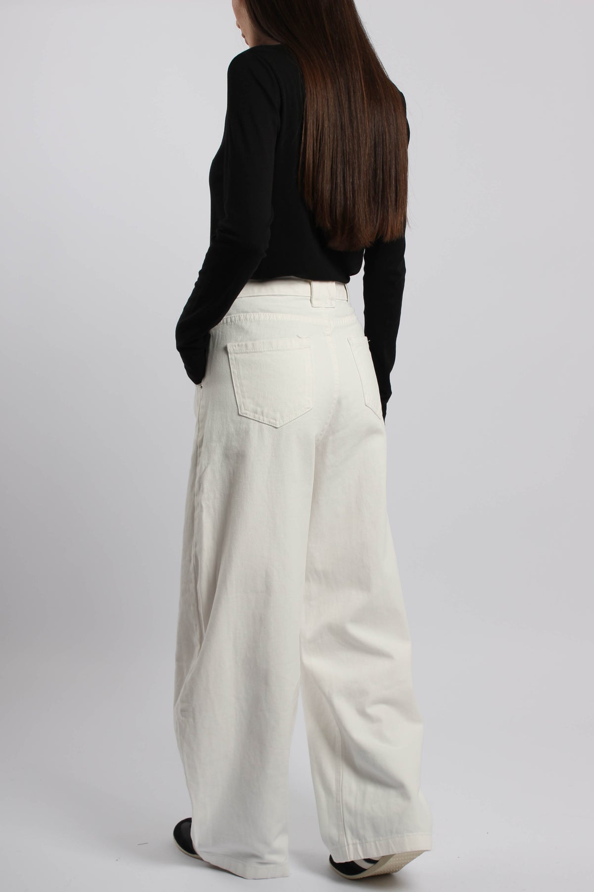ג׳ינס בגזרה רחבה עם מותן גבוהה וישיבה נינוחה, עשוי דנים רך בגוון בהיר למראה יומי טבעי ומחמיא.