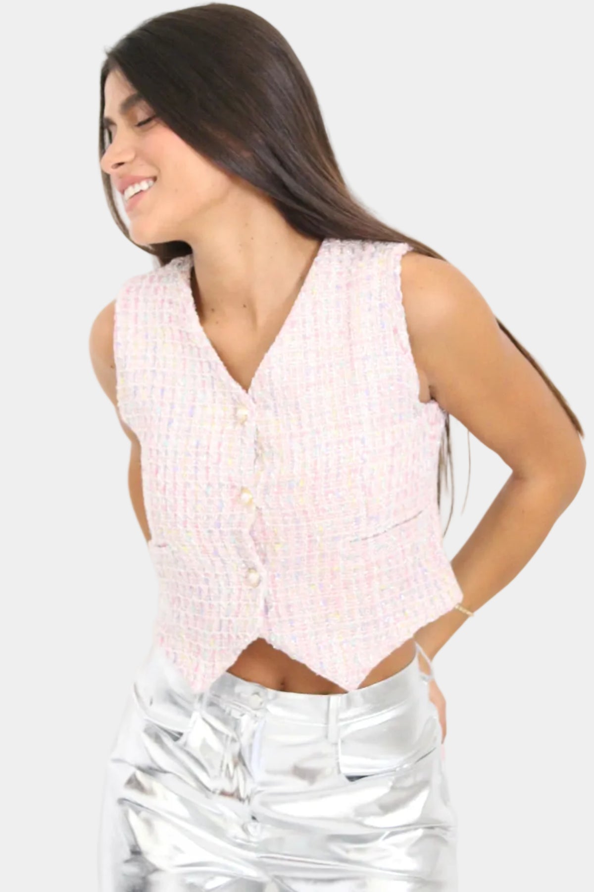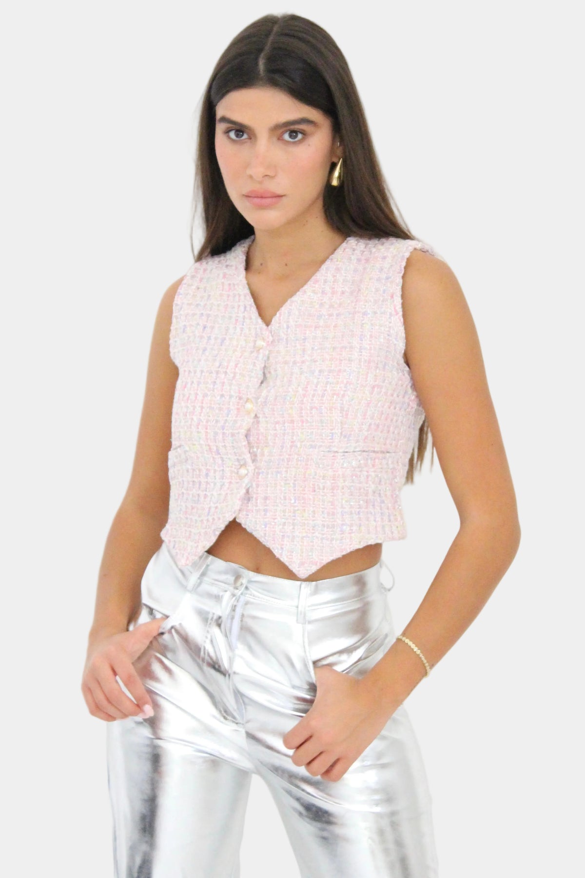 וסט קרופ ללא שרוולים בגזרה מחויטת, בד טוויד עדין עם סגירת כפתורים קדמית ומפתח V.