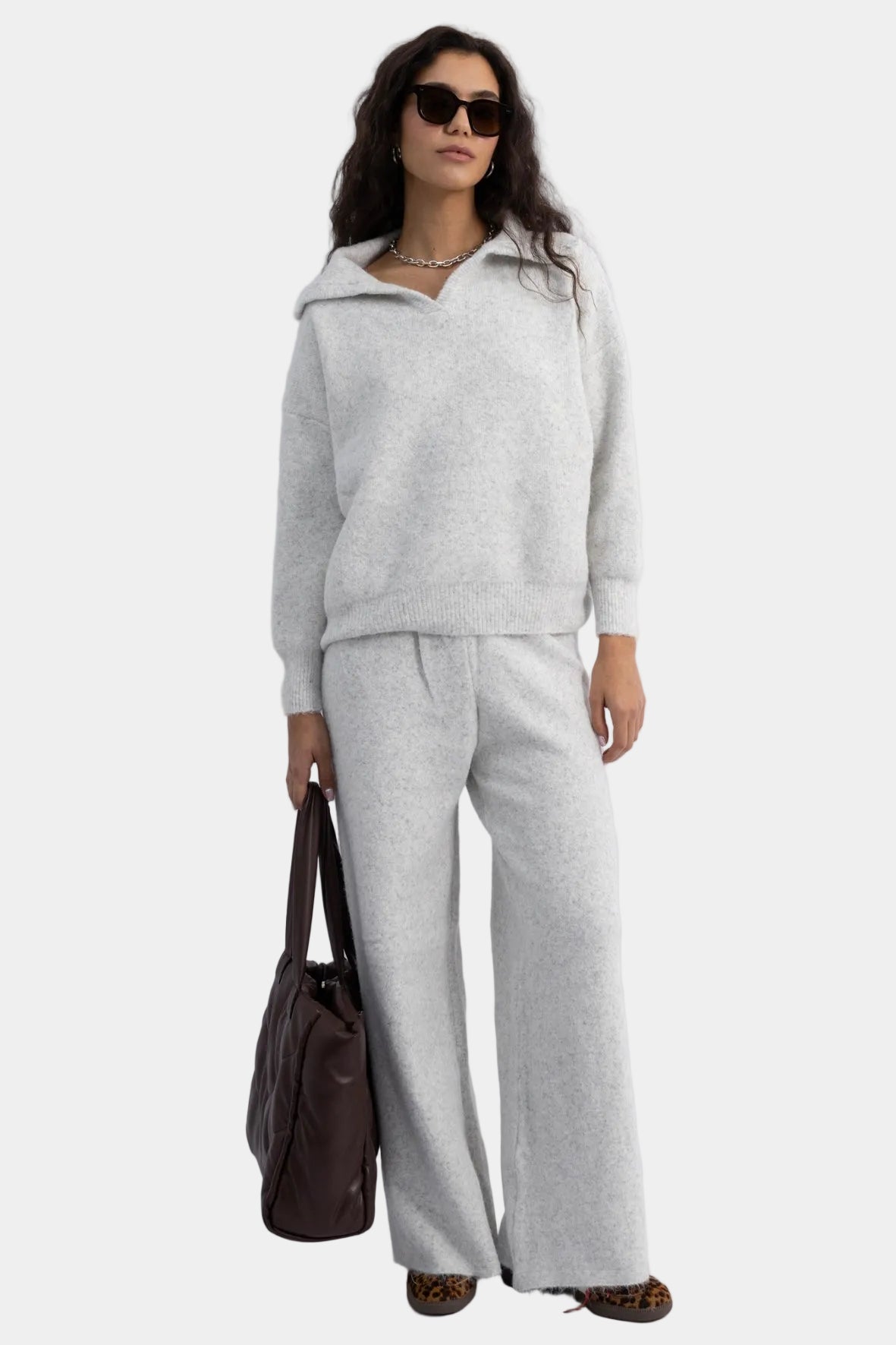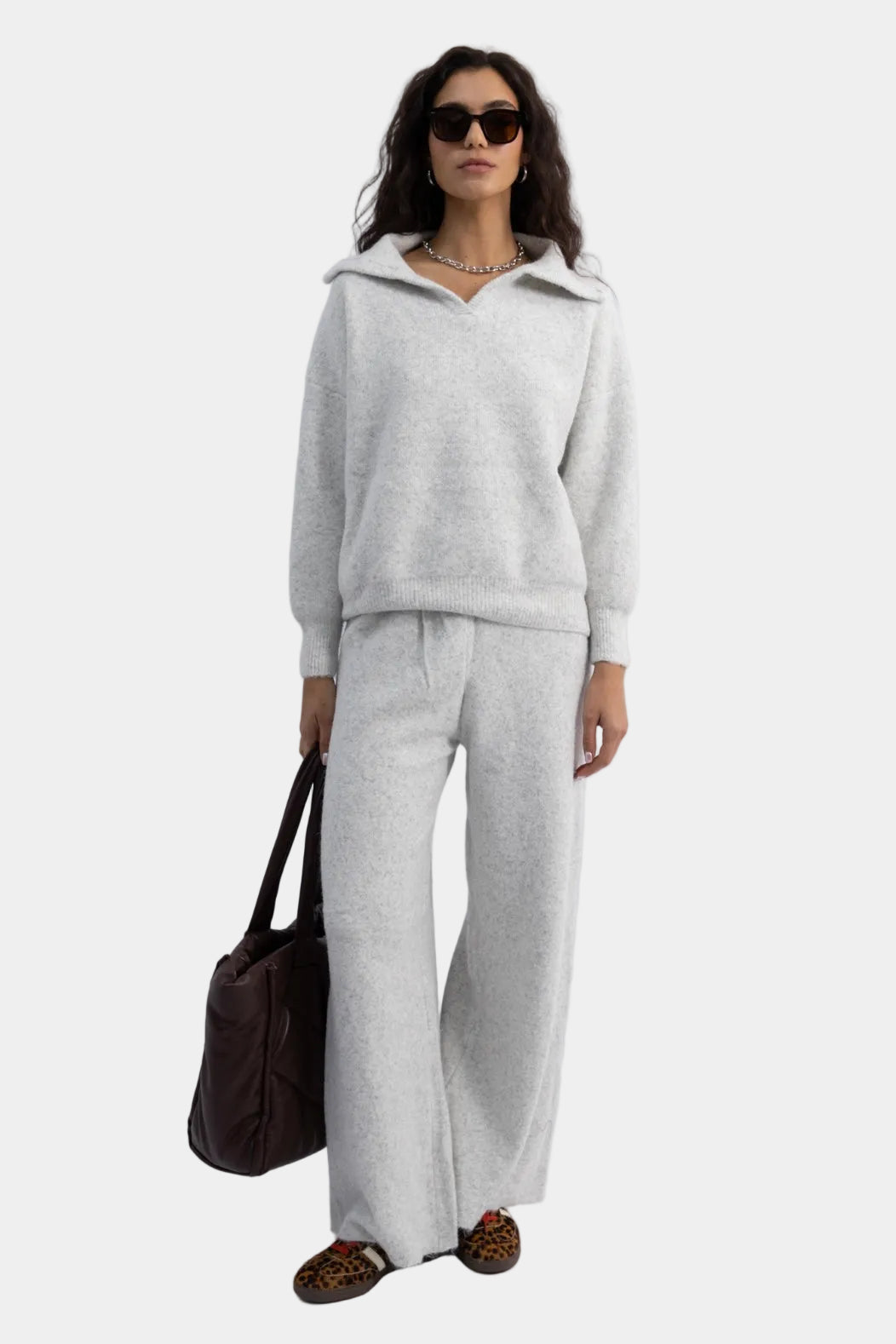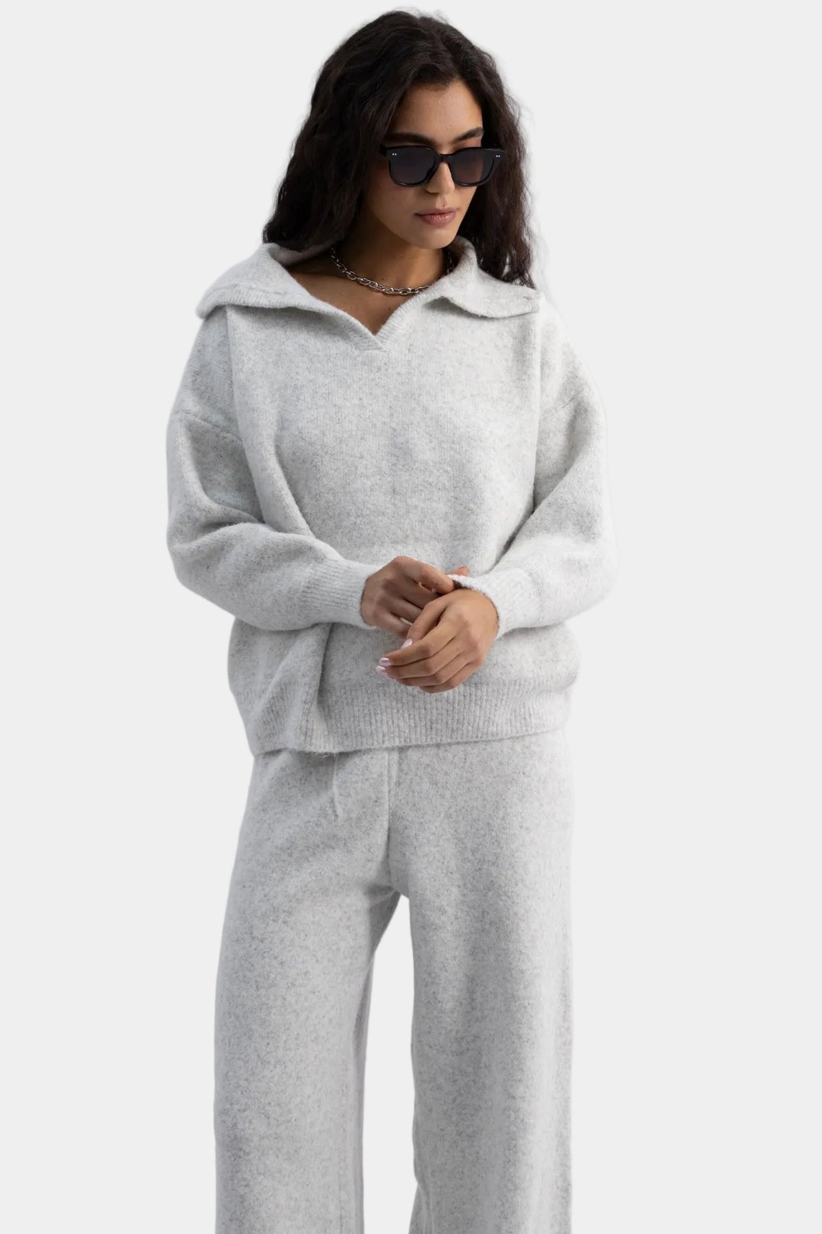 חליפת סריג רכה בגזרה משוחררת עם סוודר צווארון פתוח ומכנסיים רחבים תואמים.