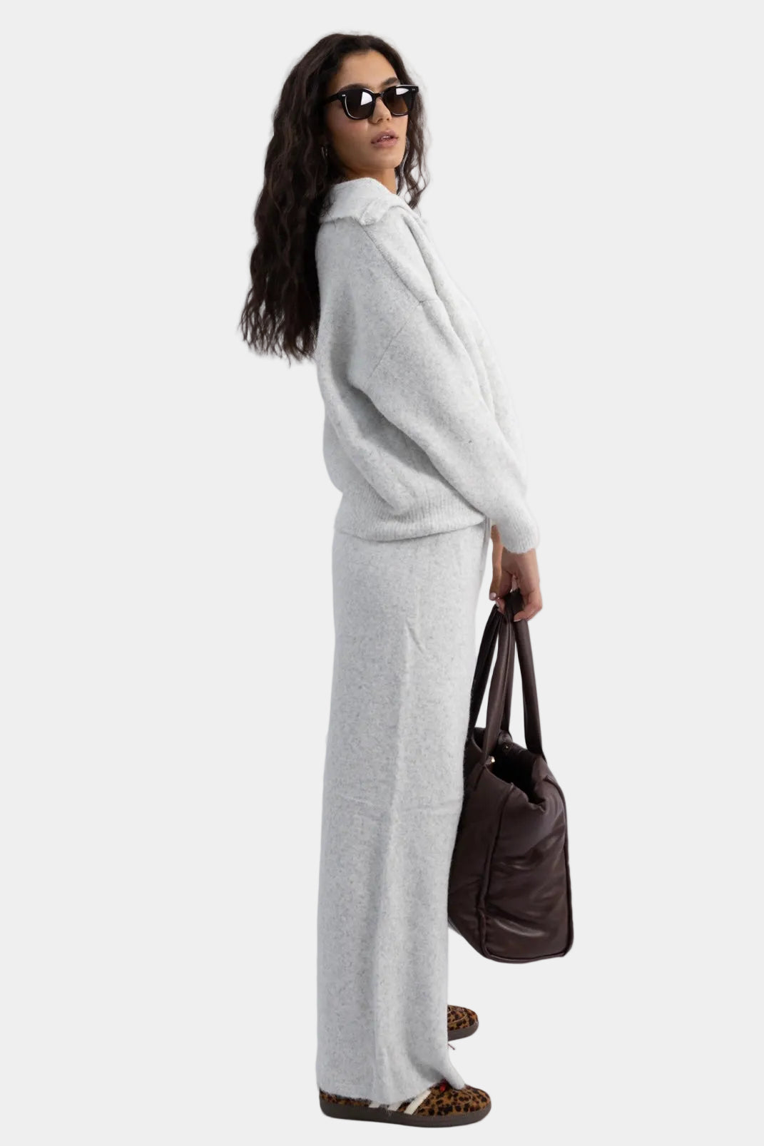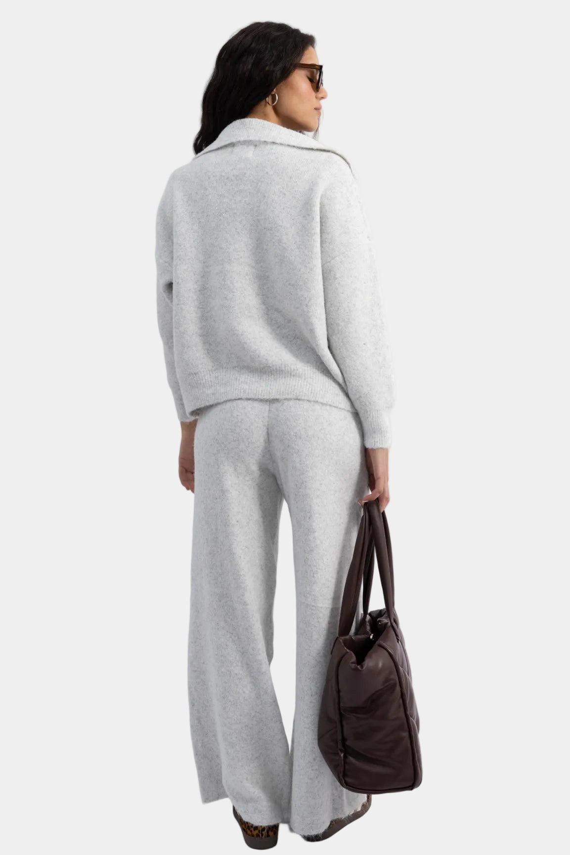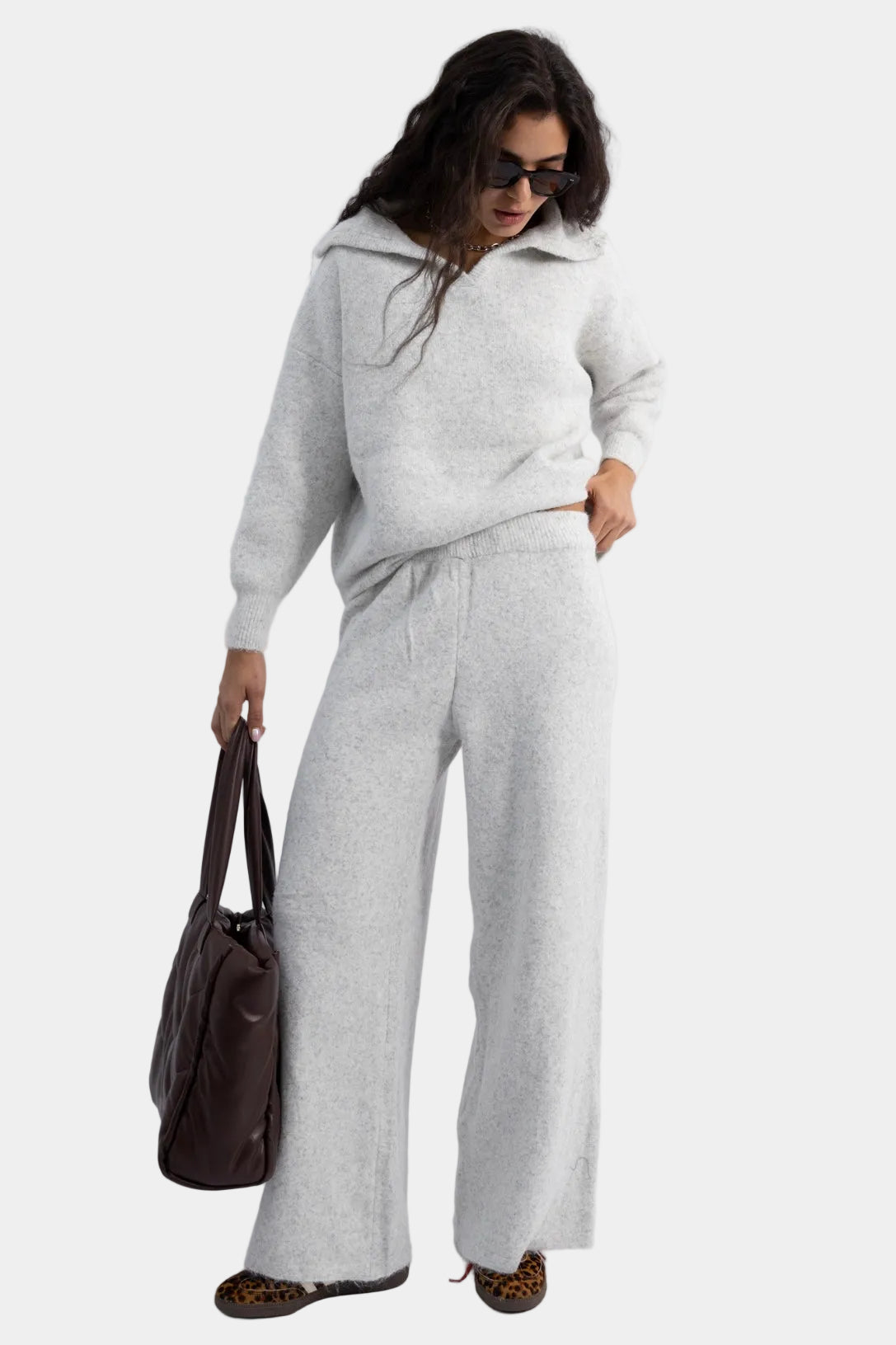 חליפת סריג רכה בגזרה משוחררת עם סוודר צווארון פתוח ומכנסיים רחבים תואמים.