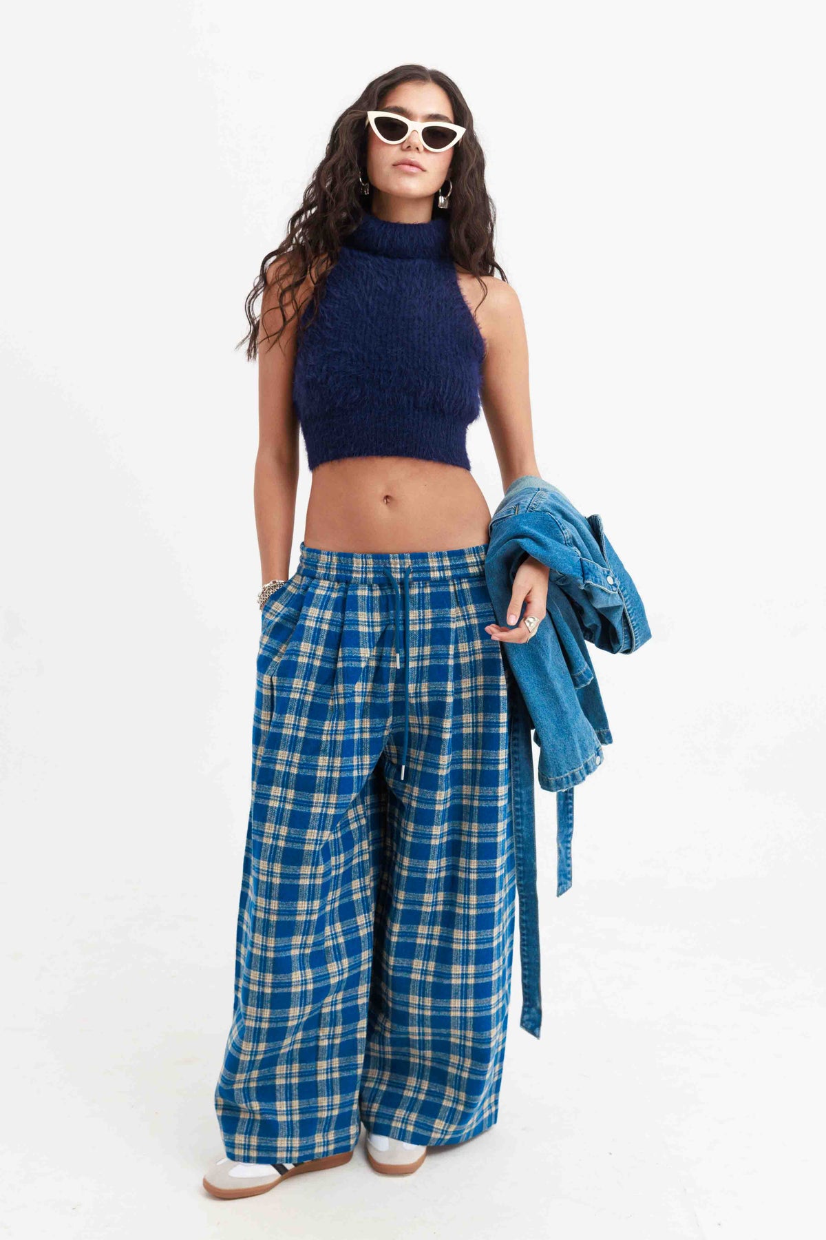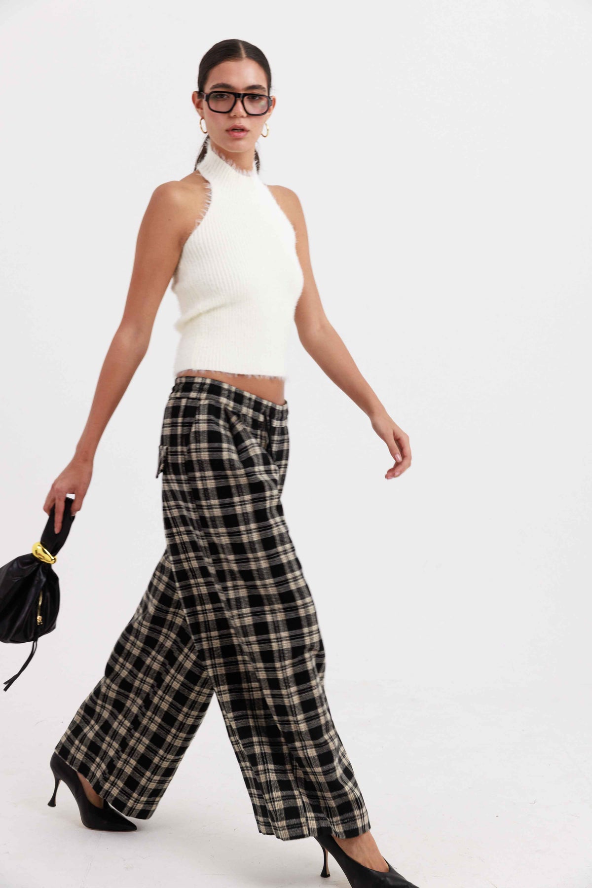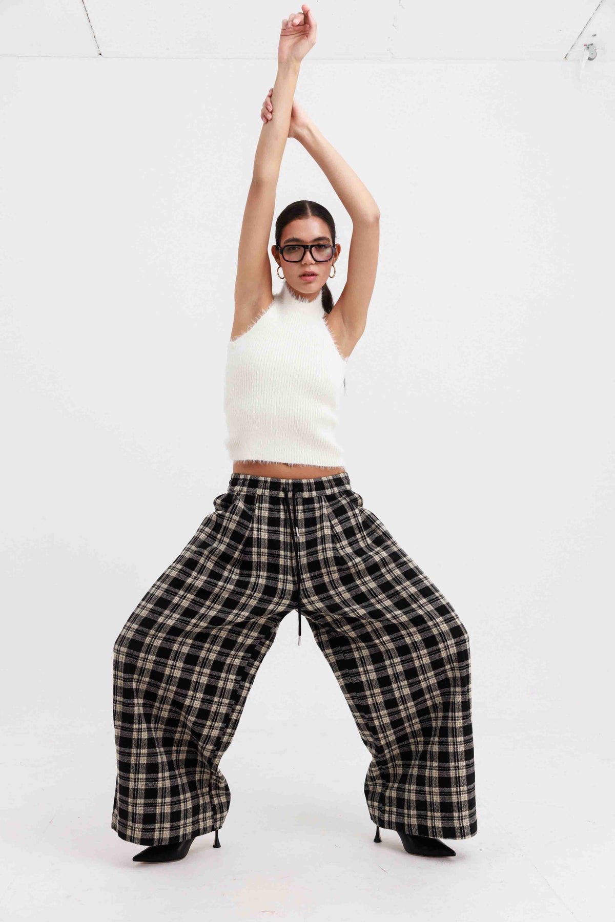 מכנסיים רחבים בגזרת אוברסייז עם מותן אלסטית, שרוך וכיווץ עדיןעשויים בד צמר קשיח משובץ