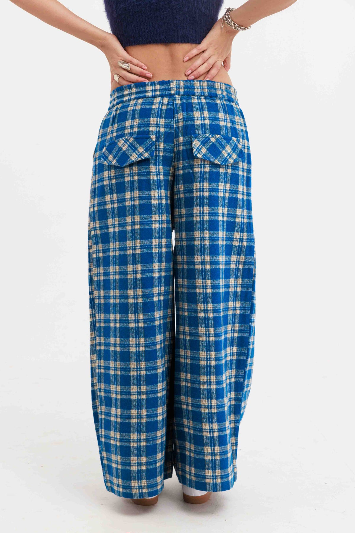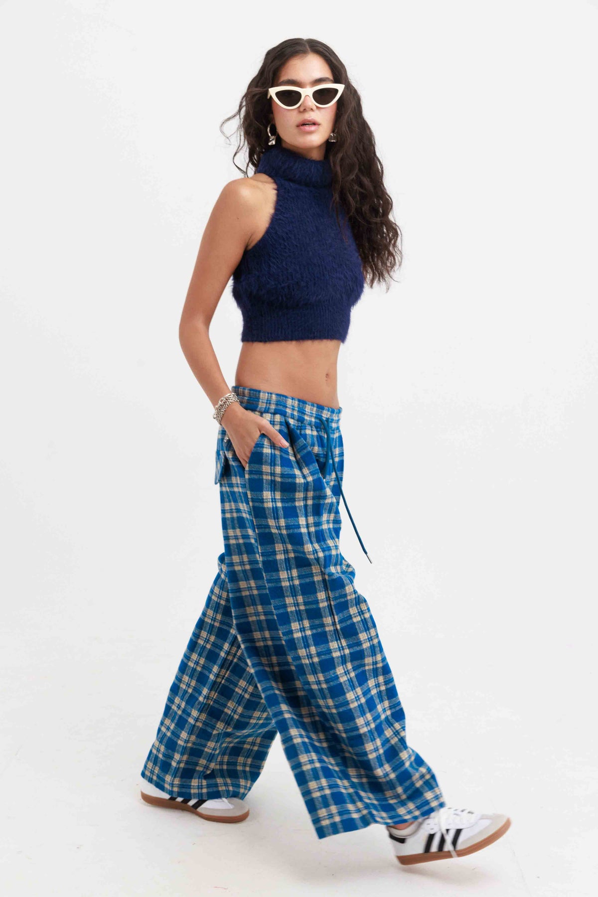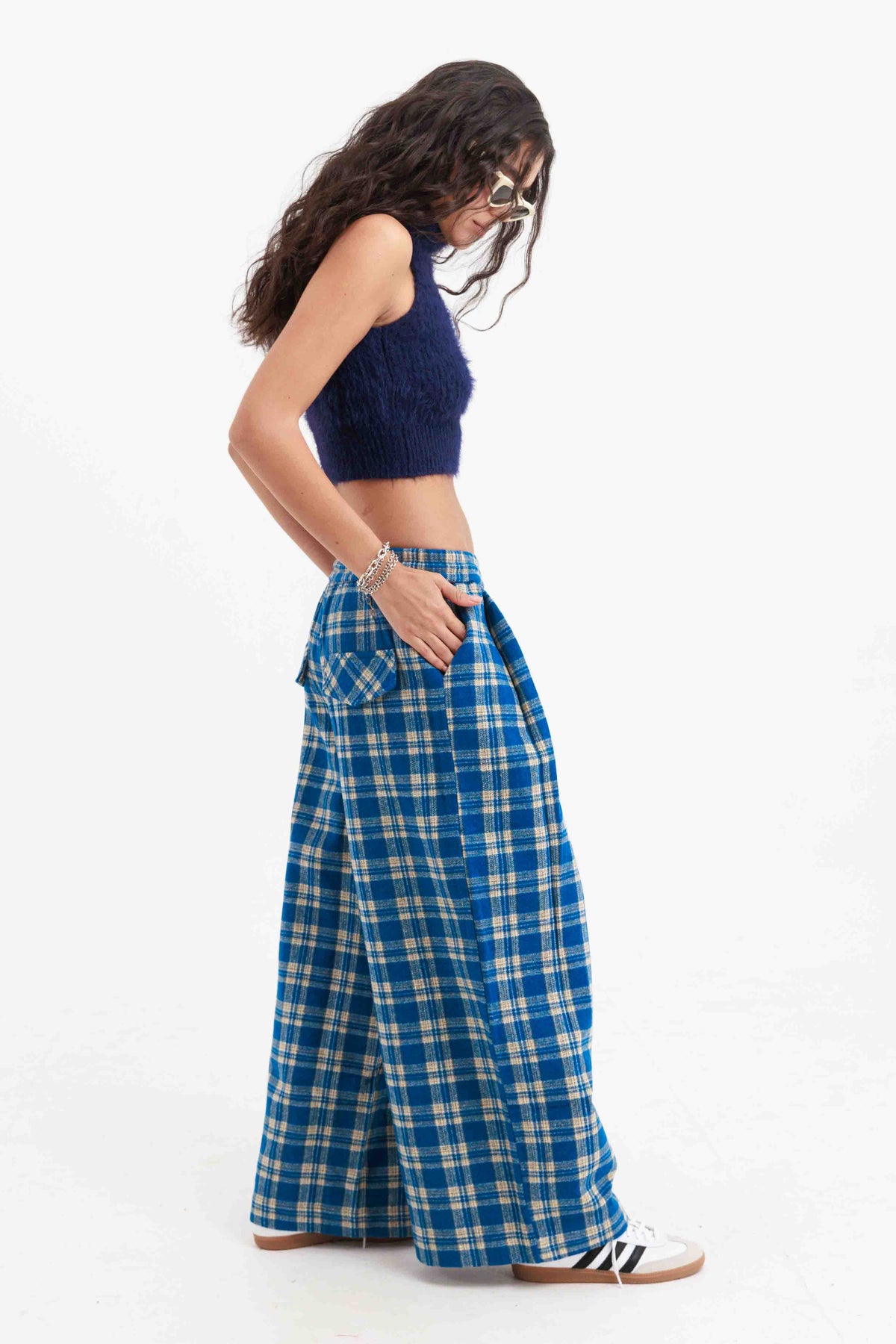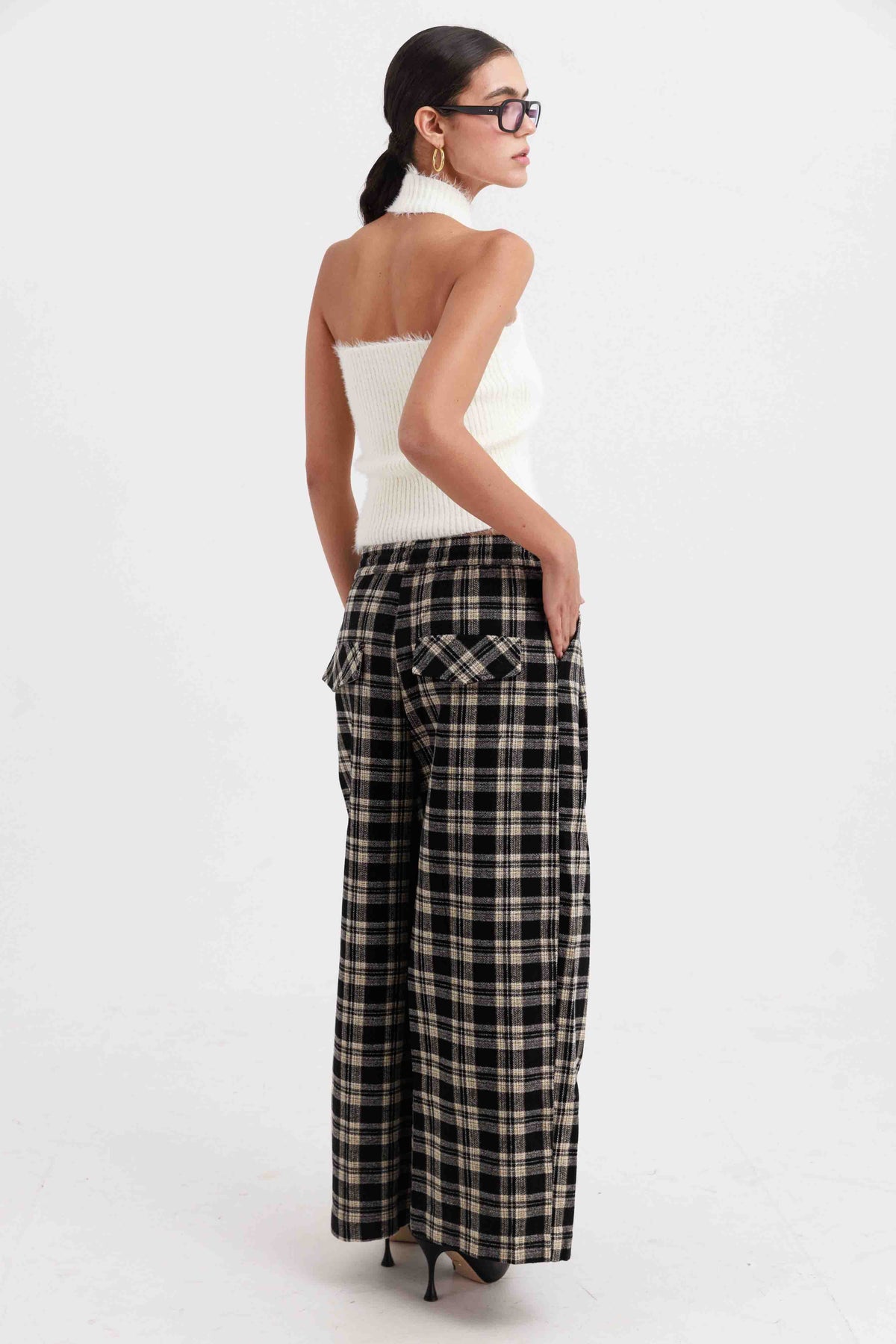 מכנסיים רחבים בגזרת אוברסייז עם מותן אלסטית, שרוך וכיווץ עדיןעשויים בד צמר קשיח משובץ