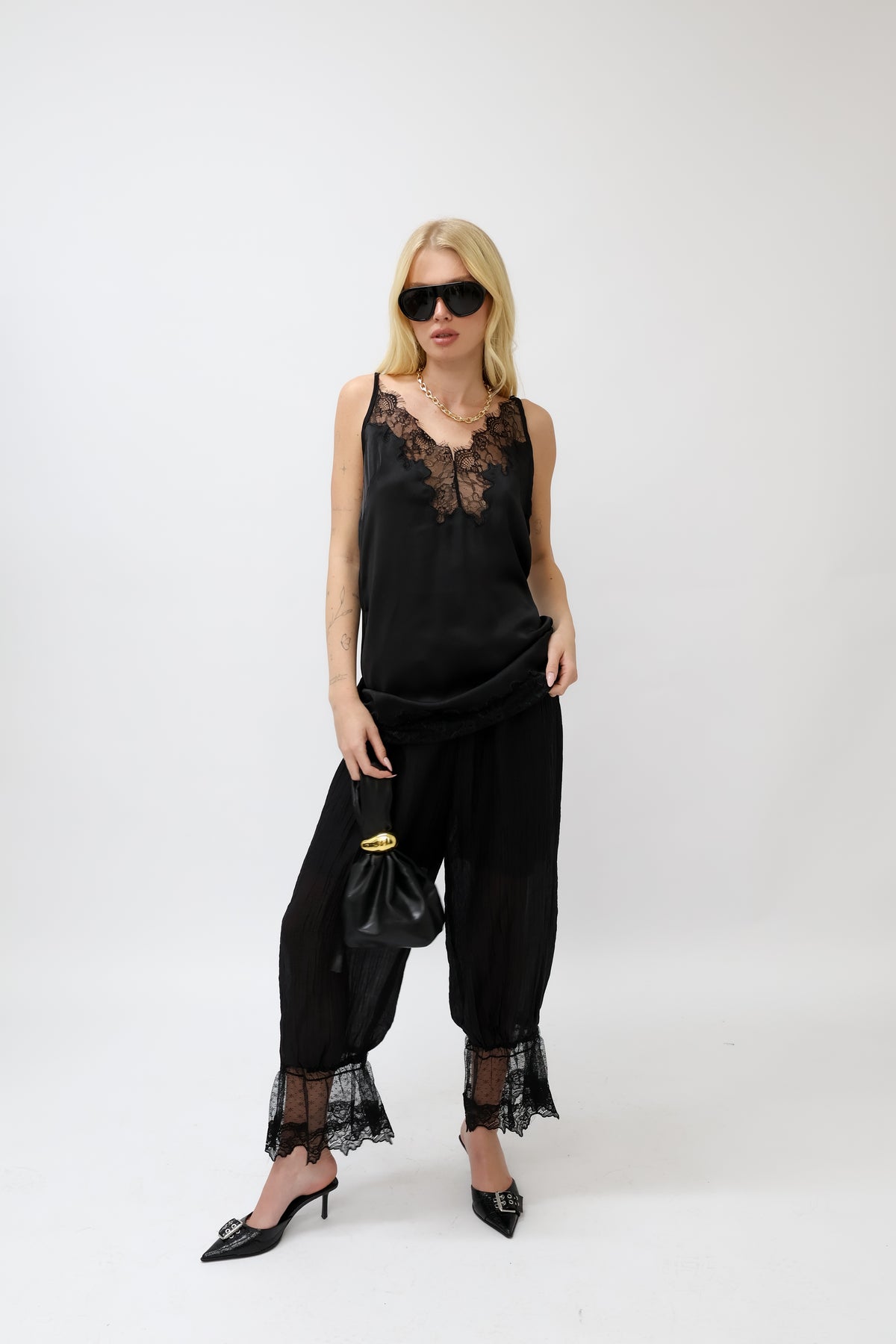 מכנסיים שחורים שקפקפים דקיקים בסגנון בוהו שיק, אורך 7/8 וסיומת תחרה