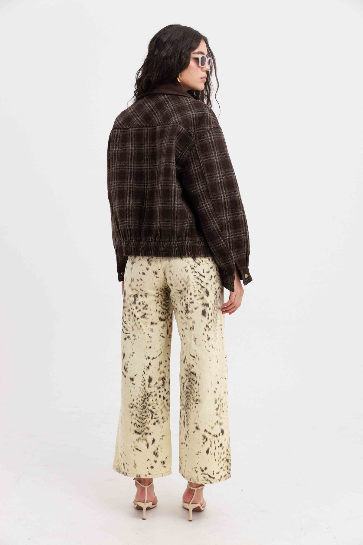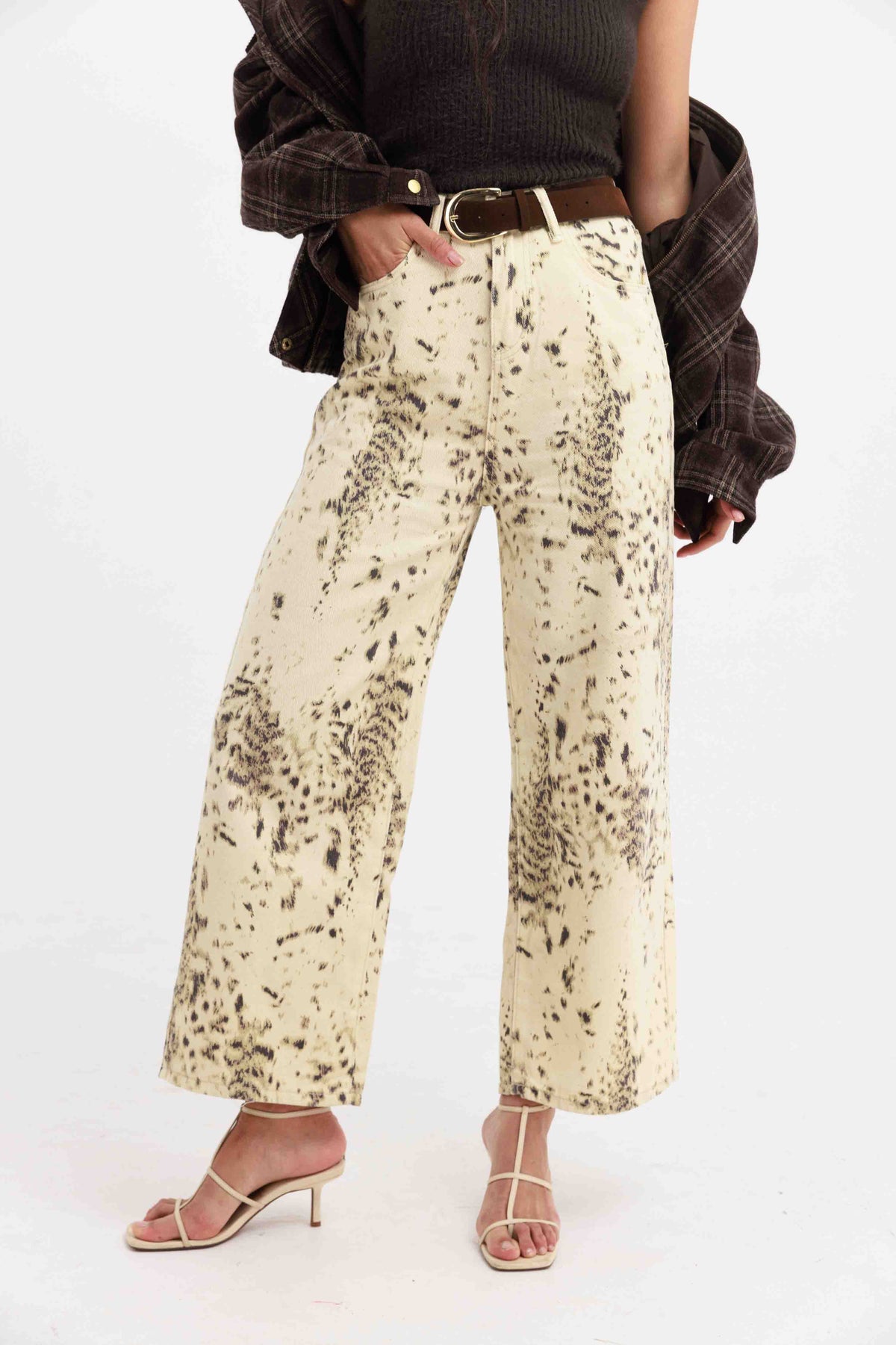 מכנסי ג׳ינס בגזרה רחבה עם הדפס בסגנון טאי-דאי עדין, המעניק למכנסיים מראה אקלקטי וצבעוני