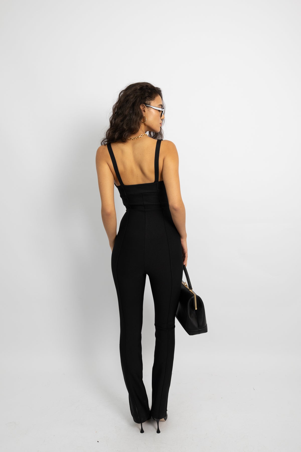 אוברול שחור מחטב עם פתיחה עדינה בחזה ובד נמתח שמחמיא לגוף ויושב צמוד במידה מדויקת. S-34–36 | M-38 | L-40 | מגיע במידות