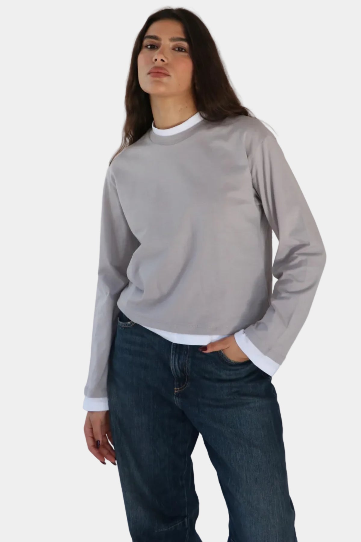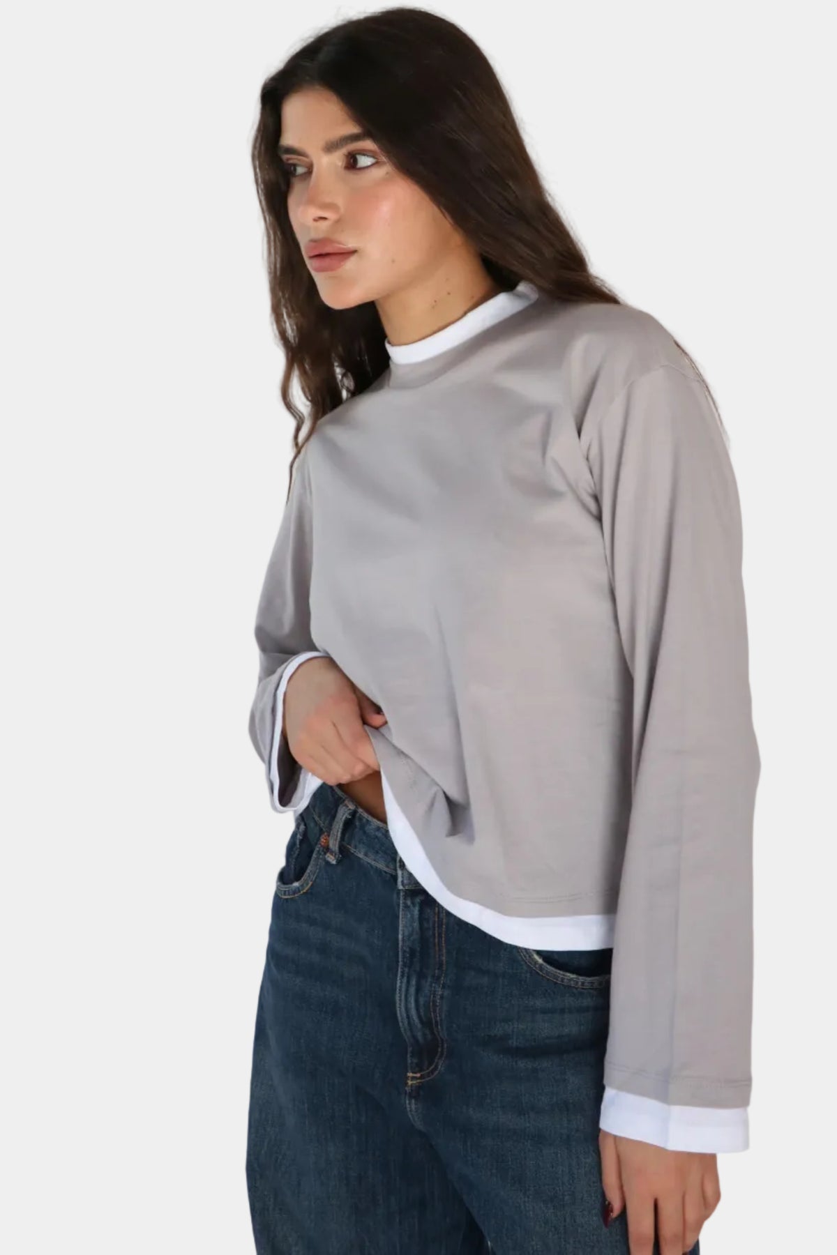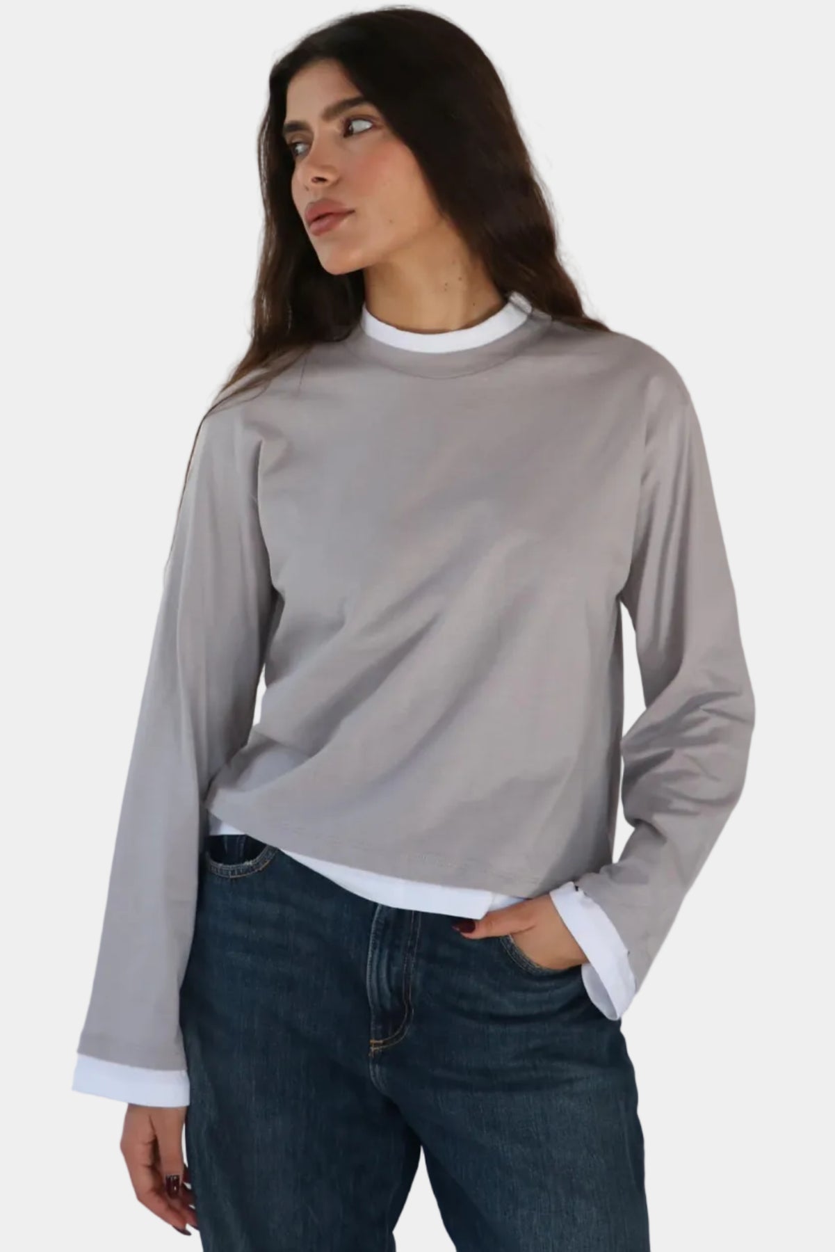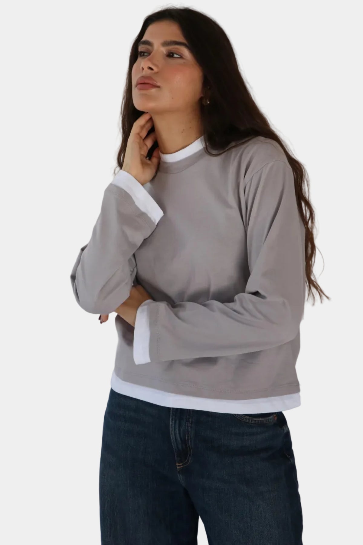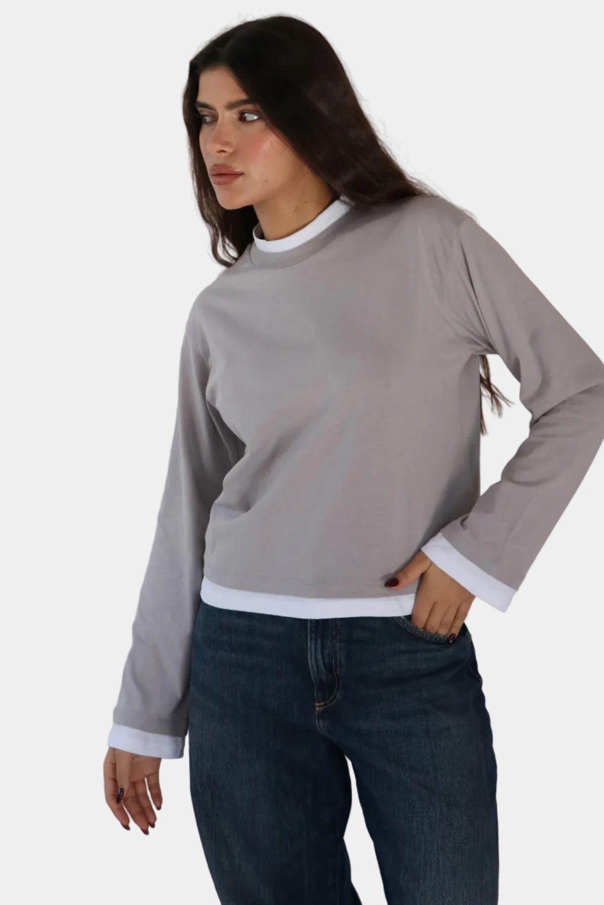 חולצה ארוכה בגזרה נקייה עם מראה שכבות מובנה, צווארון עגול ושרוולים ארוכים עם סיומת לבנה. לוק מינימליסטי ומדויק שמתאים ליום־יום.