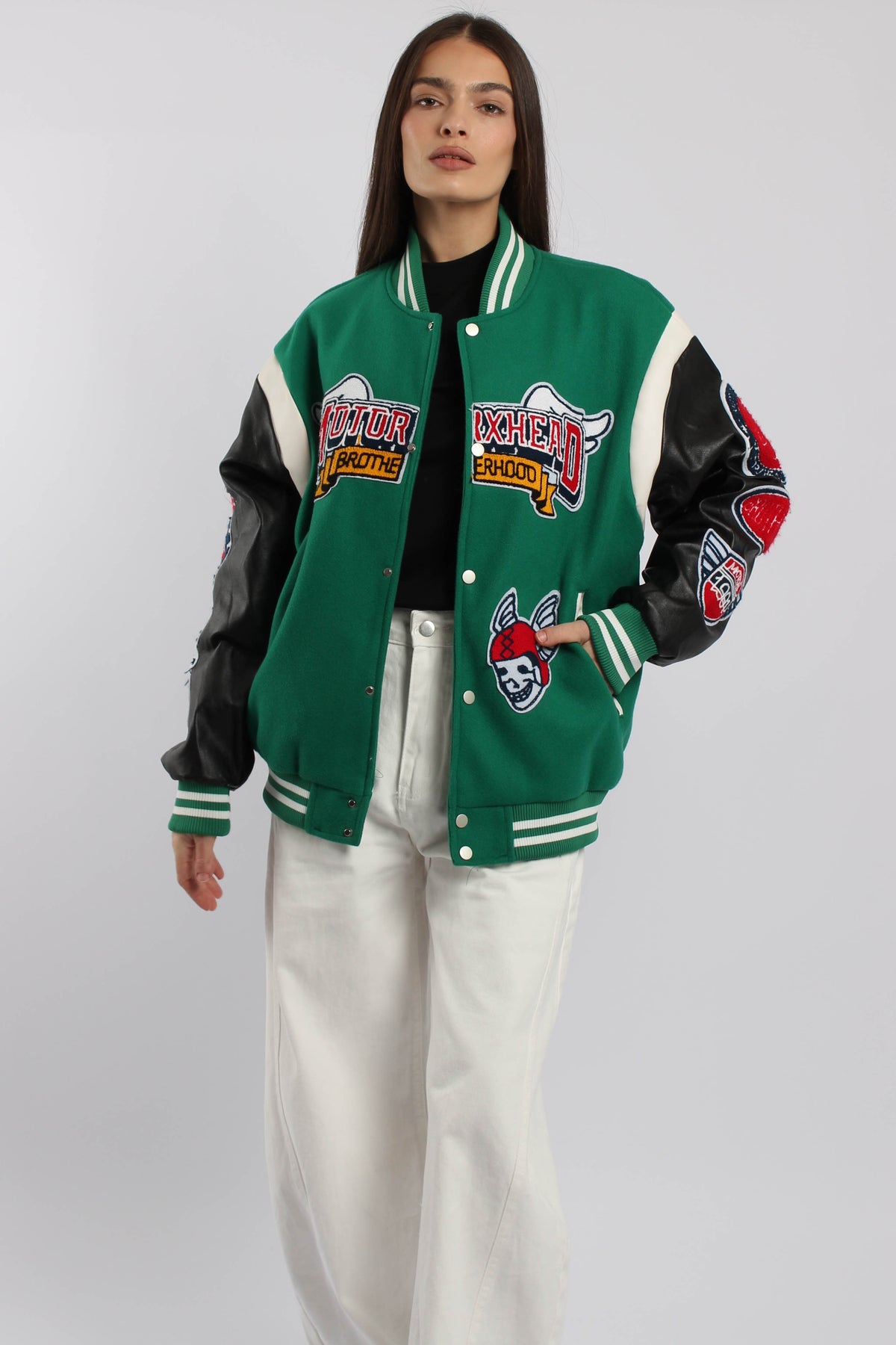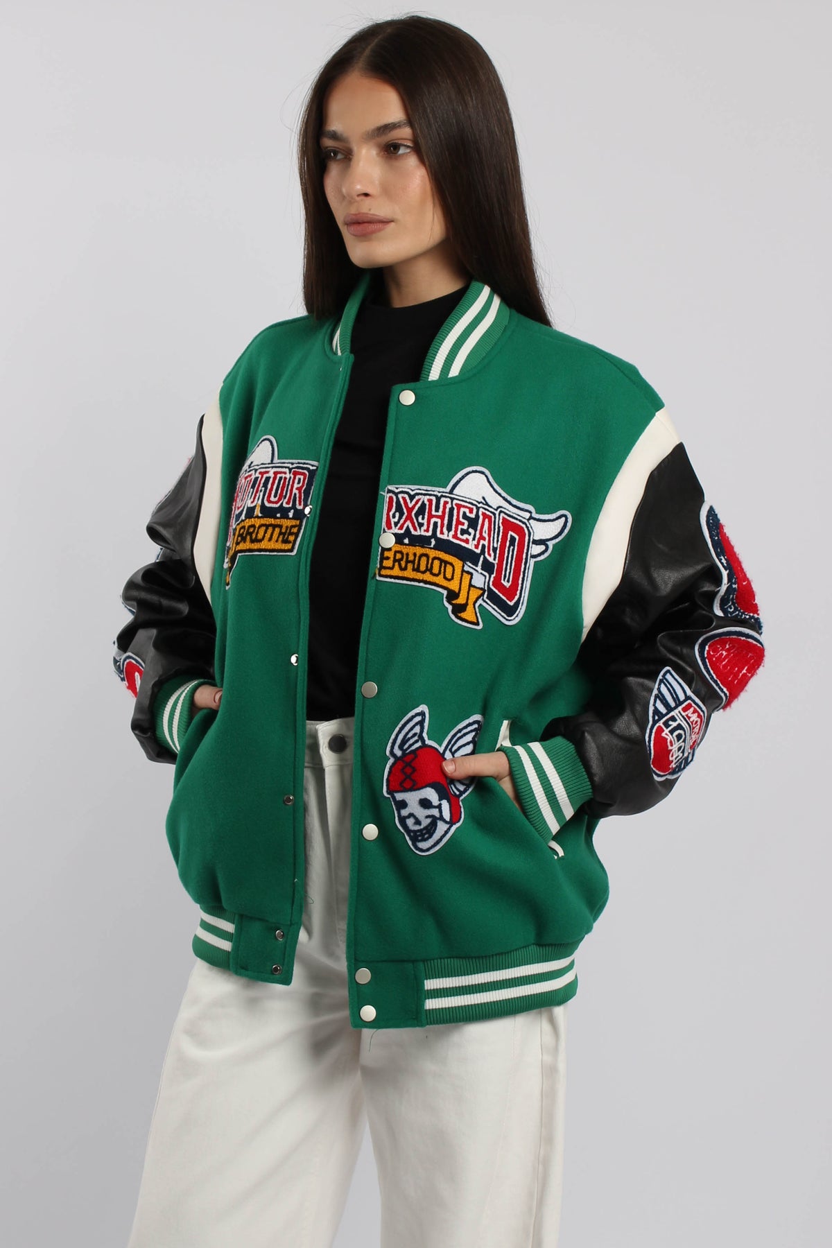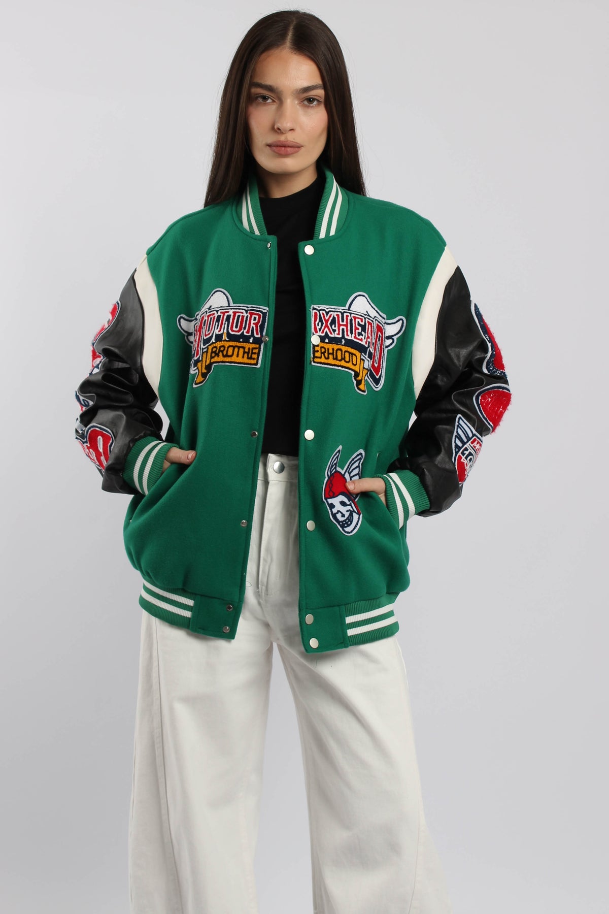 ג׳קט גרין בסגנון ורסיטי עם פאצ׳ים רקומים וסגירת תיקתקים, משלב מראה ספורטיבי עם נוכחות אורבנית בולטת.