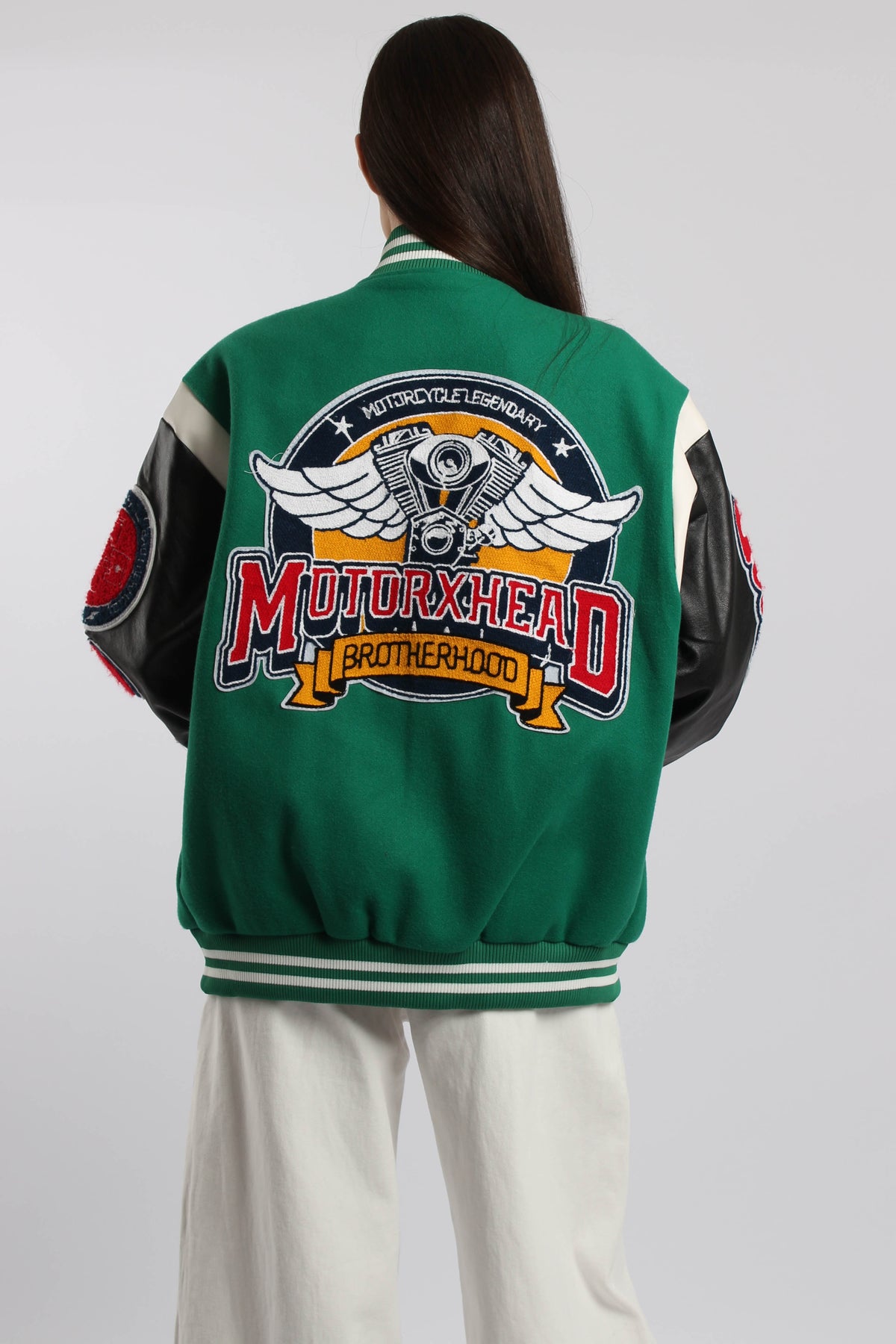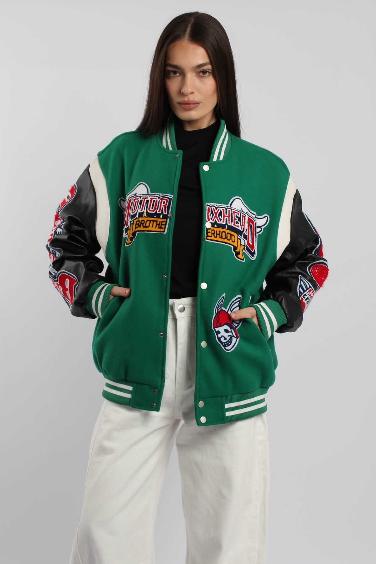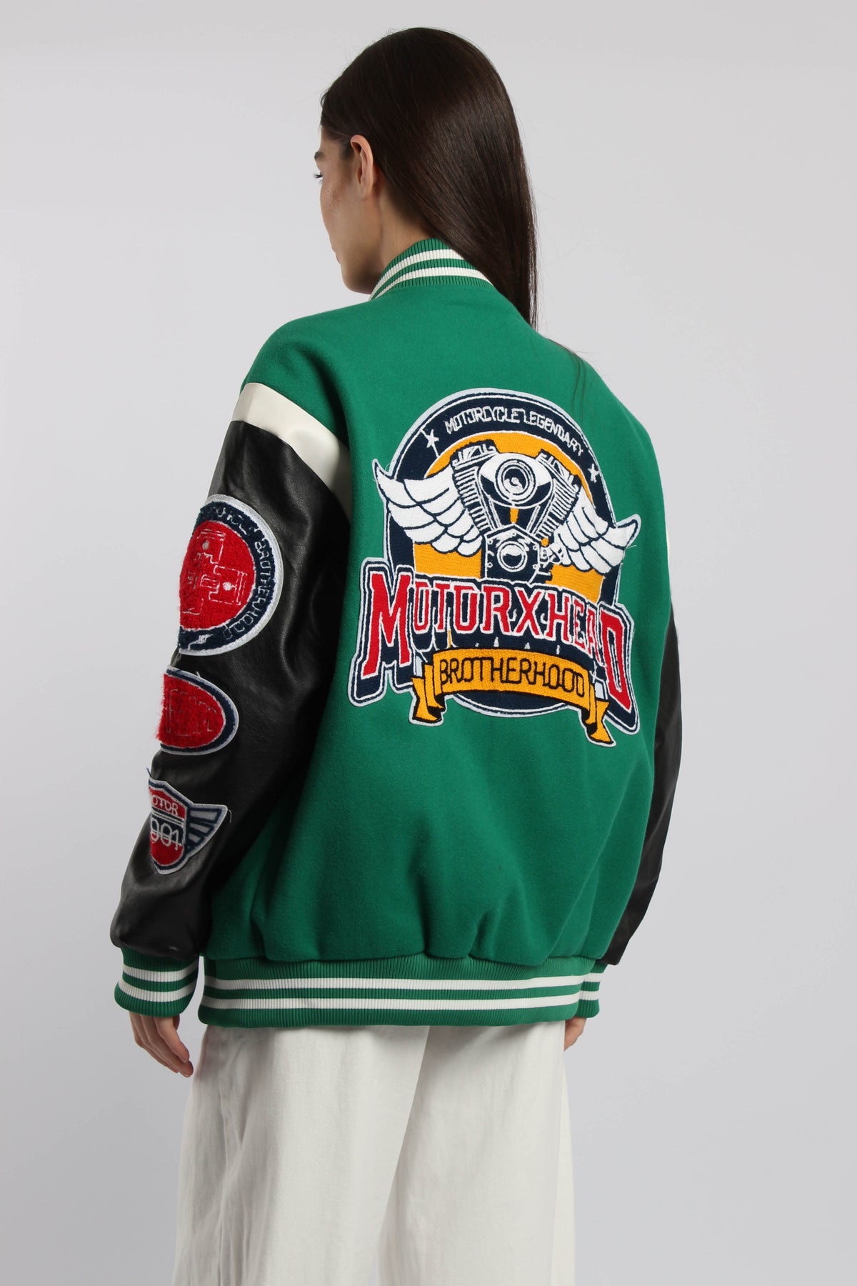 ג׳קט גרין בסגנון ורסיטי עם פאצ׳ים רקומים וסגירת תיקתקים, משלב מראה ספורטיבי עם נוכחות אורבנית בולטת.