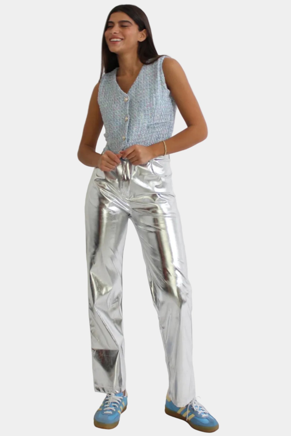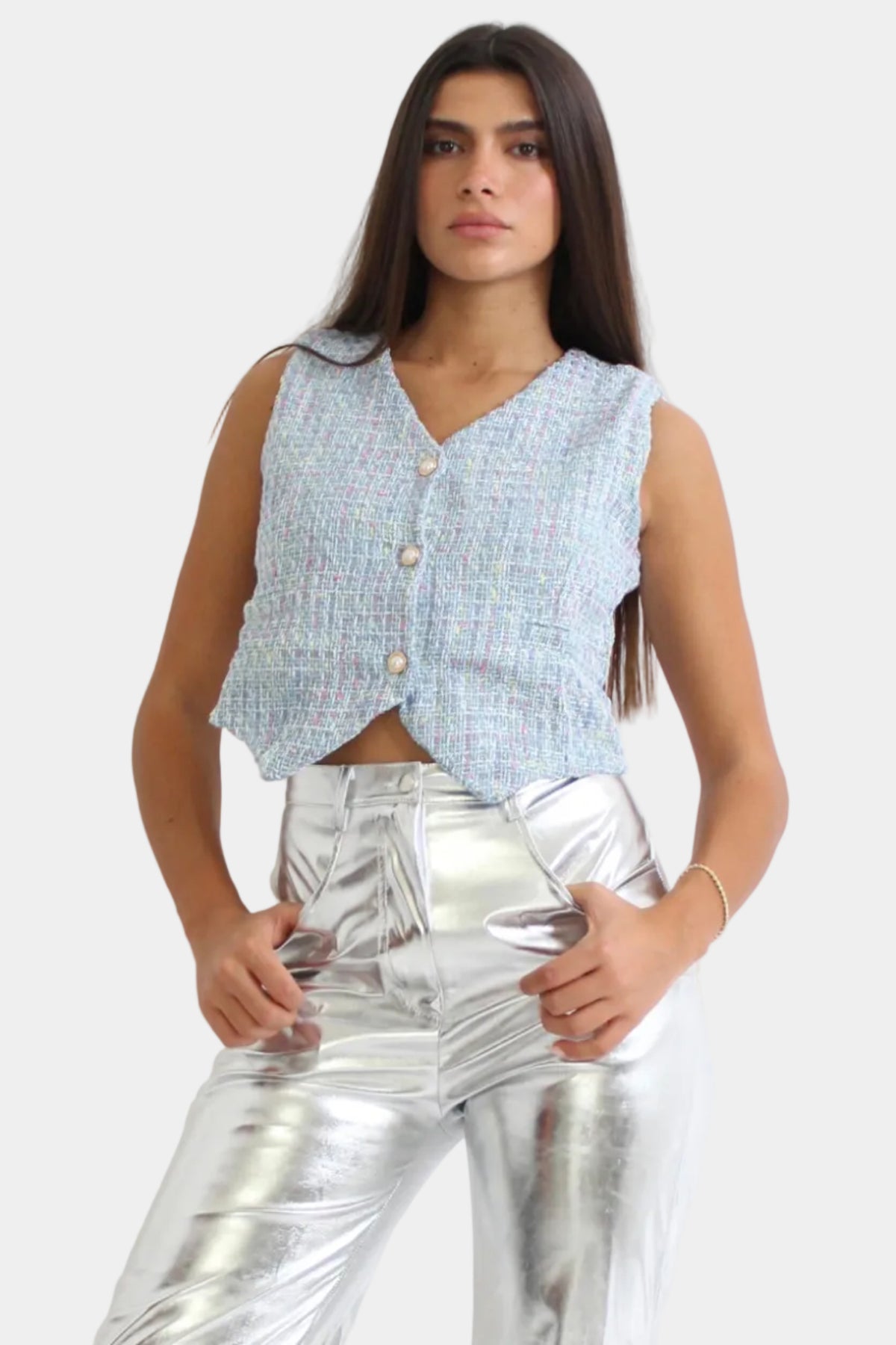 וסט קרופ ללא שרוולים בגזרה מחויטת, בד טוויד עדין עם סגירת כפתורים קדמית ומפתח V.