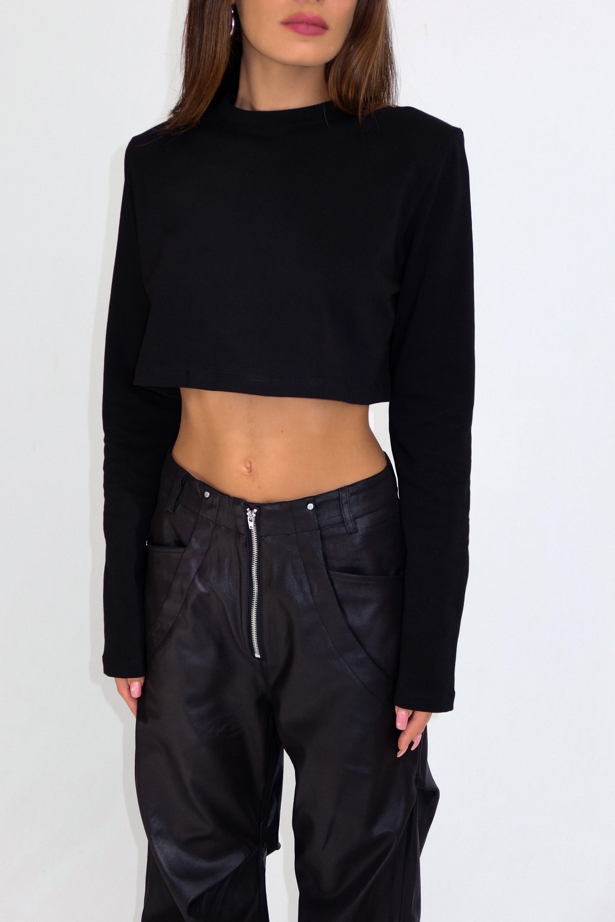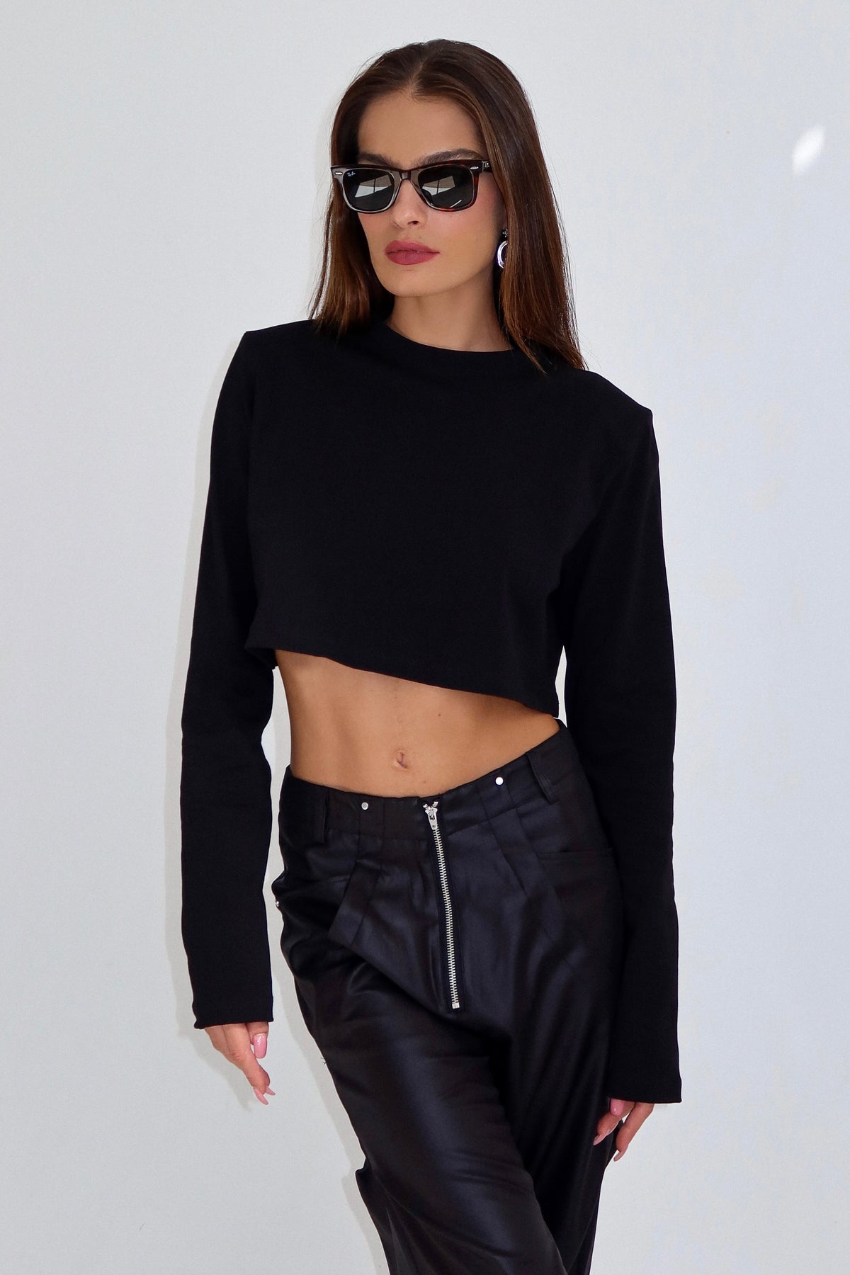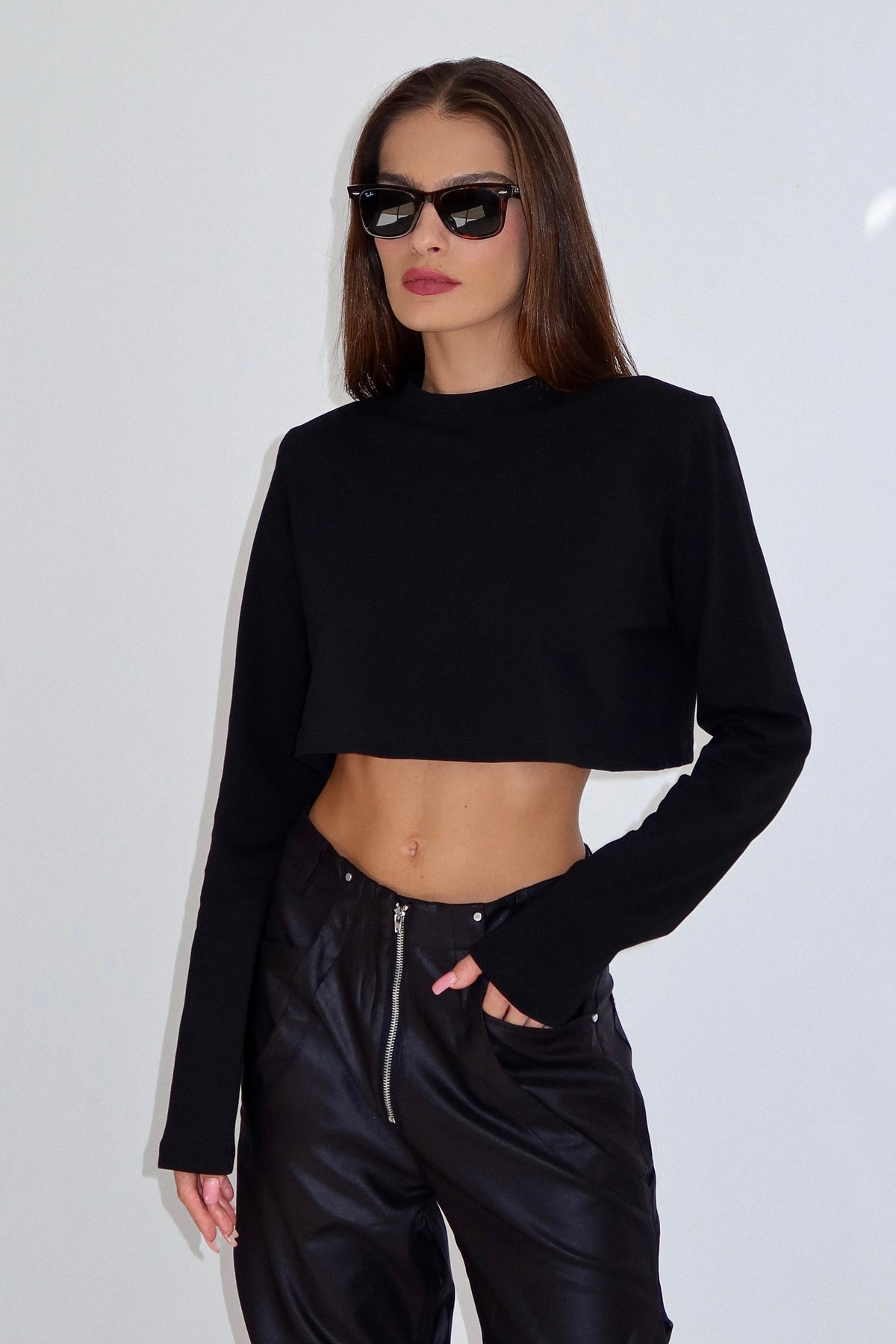 חולצת קרופ בייסיק מטריפה שסוגרת לך פינה עם מפתח צוואר עגול ושרוול ארוך