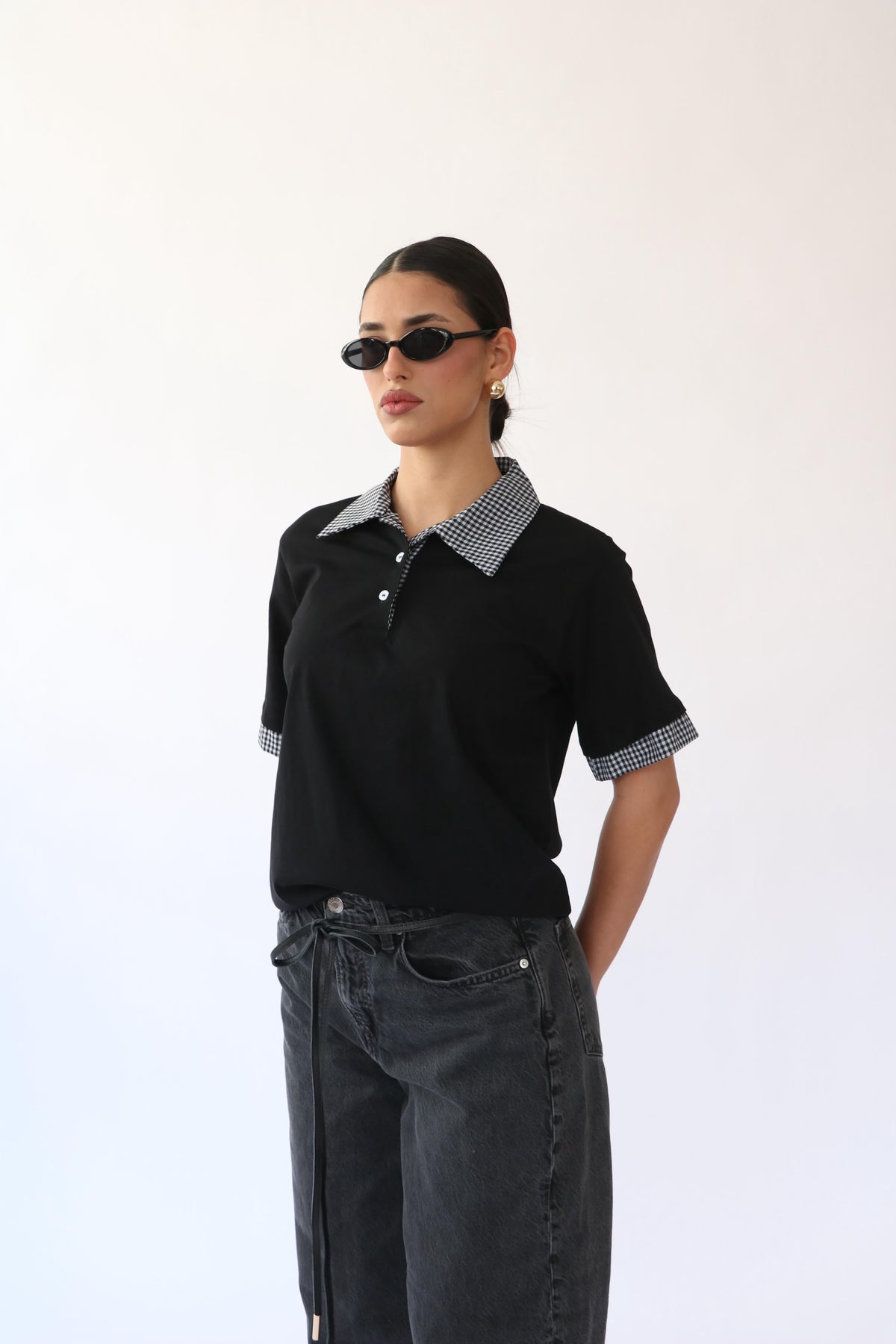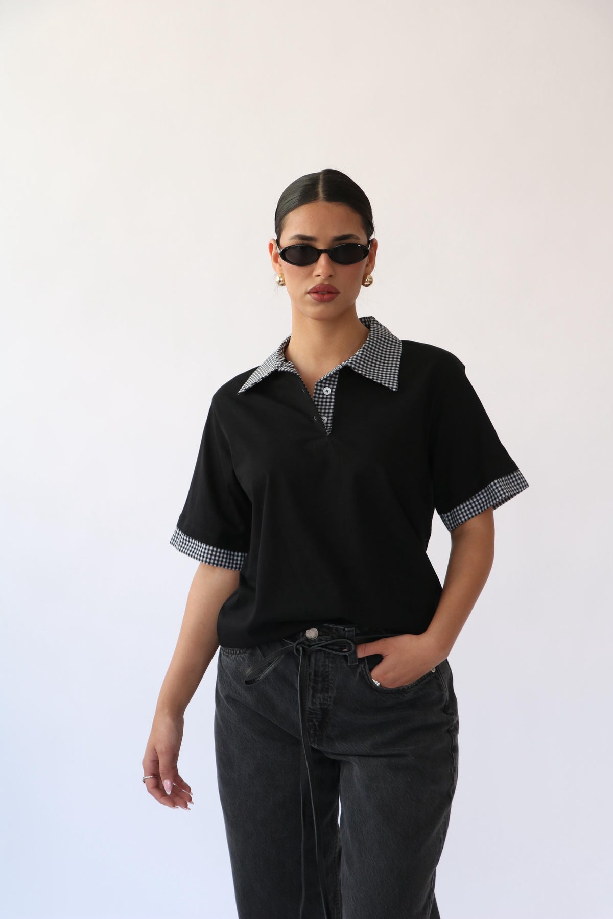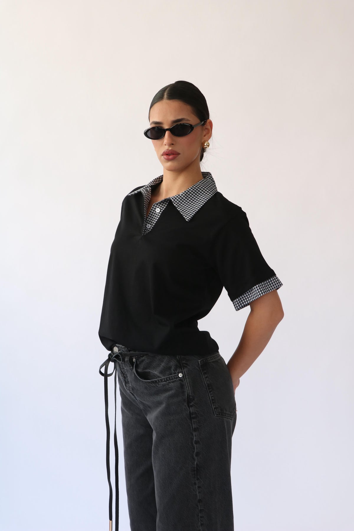 חולצה קצרה עם צווארון, גזרה נקייה ושרוולים קצרים עם סיומת מודגשת ללוק אלגנטי ויומיומי.