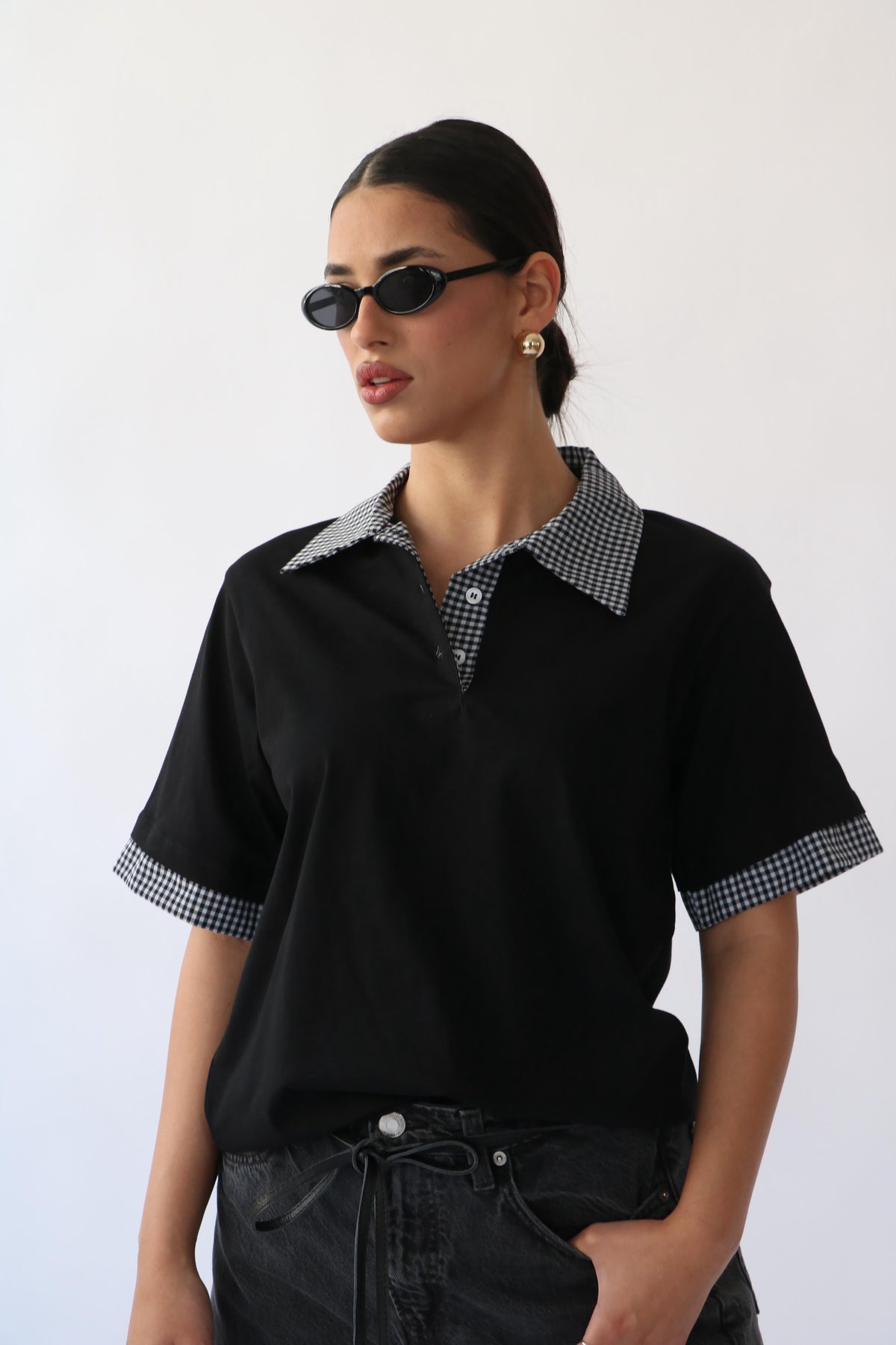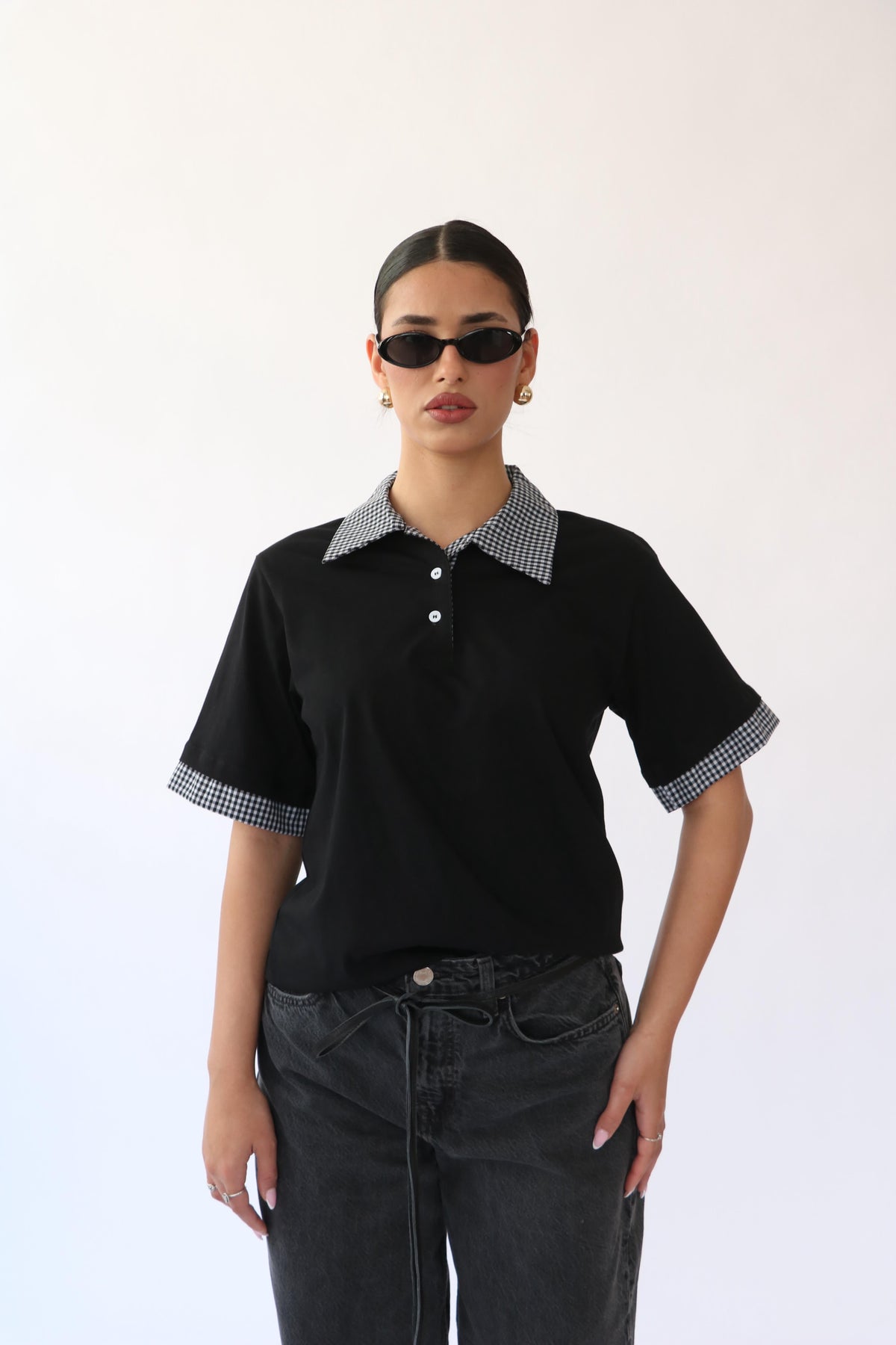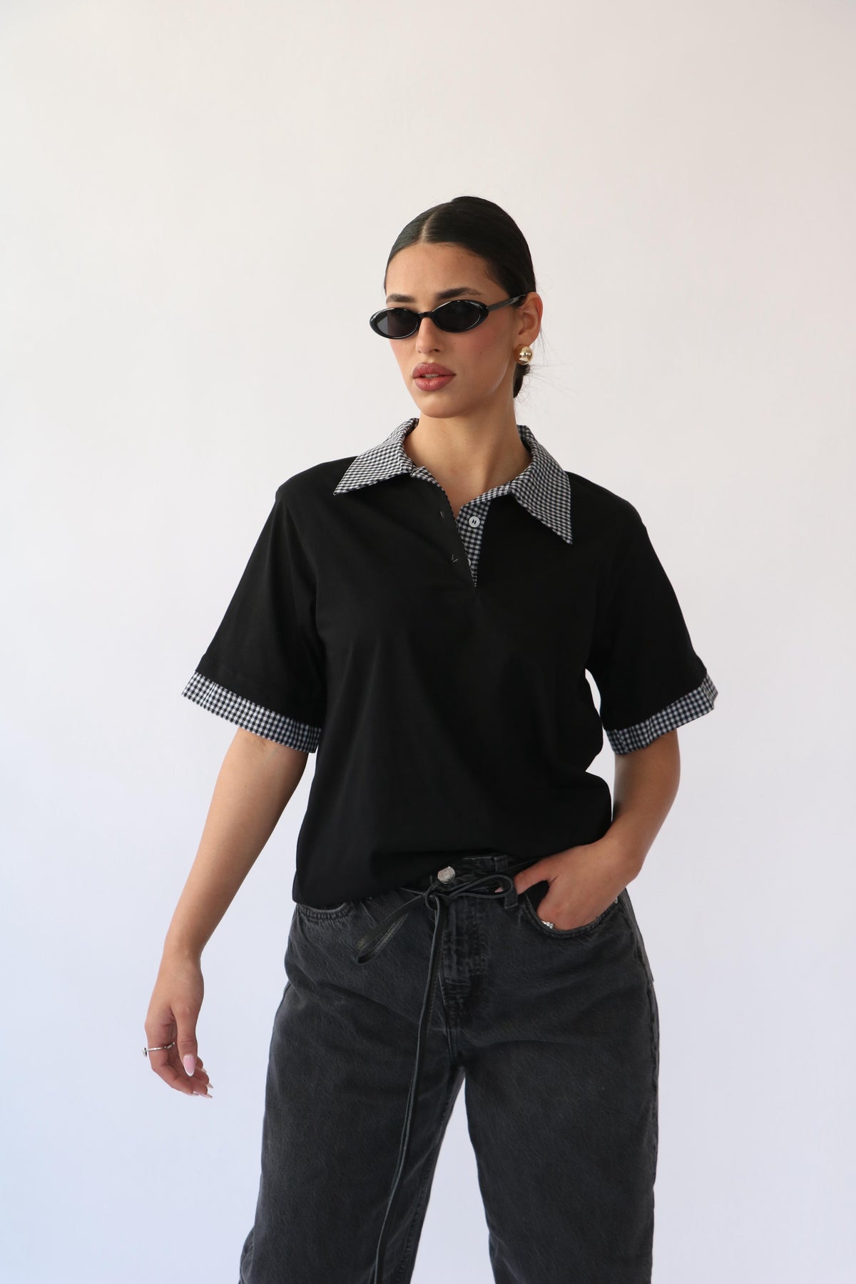 חולצה קצרה עם צווארון, גזרה נקייה ושרוולים קצרים עם סיומת מודגשת ללוק אלגנטי ויומיומי.