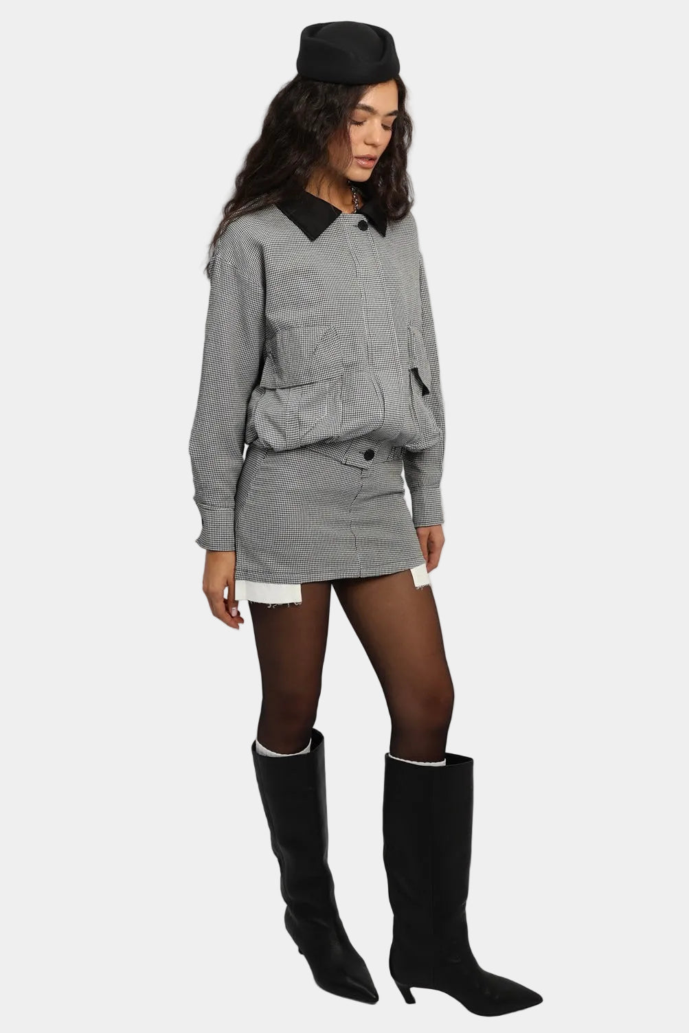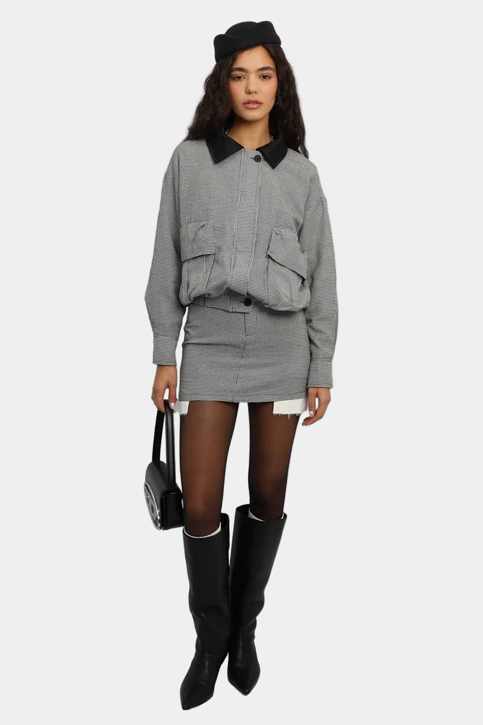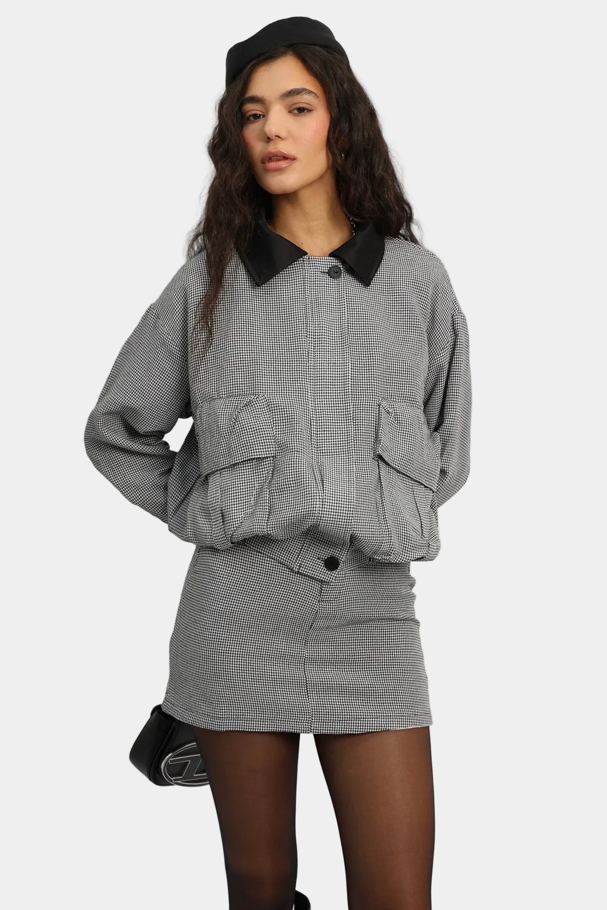 חליפת חצאית בגזרה משוחררת עם ז’קט קצר, כיסים קדמיים וצווארון קונטרסטי.