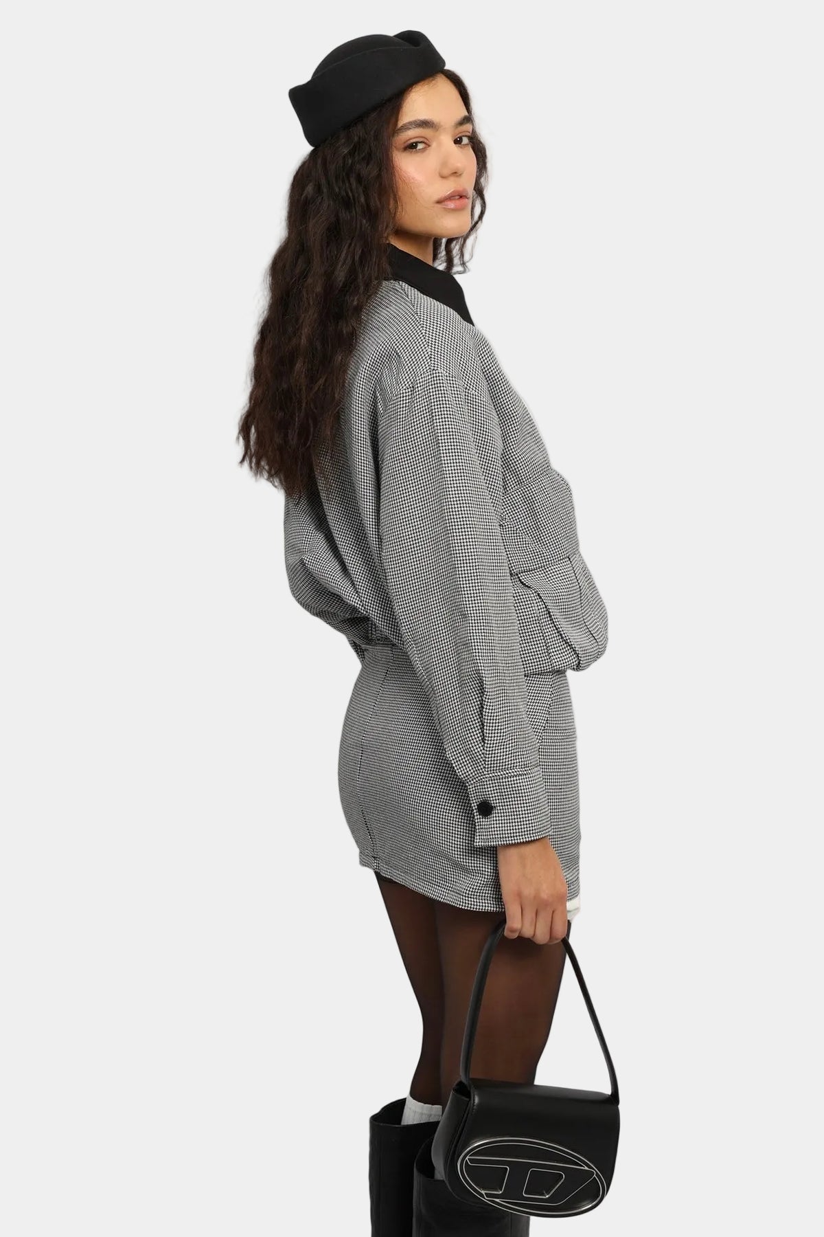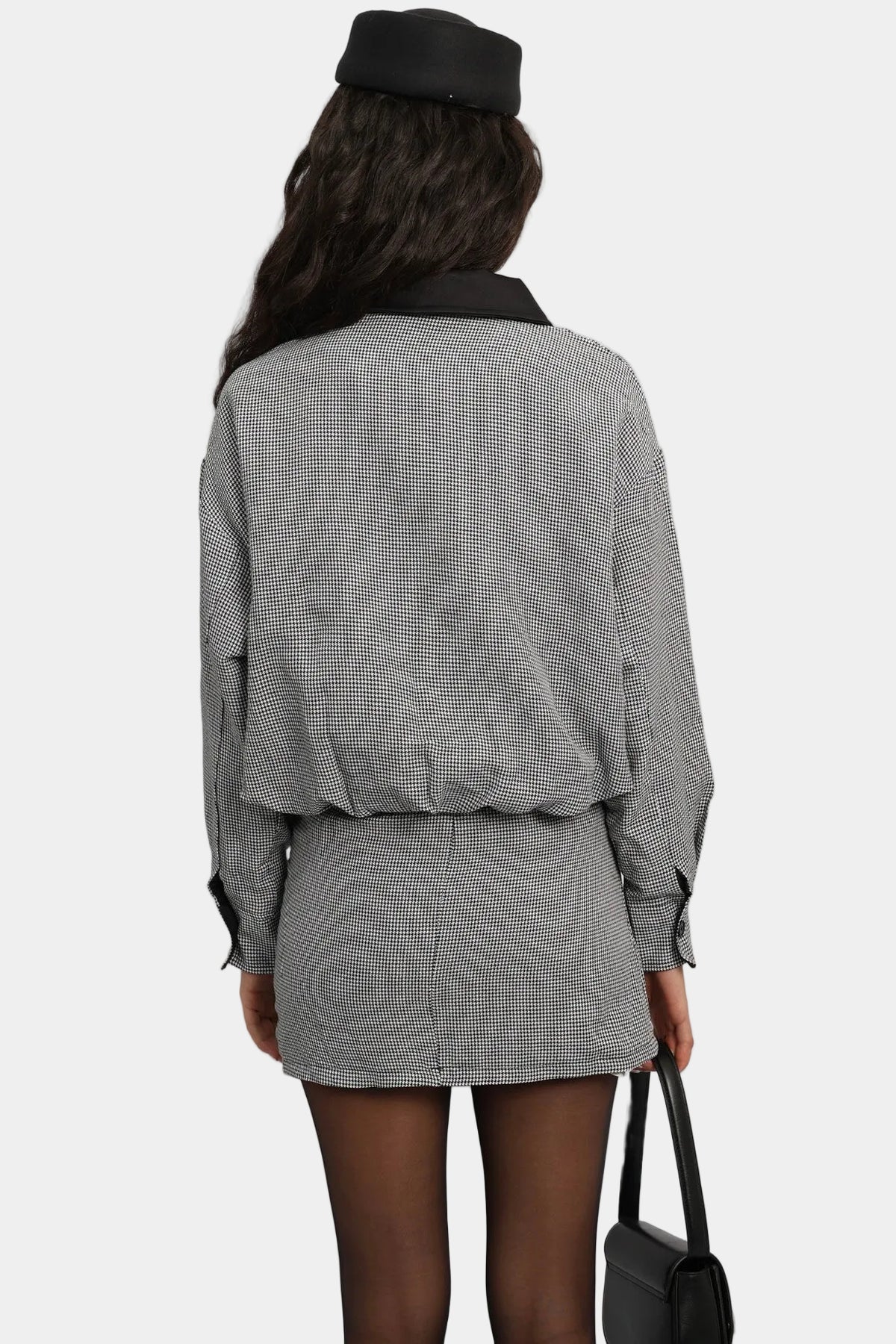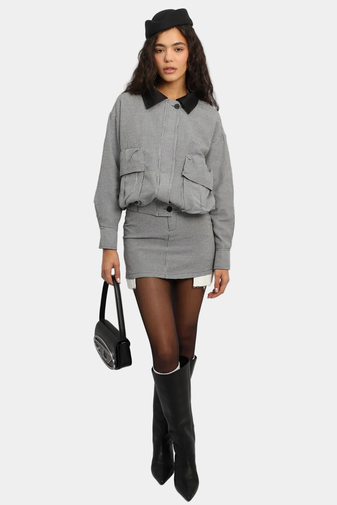 חליפת חצאית בגזרה משוחררת עם ז’קט קצר, כיסים קדמיים וצווארון קונטרסטי.